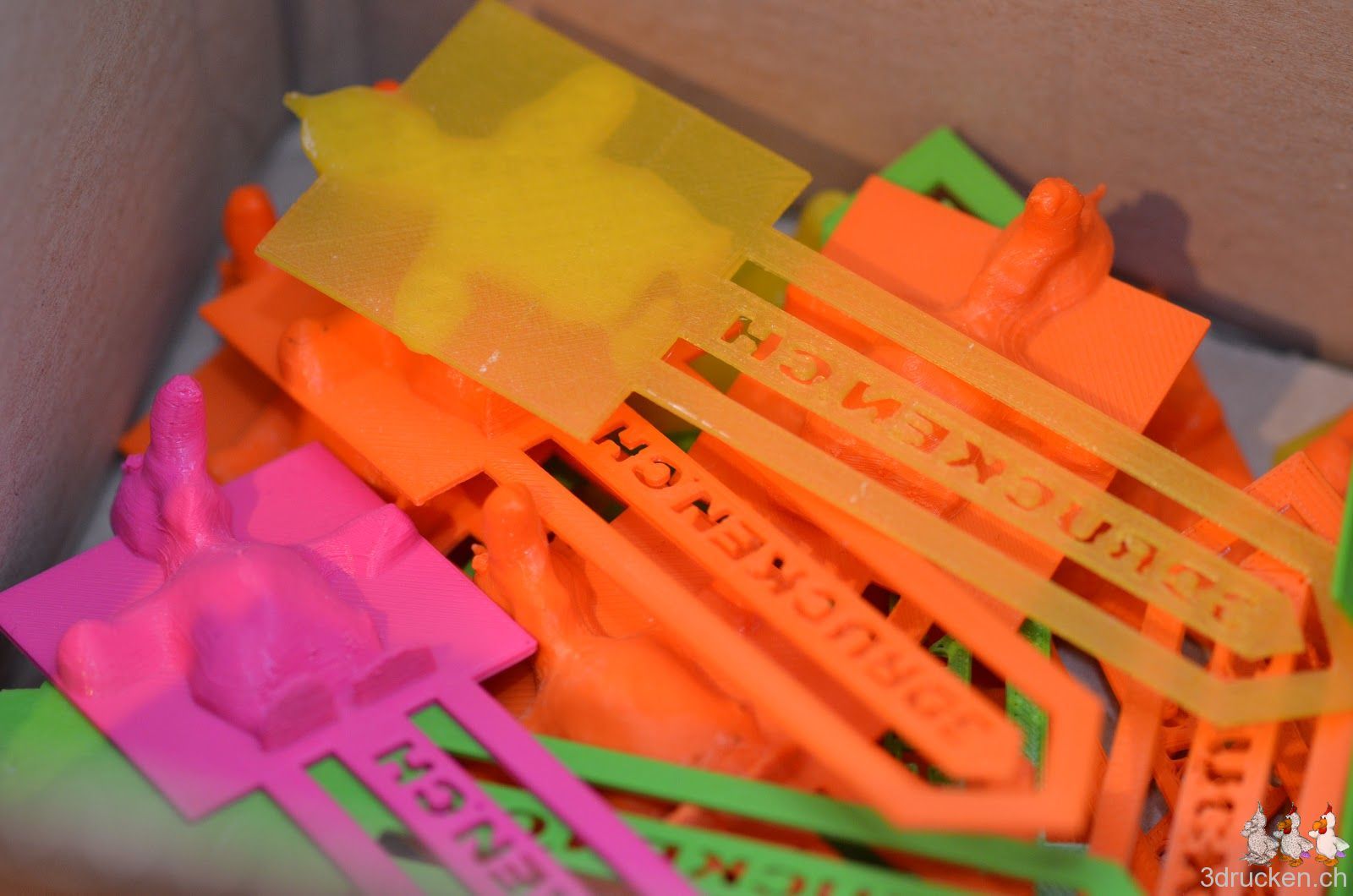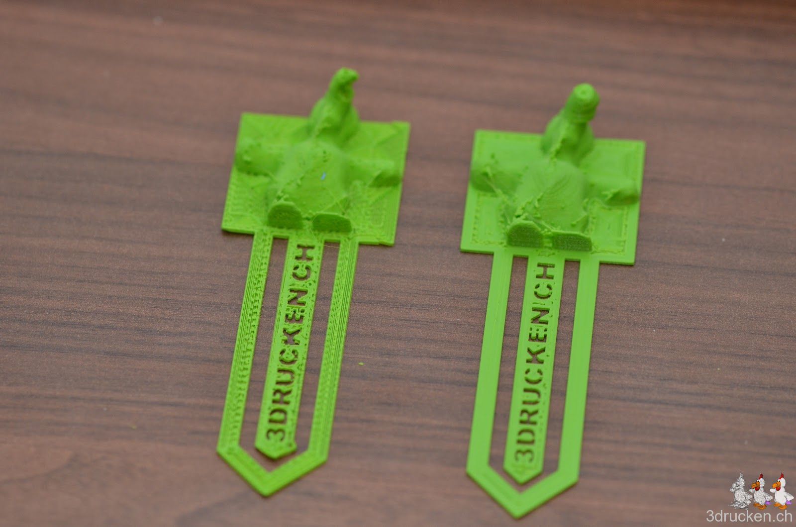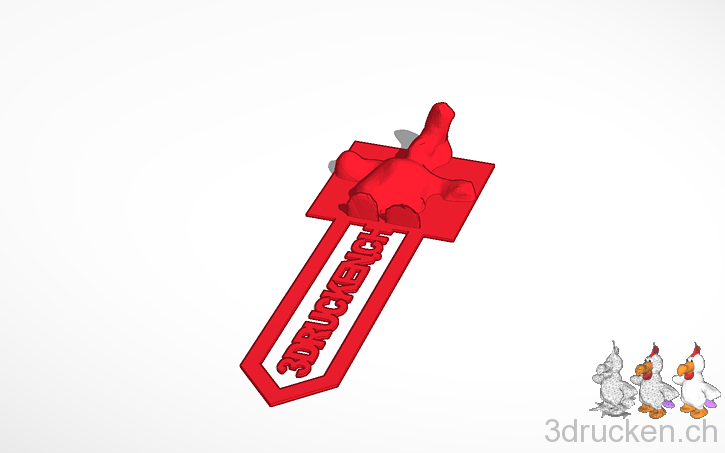 Entworfen haben wir das äusserst schwierig sauber zu druckende Buchzeichen mit Hilfe von Tinkercad, kombiniert mit einem STL-Import des Güggel-Modells.