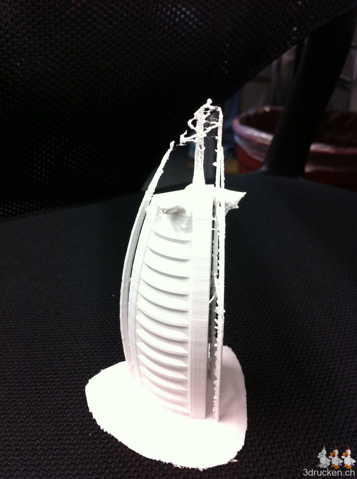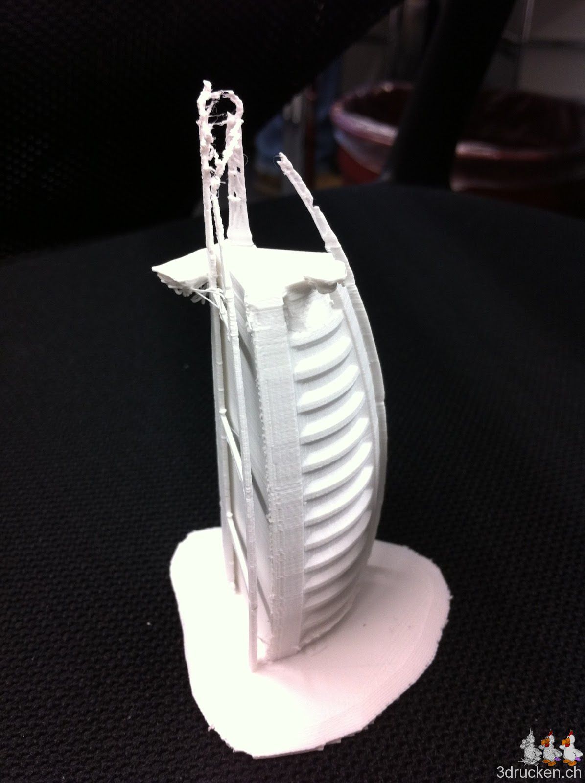 Am Dienstag versuchten wir das Burj al Arab Hotel zu drucken und das für einmal mit 0.1 mm Schichten. Das ganze wurde ohne Support verarbeitet. Das Resultat war zweischneidig. Einerseits wurden einzelne Details durch die 0.1 mm Schichten sehr schön gedruckt. Aber andererseits hatte der Ultimaker an einigen Stellen Mühe ohne Support zu drucken.