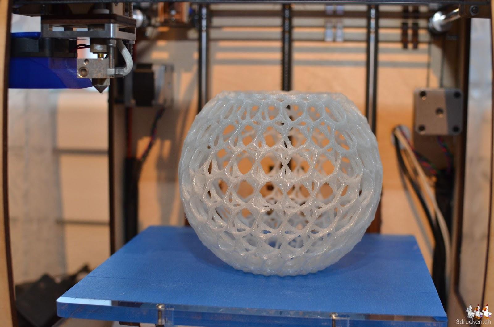 Wir sind inzwischen richtig Fan von @Dizingof Designs geworden und haben uns an der Cells Bowl aus transparentem PLA versucht. Der Druck gelang im ersten Versuch ansprechend. Druckzeit: 13 h 13 min bei 0.2 mm Schichten. Slicen mussten wir auch dieses Modell wiederum mit Cura 13.03 Beta, weil das Slicing in der releasten Version von 13.03 bei komplexen Modellen nicht funktioniert. Gedruckt von SD-Karte, da OctoPrint sich nicht so gut mit grossen gcode-Dateien versteht.