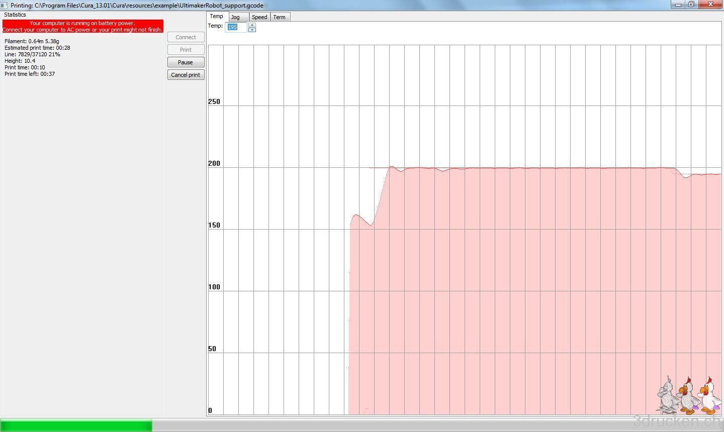 Nach dem Firmware-Update des zweiten Ultimakers auf Version 13.01 RC1 Basic vom 10. Jan. 2013, haben wir so aus Spass den Roboter mal via Print-Button in Cura zum Drucker geschickt. Dabei ist uns aufgefallen, dass wir die Temperatur-Probleme beim ersten Ultimaker mit der Anzeige gut verfolgen könnten. Auch schön ist, dass die verbleibende Zeit für den Druck stehts aktualisiert wird, bzw. man im Unterschied zur Anzeige beim Ulticontroller so besser sieht, wie lange der Druck überhaupt dauern sollte.