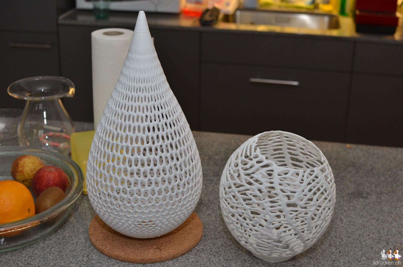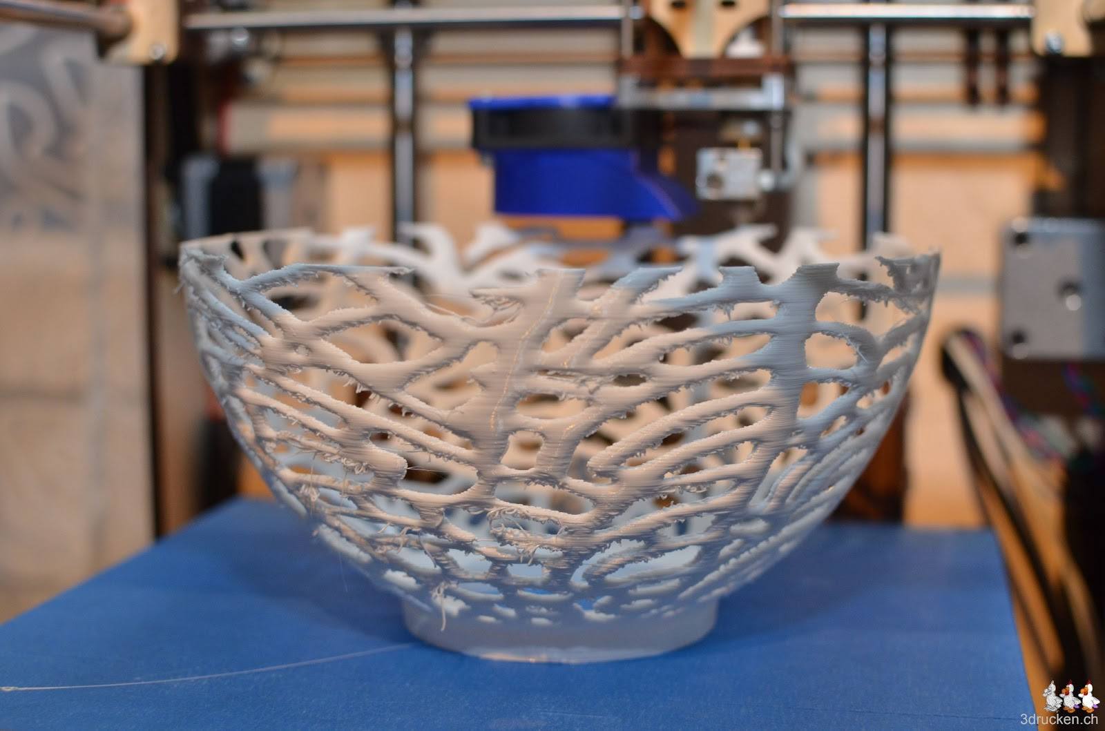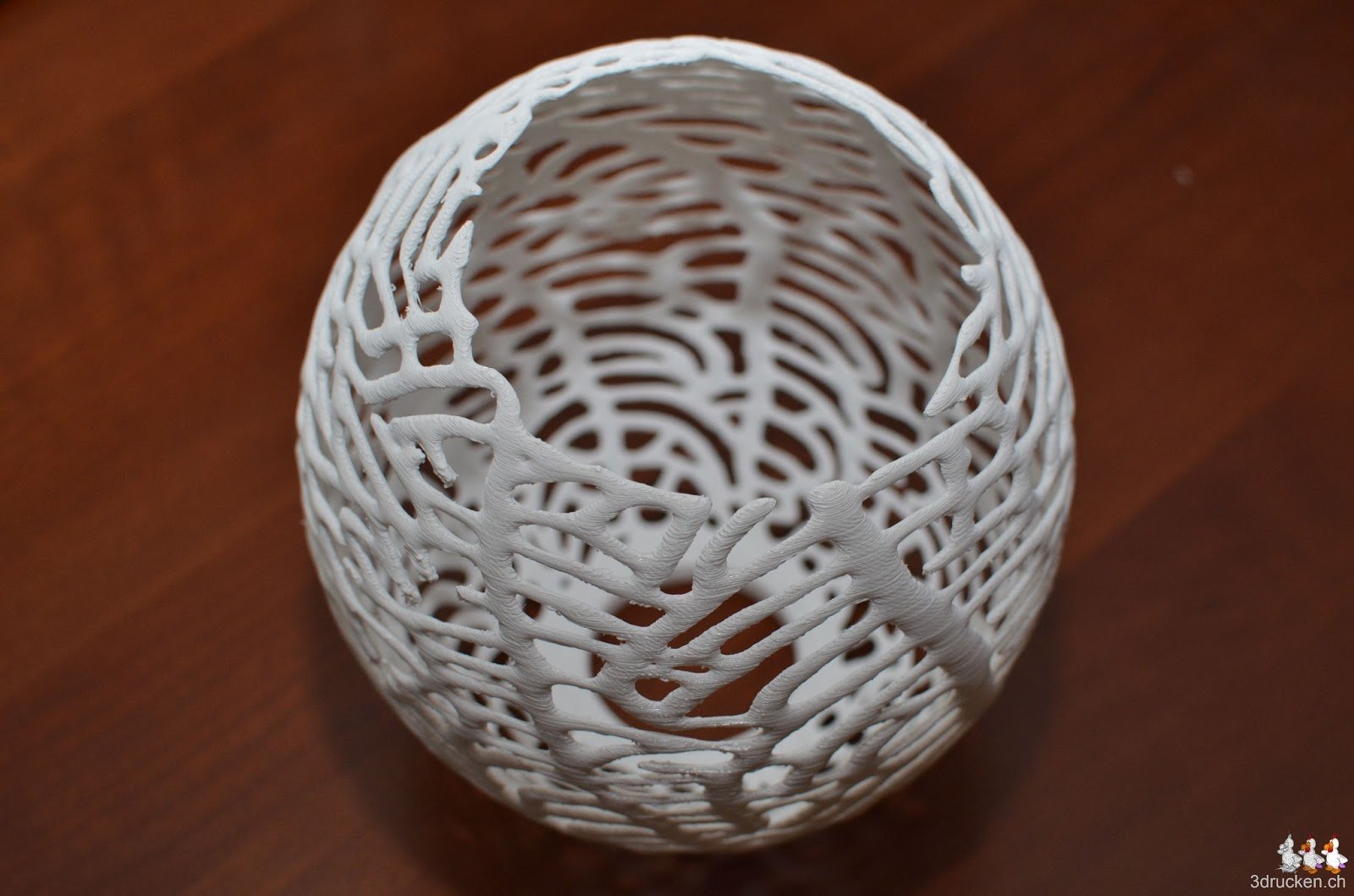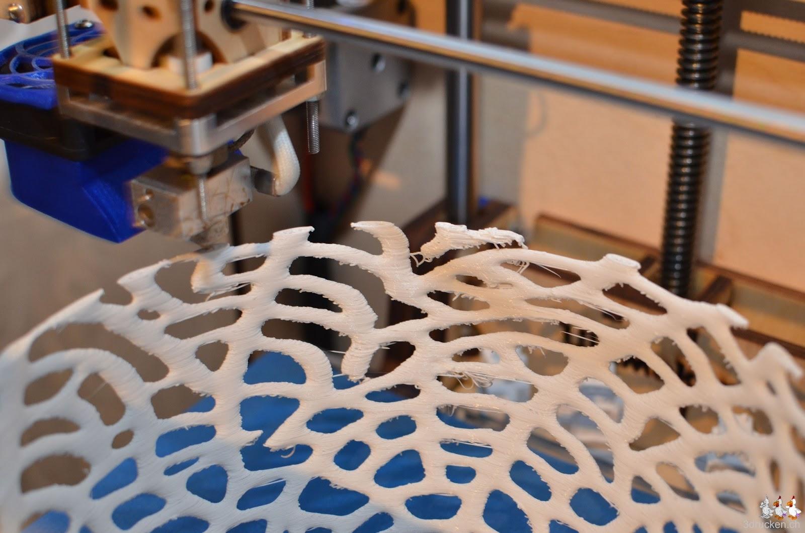 Der Ultimaker läuft immer noch sehr zuverlässig. So haben wir in 13 h 18 min den Corall Wall Lamp Shade von @Dizingof gedruckt. Geslicet mit Cura 13.03 in 0.2 mm Schichten und 20 % Füllung bei 100 % Grösse. Gewicht 98 Gramm. Leider mussten wir ziemlich viel Nacharbeiten, da einige Teile ohne Support frei hängend gedruckt wurden. Wir stellen zudem fest: Wir brauchen endlich sowas wie einen Dremel.