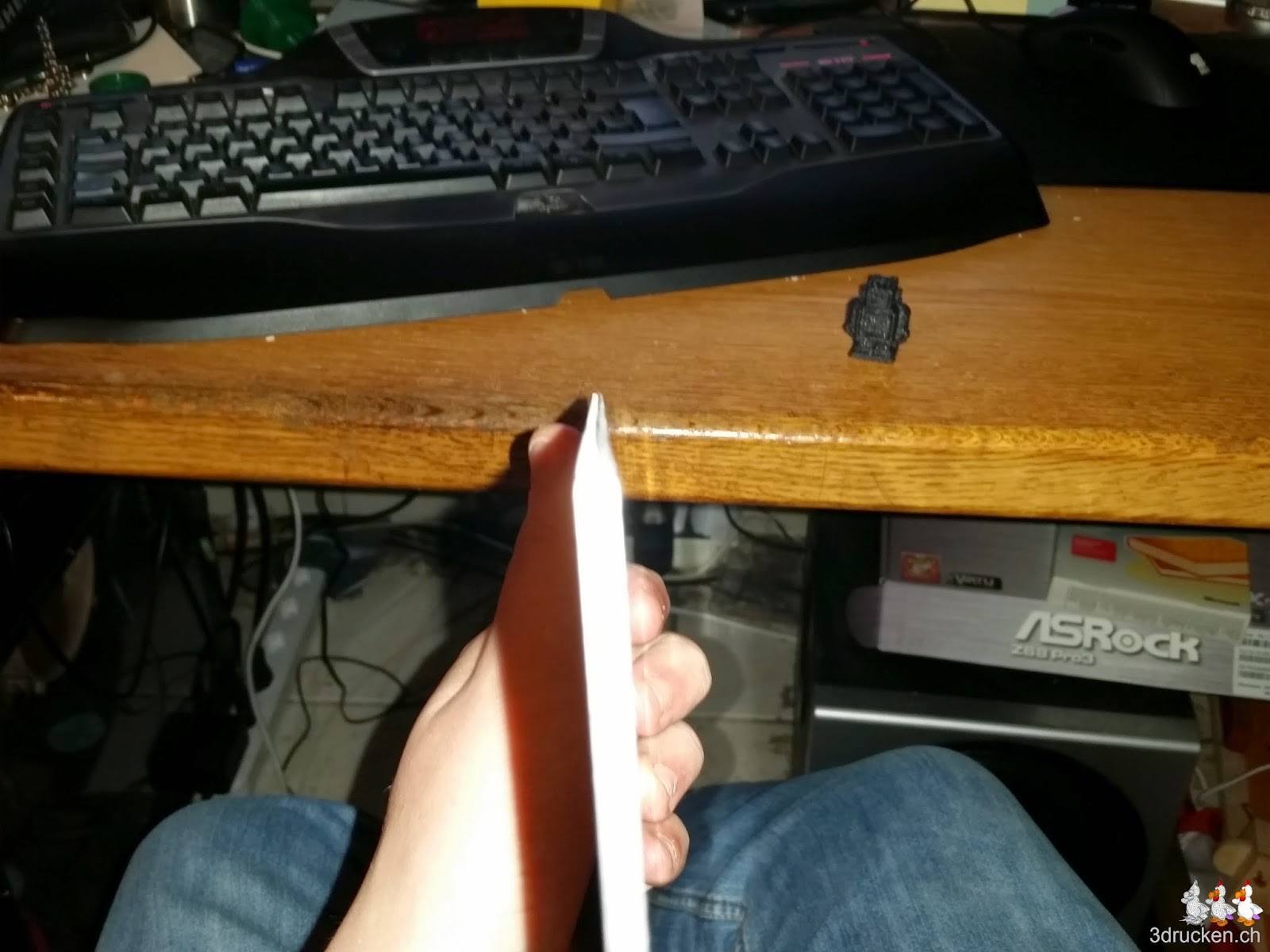 Was aber beim Ausrichten des Betts aufgefallen ist, dass die Druckplatte verzogen ist. Also erstmal von Hand etwas gerichtet, wirklich befriedigend war es dann trotzdem nicht. Schnell wurde klar, dass wir die Druckplatte wohl gegen eine Spiegelfliese tauschen werden. Fürs erste reicht die Aluplatte aber noch.