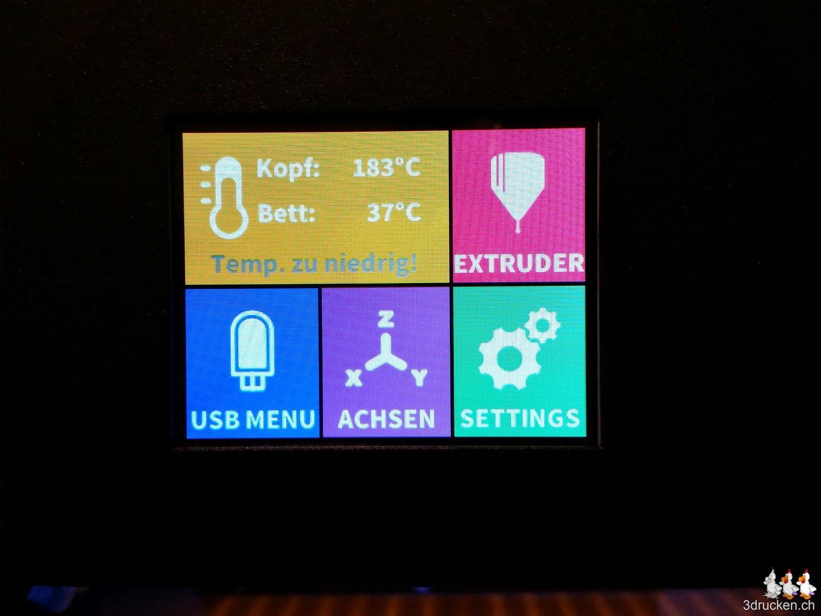 Wie der CraftBot ankommt und wie man ihn entpackt erwähnen wir hier nicht weiter, dafür gibt es auf Youtube unzählige Videos. Beim ersten Einschalten lächelt uns das Farbenfrohe Menü an, welches sich gut mit dem Finger bedienen lässt. Das Menü ist auch in Deutscher Sprache verfügbar, einzig die Umlaute werden noch nicht ganz richtig angezeigt.