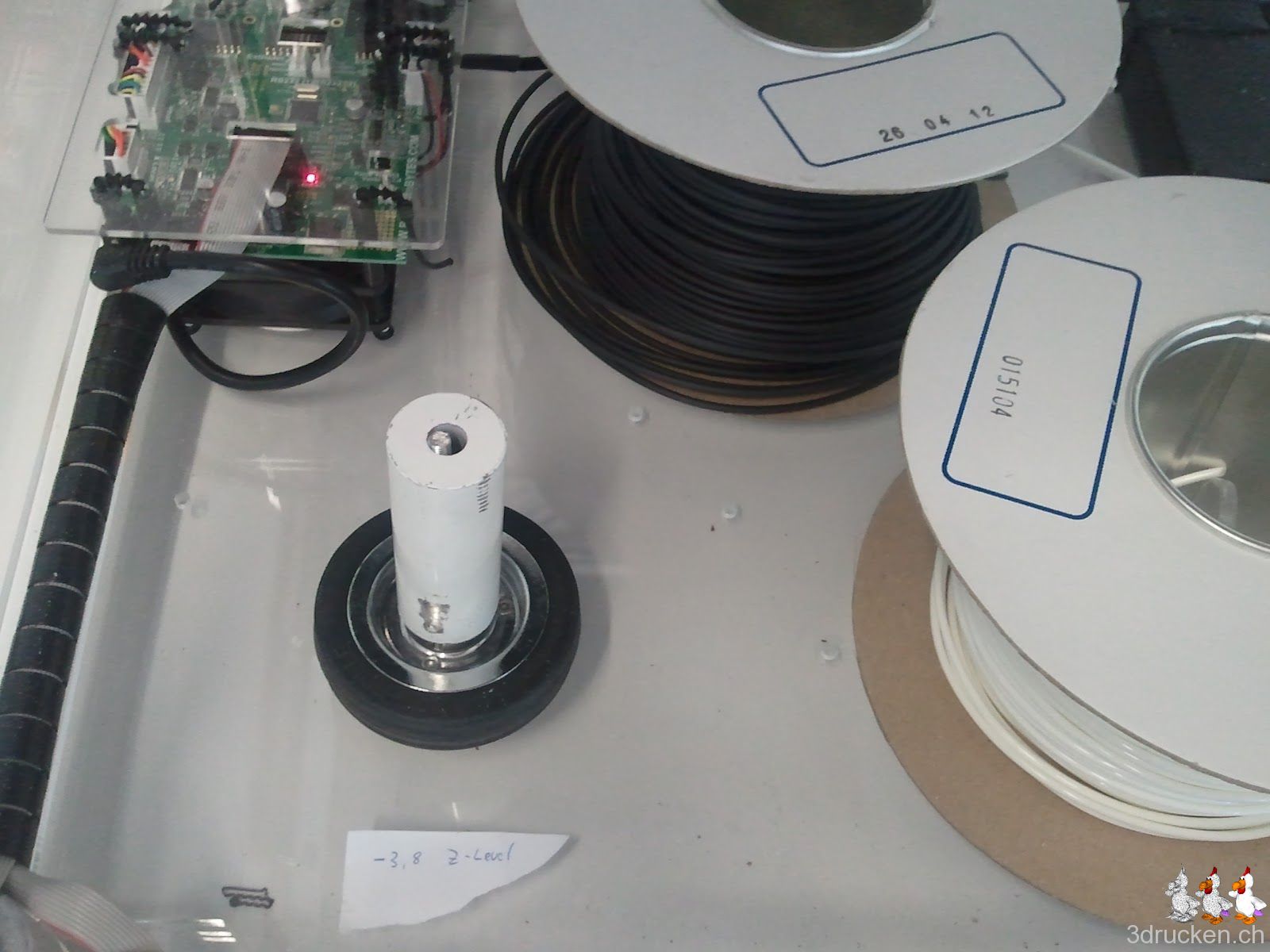 Heute wollten wir mal in einer anderen Farbe drucken, und haben deshalb das PLA von der blauen Rolle in den Druckkopf montiert. Nach kurzer Zeit hat sich das Material aber irgendwie im Druckkopf festgefressen, und es läuft nicht mehr unten raus. An der eigenen Halterung der Rolle, und auch am Nachziehen kanns nicht liegen. Irgendwann kommt unten einfach nichts mehr zum Druckkopf raus.