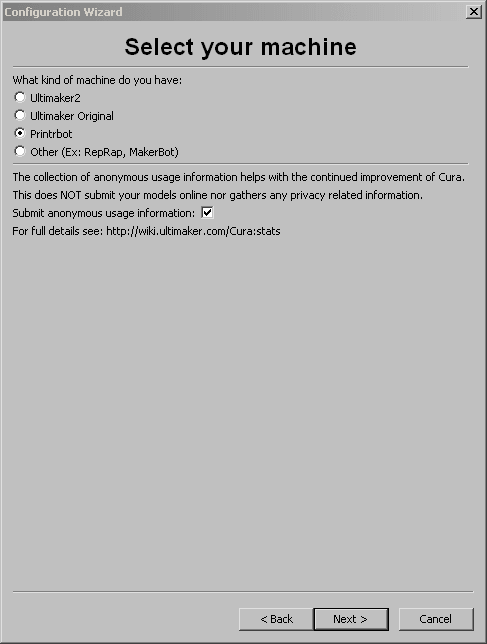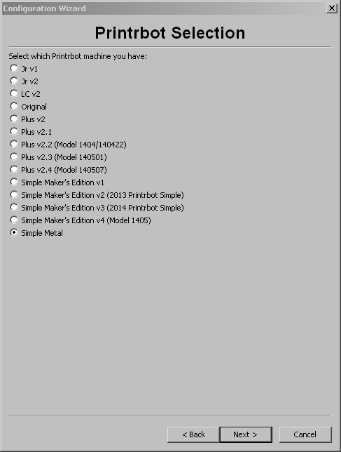 Im „Add new machine wizard“ Printrbot als Drucker, danach Modell Simple Metal auswählen.
