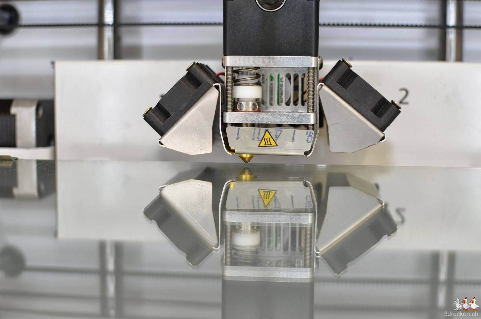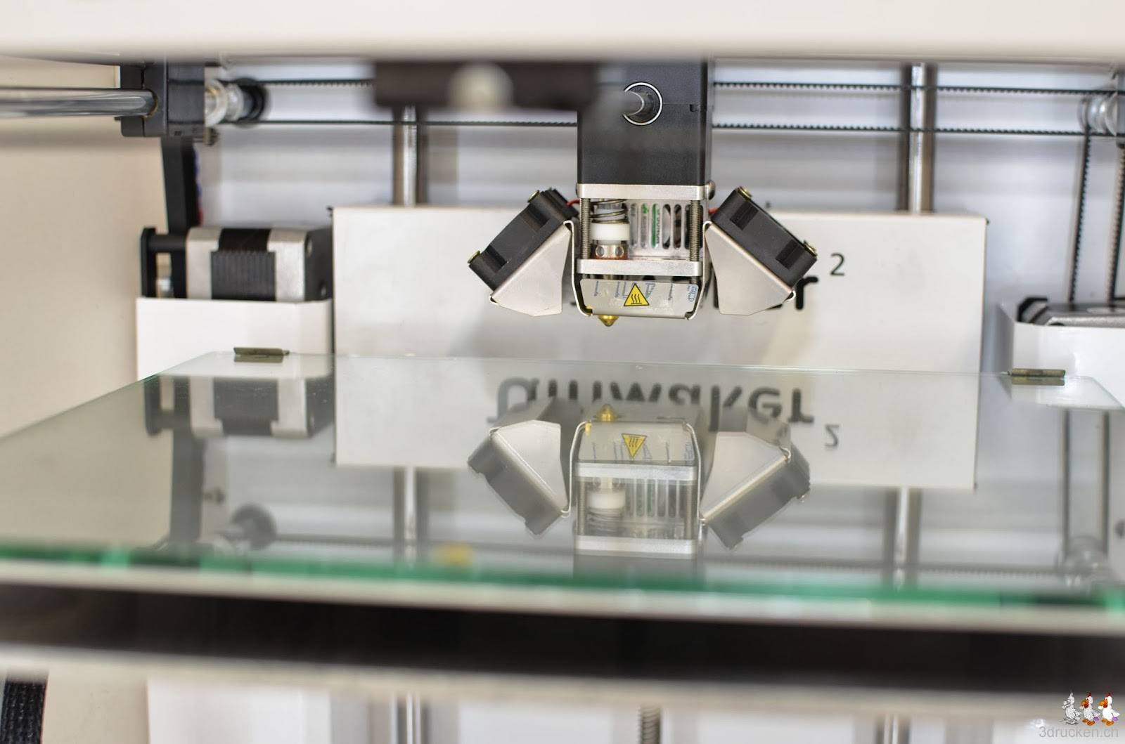 Erstes Mal einschalten: Der First Run Wizzard ist nun direkt in der Firmware des Druckers integriert und wird beim ersten Einschalten automatisch ausgeführt. Als Erstes wird dabei der Drucktisch in der Höhe ausgerichtet. Leider wird zuvor nirgends beschrieben, wie man die Glasplatte auf dem Drucktisch montieren soll. Wir versuchen das mal ohne Anleitung – geschafft. Ist nicht schwer, aber für Anfänger wäre eine Anleitung, welche einen solch wichtigen Schritt nicht auslässt wichtig. Glasplatte aus der Blubberfolie, Metallklammern vorne am Tisch ganz ausdrehen, Glasplatte leicht schräg und vorsichtig in den Drucker hineinführen. Die Glasplatte in die hinteren Metallklammern hineinschieben, danach die vorderen Klammern wieder schliessen.