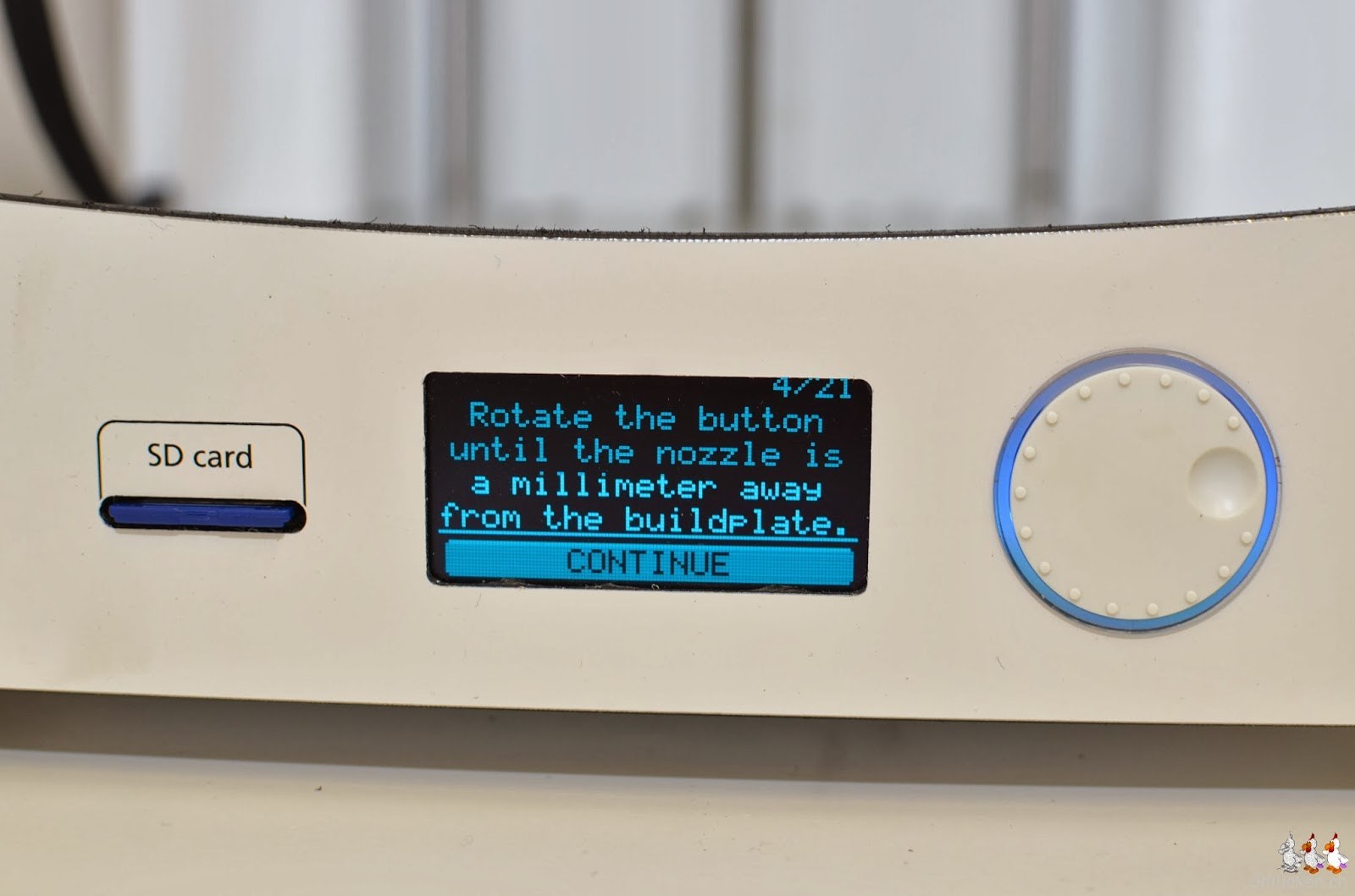 - Die Anleitung zum Ausrichten des Drucktischs ist leider ziemlich verwirrend geschrieben und erinnert uns an die Bauanleitung für den Original Ultimaker. Wir halten uns an die Informationen, welche das schöne, eingebaute Display liefert. Im Schritt 4 von 21 soll man den Tisch mit dem Drehknopf vorne am Drucker bis auf einen Millimeter an die Druckspitze hochfahren. Nur wie viel ist ein Millimeter? Hier wäre eine Positionierungshilfe durch ein weiches Material, welches genau die Stärke 1mm aufweist hilfreich. Ein normales 80g DIN A4-Papier ist ca. 0.1mm dick, wir nehmen mal 10 Blätter davon um ungefähr den 1mm zu erhalten. Was uns hier weiter positiv auffällt ist, dass der Tisch neu nur noch mit drei Schrauben ausgerichtet wird, und nicht mehr mit vier.