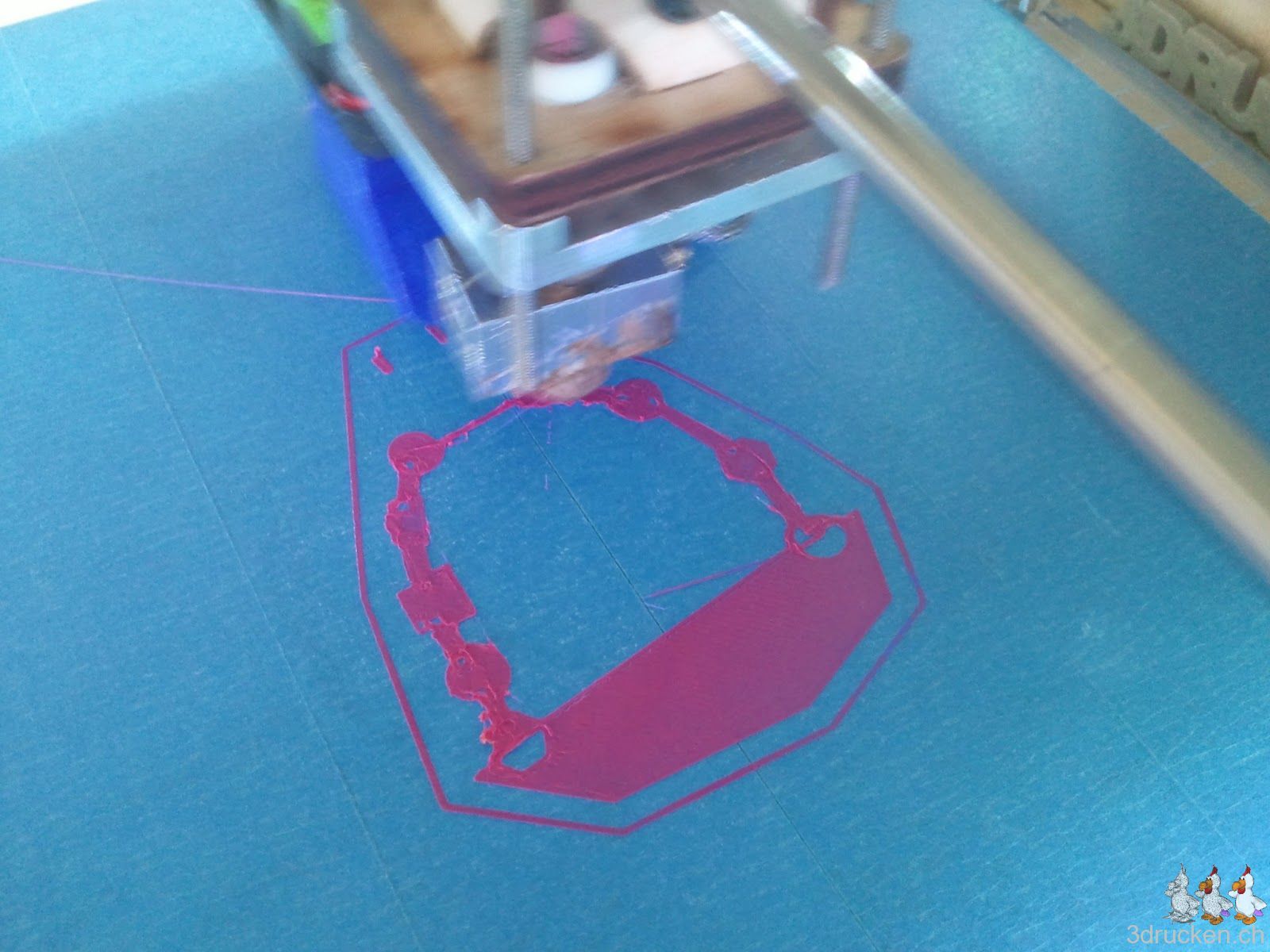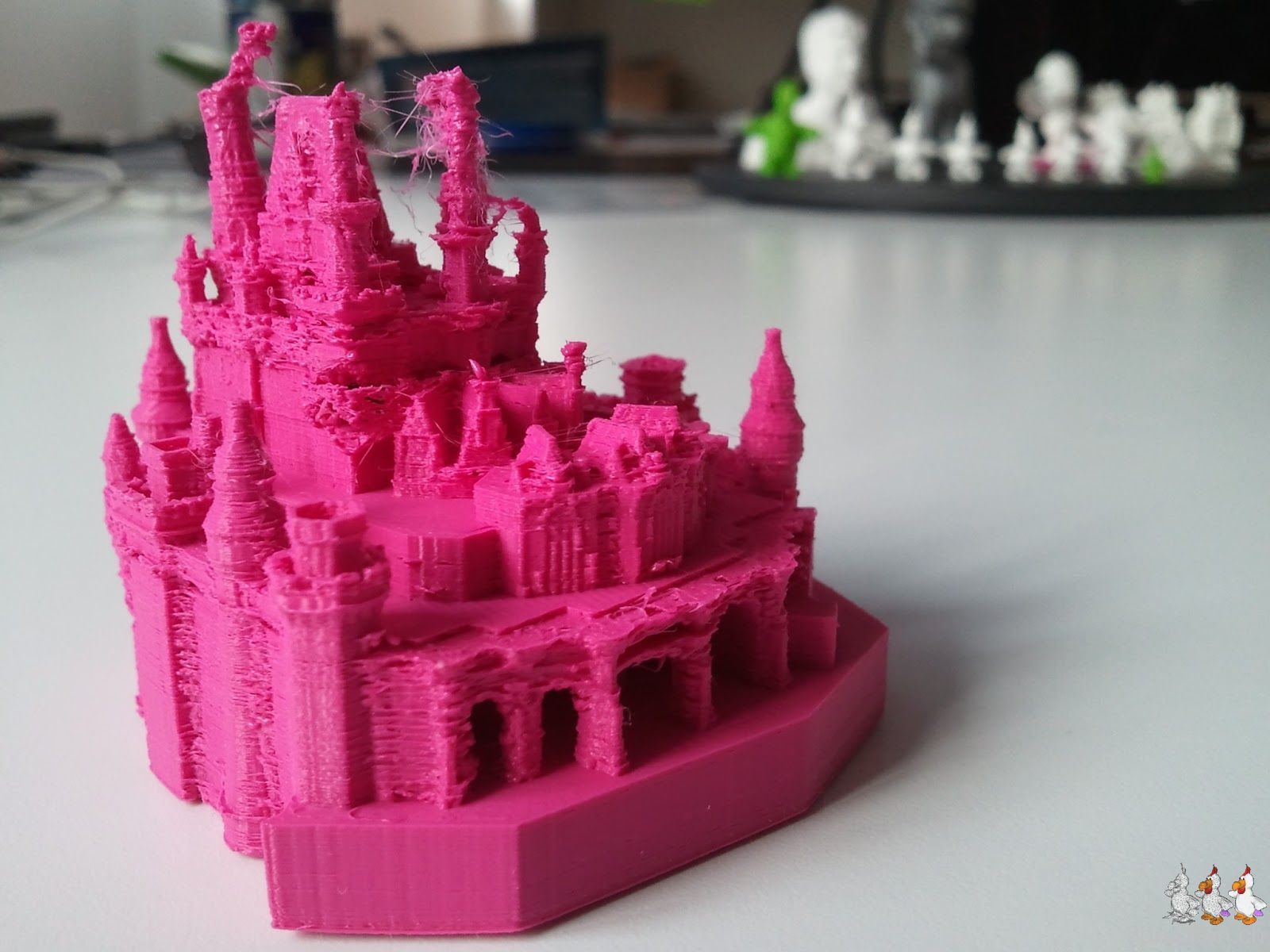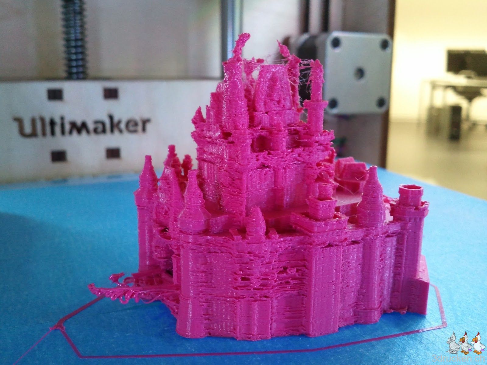 Disney Castle bei Thingiverse runtergeladen und leider nicht gelesen, dass das Modell ursprünglich aus der 3d-galerie von Sketchup stammt. Das Modell hatte ziemlich viele Fehler und die Pfeiler der Brücke beim Eingang hafteten nicht auf dem Drucktisch, da sie zuwenig Auflagefläche hatten. Hinzu kamen erneut Probleme mit dem Materialfluss am ersten Ultimaker. Gedruckt in 0.04 mm Schichten mit 20 % Füllung aus Ultimaker-PLA. Druckzeit 17 h 58 min, Höhe ca. 50 mm, leider ohne die höchsten Türme.