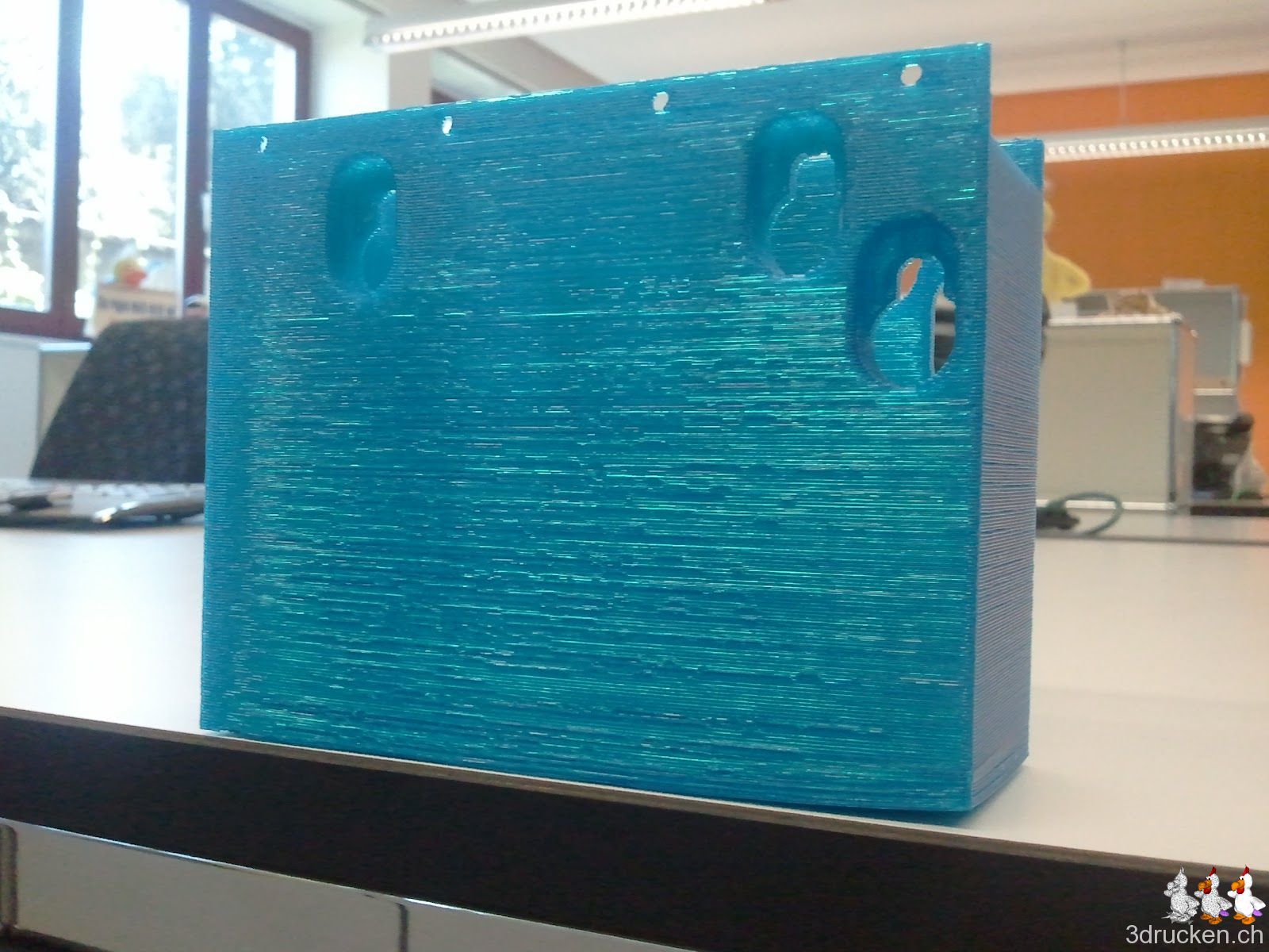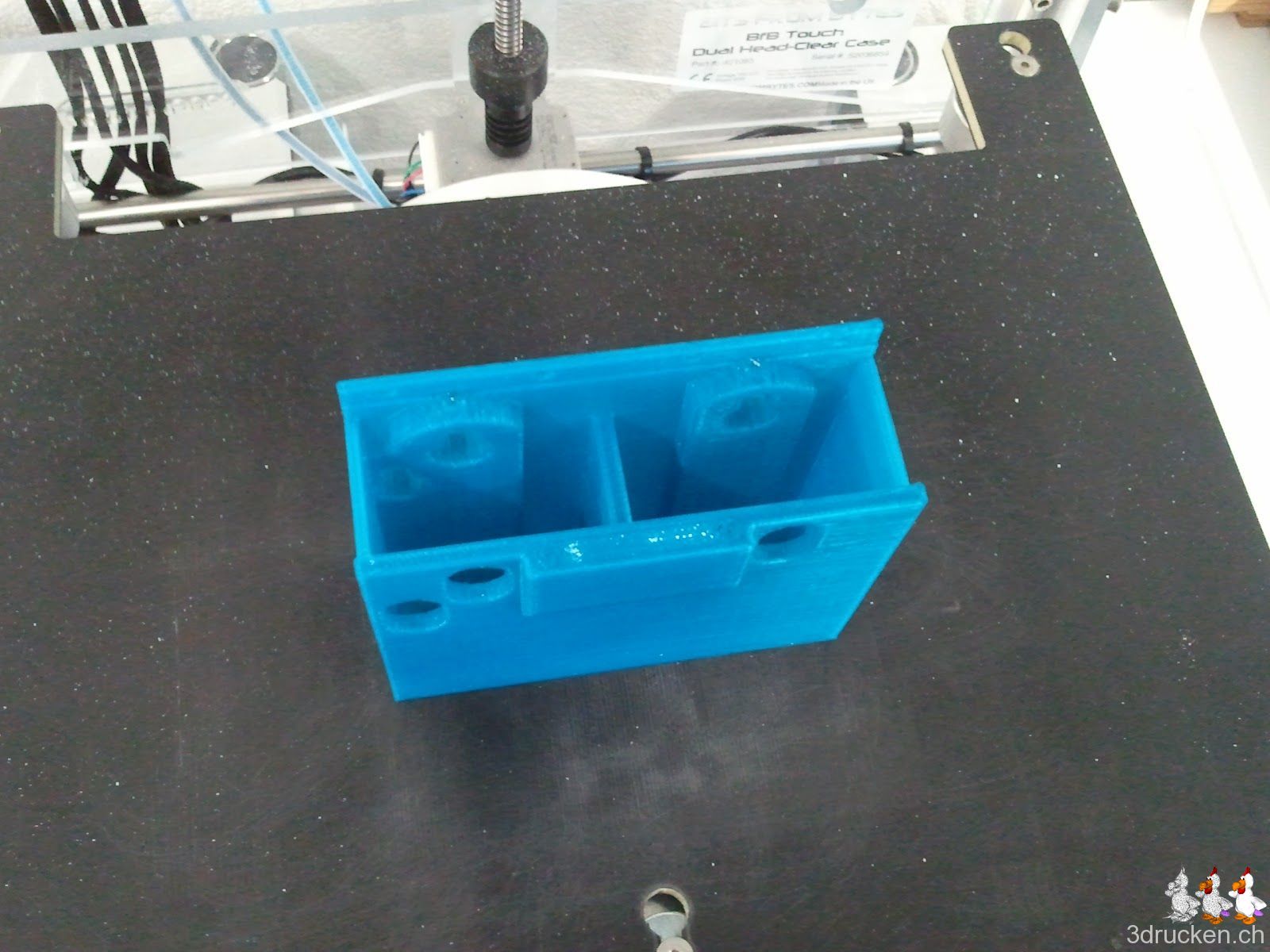Nach einer erneuten Reinigung, und nach kräftigem Vorschub an Material bis kurz vor den Druckauftrag, ist es uns gelungen, den Abstreifbehälter in Version 2 auszudrucken. Und das sogar in dem tollen blauen PLA. Eine Ecke ist leicht verzogen, weil sie sich beim Drucken vom Tisch gelöst hatte. Sonst sieht der Behälter aber gut aus, und er lässt sich ohne weitere Bearbeitung in die Verankerung hängen. Nun fehlen nur noch die Absteifteile, aus Metall oder einem sehr hitzebeständigen Kunststoff, wie das Original.