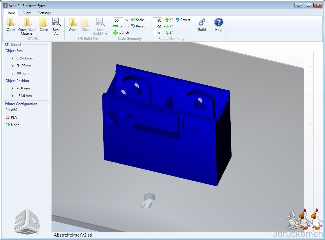 Es ist an der Zeit, unseren neuen Abstreifbehälter mit dem schönen blauen PLA von Fabberworld.com auszudrucken. Wir exportieren dazu die angepasste Version aus SketchUp als STL und Slicen mit Axon 2, Drucken bei 210° C, 0.25 mm Schichten und 25 % Füllung.