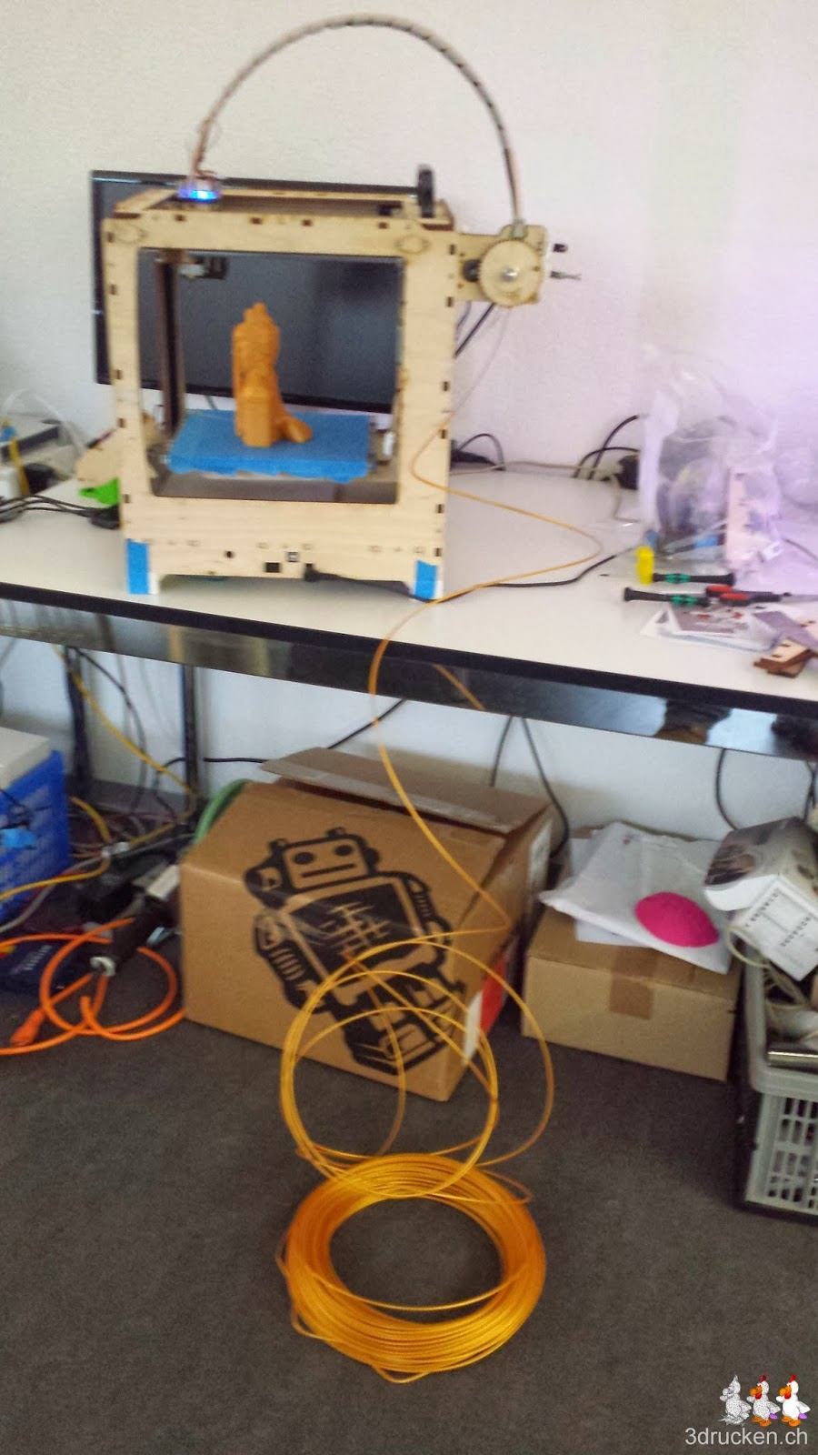 Wir haben das lose Druckmaterial von Faberdashery einfach mal auf den Boden beim Tisch mit dem Drucker hingelegt. So kann es genügend hochgezogen werden, und sollte sich nicht am Extruder verheddern. Als das Filament nämlich auf dem Tisch gleich hinter dem Drucker lag, wollte es sich immer mit dem Extruderrad anfreunden.