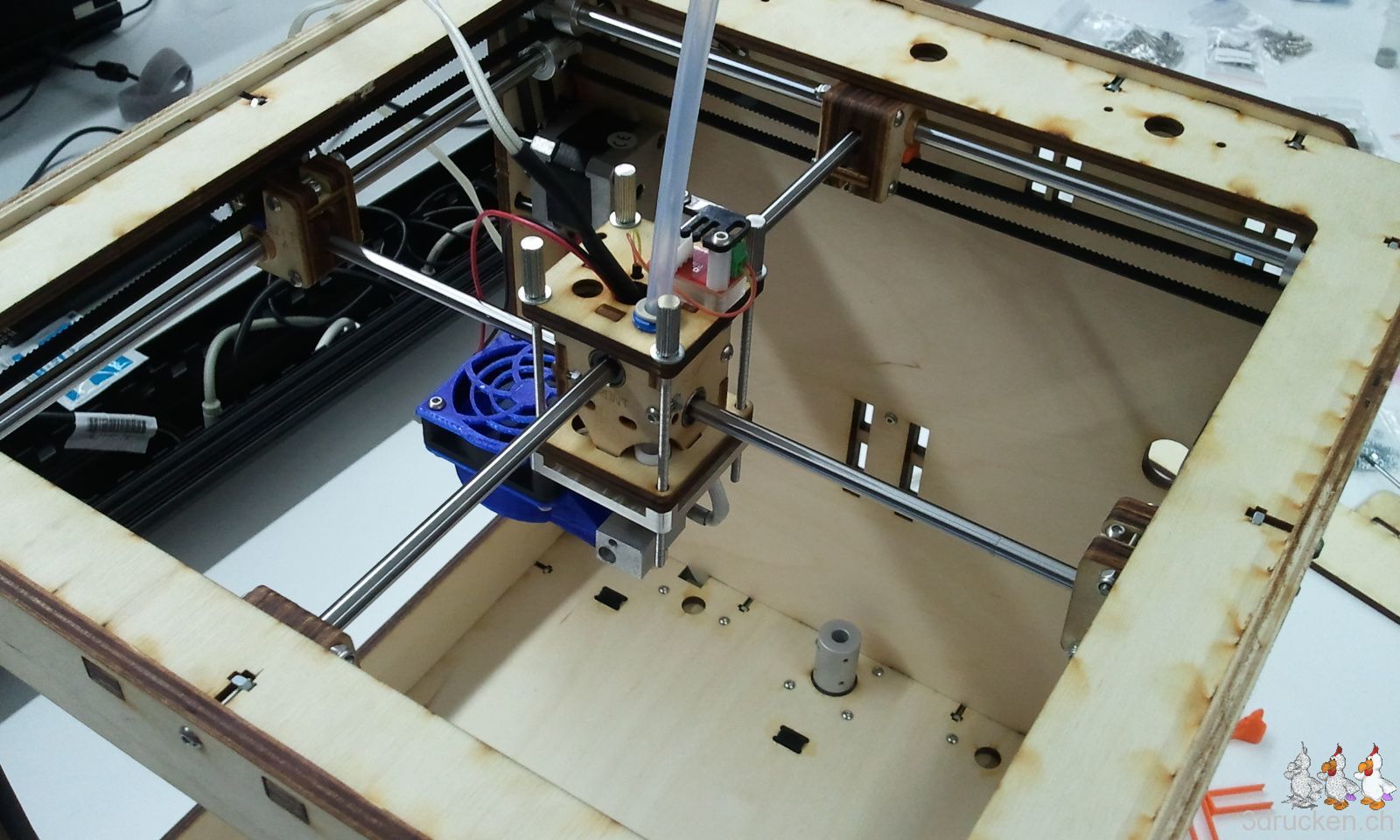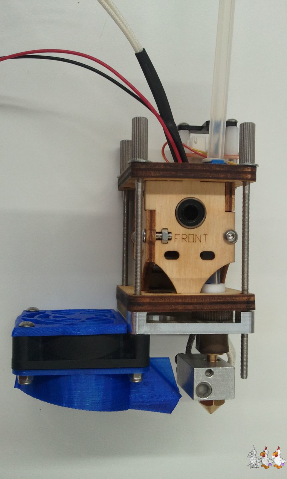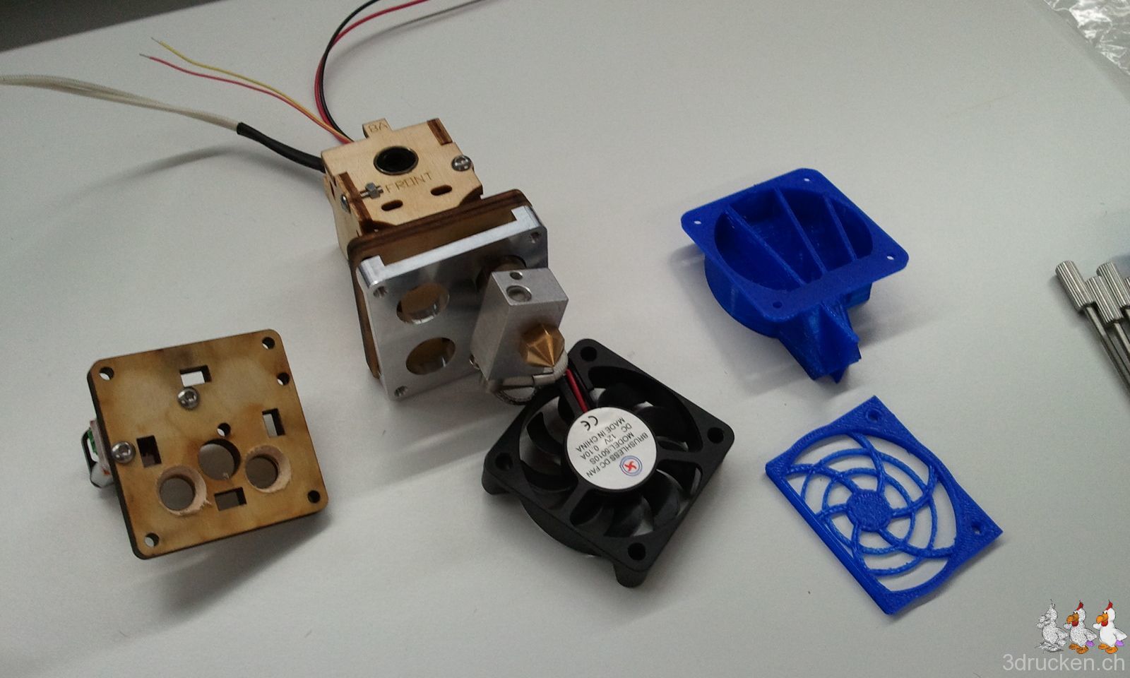 Der vierte Schritt in der Anleitung zum Zusammenbau eines Ultimakers umfasst die Montage des Druckkopfs. Dies ist der heikelste Teil der Montage, und man sollte sich vor diesem Schritt wirklich eine Pause, und bei Bedarf auch einen Kaffee gönnen. Für den Lüfter am Druckkopf drucken wir auf unserem ersten Ultimaker parallel dazu die Lüfterhaube unten (als Ersatz zum Faltdings), und eine Abdeckung für oben drauf. Bis wir soweit sind, sollten die beiden Teile gedruckt sein.