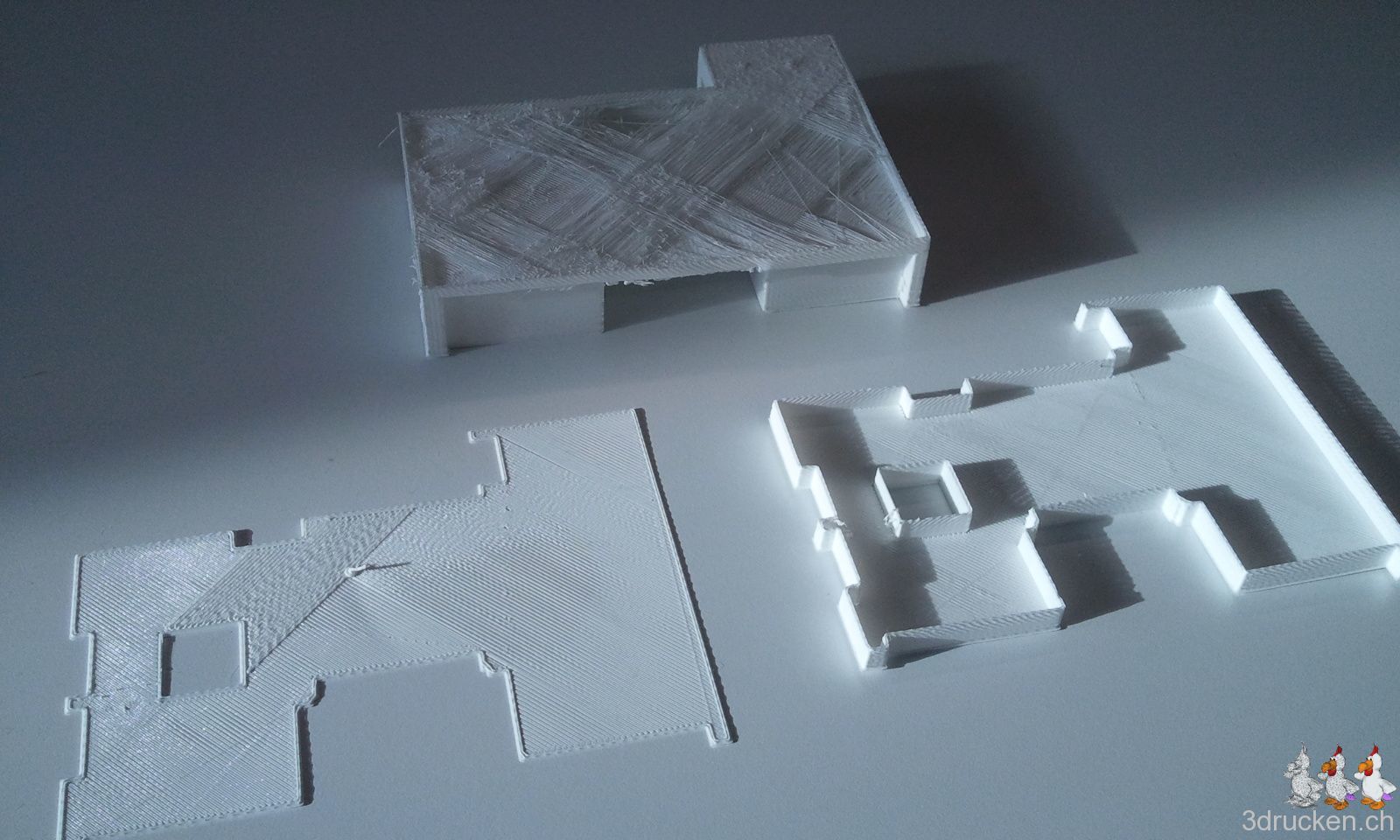 Vom Modell her lässt sich sagen, dass zunächst die Aussparung für den Connector auf der Unterseite gefehlt hat, und an der vorderen Fassade die beiden inneren Pfeiler zu klein gezeichnet wurden. Weiter lässt sich der Pfeiler, welcher die Terrasse abstützen sollte nicht drucken, da er zu klein ist. Das grösste Problem stellt aber die Zusammensetzung des Modells in Stockwerke dar. So wurde wie beim ersten Druck oben zu sehen ist, ein Zwischenboden eingezogen, der auf die Konstruktion zurückzuführen ist.