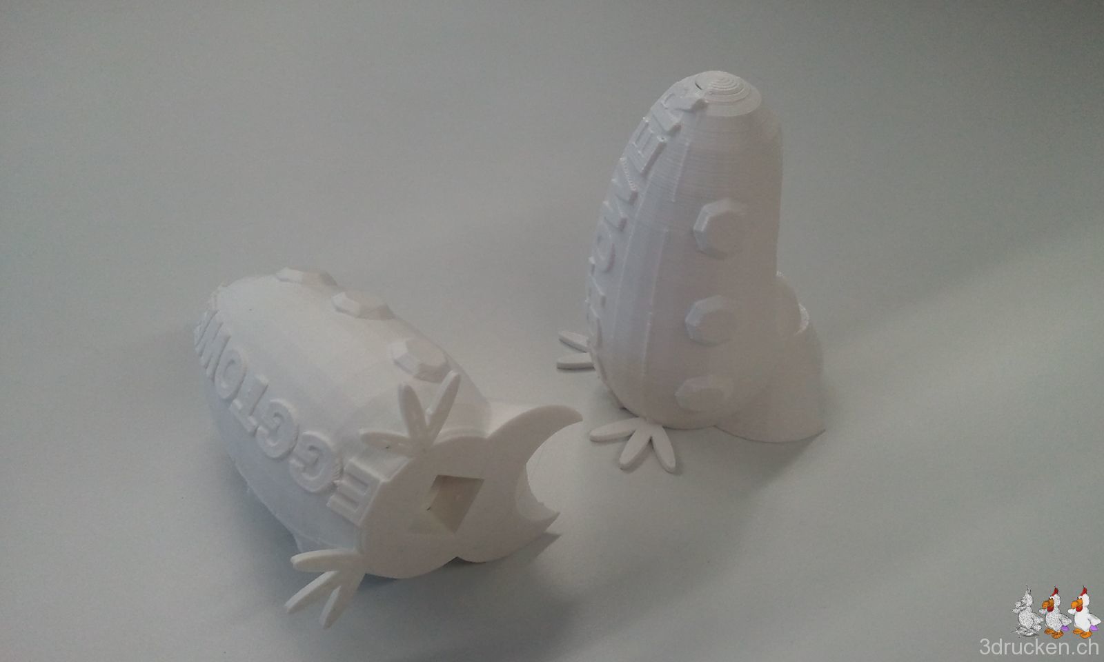 Toll, der EggTower ist nun zum Stadtplan von GüggelTown kompatibel, da er eine Aussparung an der Unterseite besitzt. Leider waren die Slicing-Parameter in Cura (dickere Wände, mehr Deckschichten) schlechter gewählt als beim ersten Druck, denn das Resultat ist im Ganzen weniger gelungen als der erste Druck.