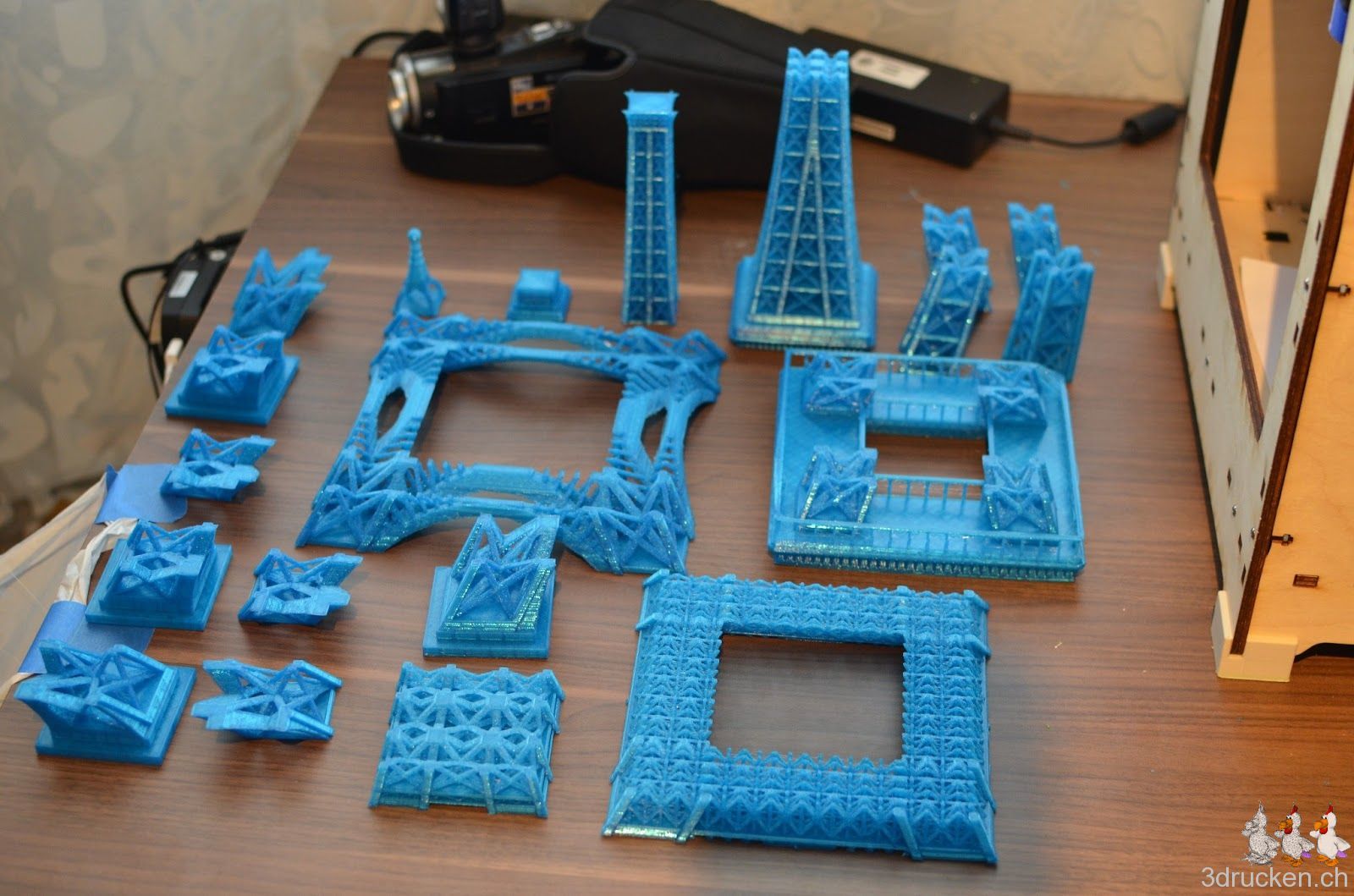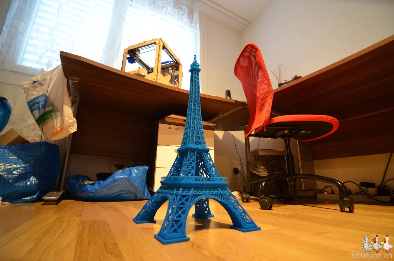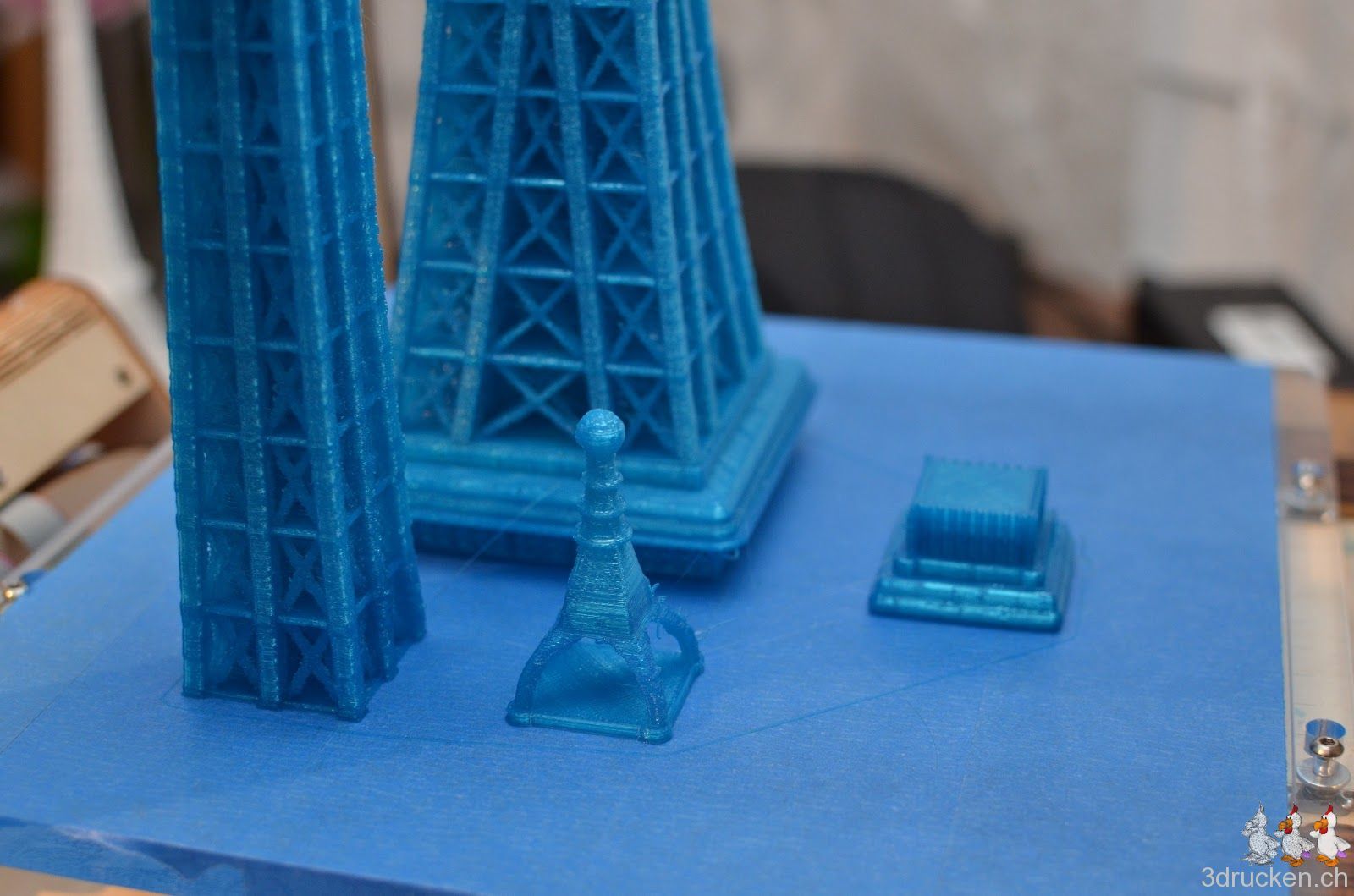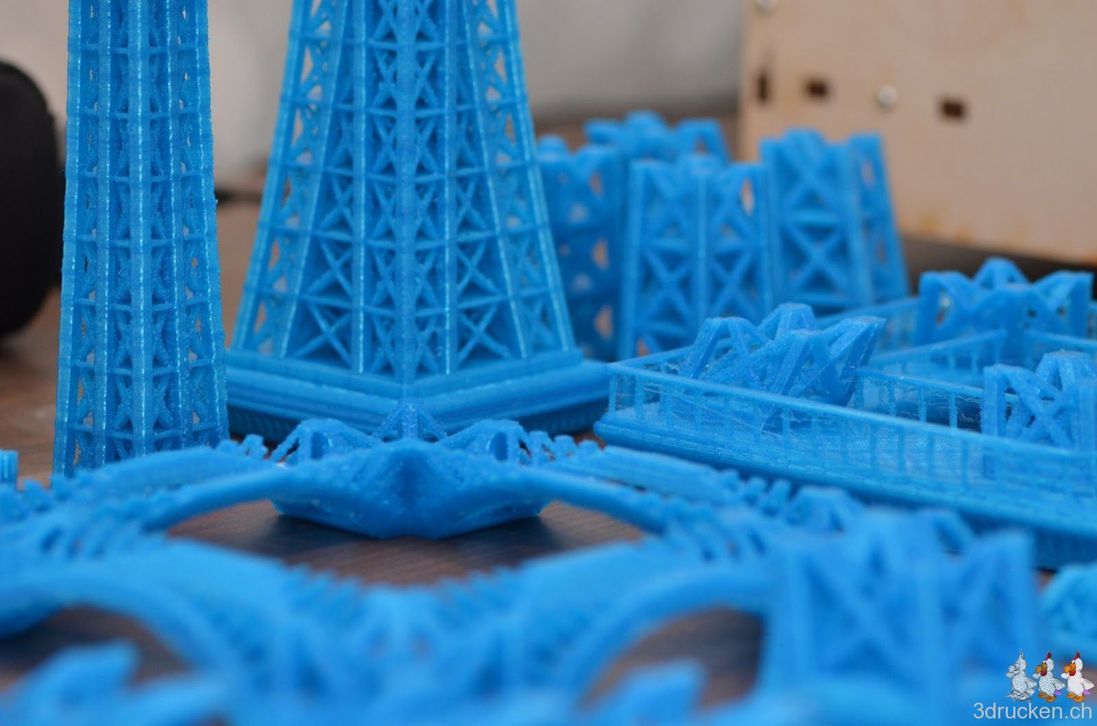 Wir wollten ausprobieren, wie gross und trotzdem detailreich man mit dem Ultimaker drucken kann. Herausgekommen ist ein mit Netfabb Studio in 20 Einzelteile zerlegter Eiffelturm mit 60 cm Höhe. Grösser als der Güggel.