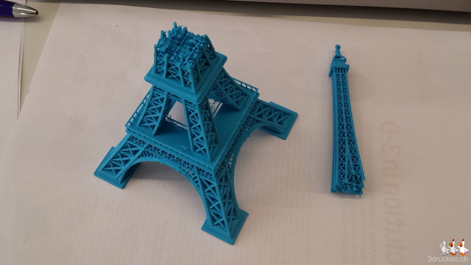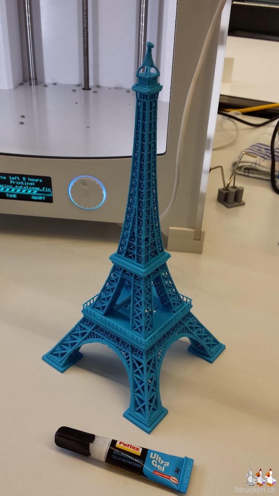 Etwas enttäuscht stellten wir bei unserer Rückkehr ins Büro am Montag fest, dass der bisher am besten gelungene Eiffelturm aus dem Ultimaker 2 bereits einem Sturz vom Fensterbrett zum Opfer gefallen sein musste. Heute haben wir ihn nun mit Pattex Ultra Gel heil gemacht, und freuen uns wieder über das schmucke Stück. Mit der Gel-Variante des Sekundenklebers haben wir bisher beim Kleben von PLA die besten Resultate erzielt.