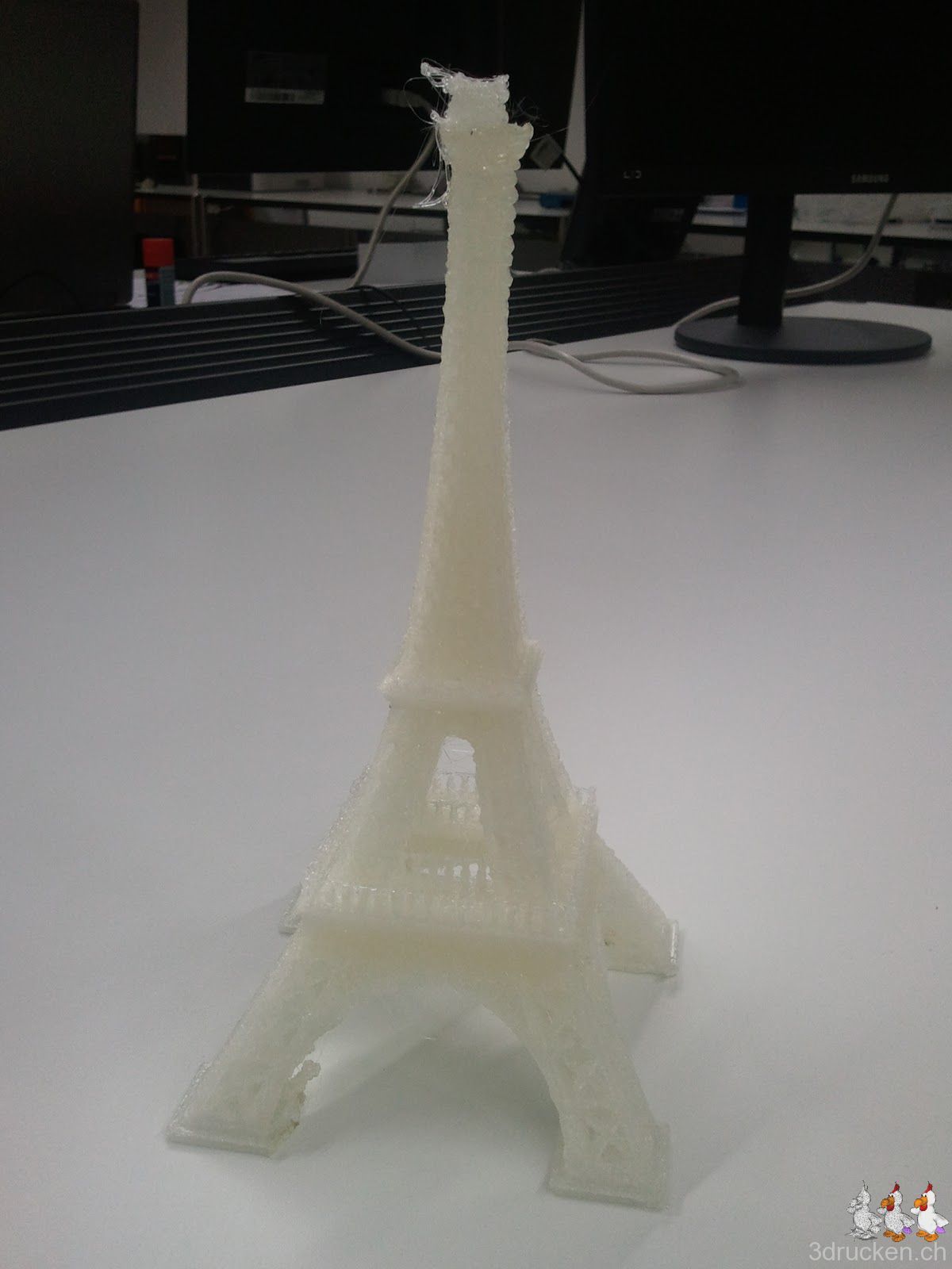 Mit Axon 3.0 Alpha1 und der Firmware 5.4.0, hat der 3DTouch in 20 h 6 min den Eiffelturm gedruckt. Auffallend sind die Differenz zur Schätzung von 13 h 26 min, und die Detailtreue im unteren Bereich, welche wohl von der neuen Einstellungsmöglichkeit „Fine detail preservation“ her rührt. Ansonsten ist der Druck ziemlich unbrauchbar, da an anderen Stellen zugekleistert, und ausserdem fehlt die Spitze.