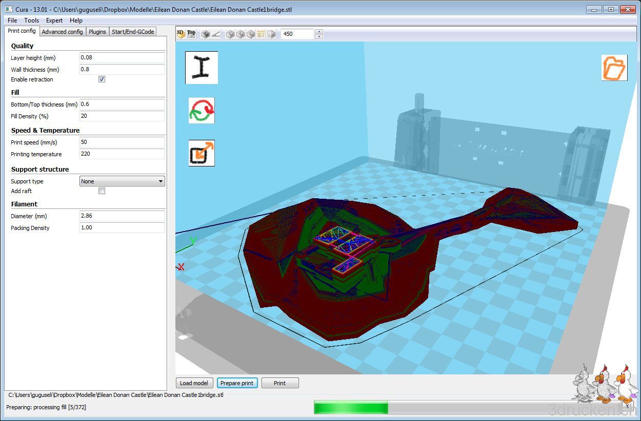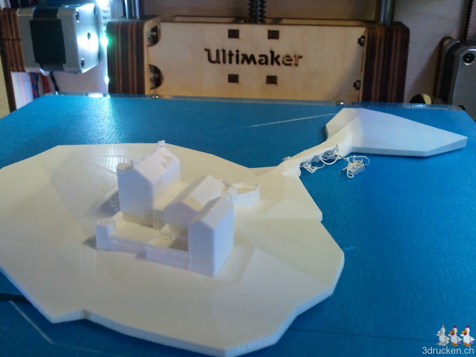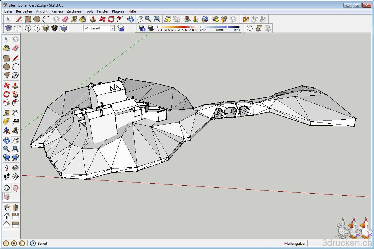 Das Modell des Eilean Donan Castle in Schottland haben wir aus der Trimble 3D-Galerie heruntergeladen und anschliessend in SketchUp bearbeitet, um eine flache Unterlage zum Drucken zu erhalten. Zudem haben wir Löcher und falsch orientierte Flächen korrigiert. Mit Cura 13.01 in 0.08 mm Schichten geslicet und in 11 h 53 min bei 220° C aus weissem RepRap-PLA gedruckt. Die Höhe des Modells beträgt 28 mm. Die Brückenpfeiler sind beim Drucken leider herausgebrochen, weshalb wir nachträglich am Modell die Brücke mit einer Fläche unterlegt haben.