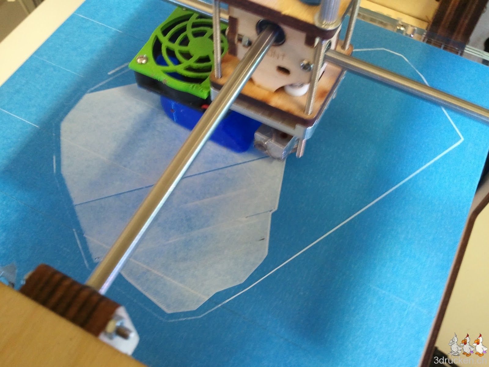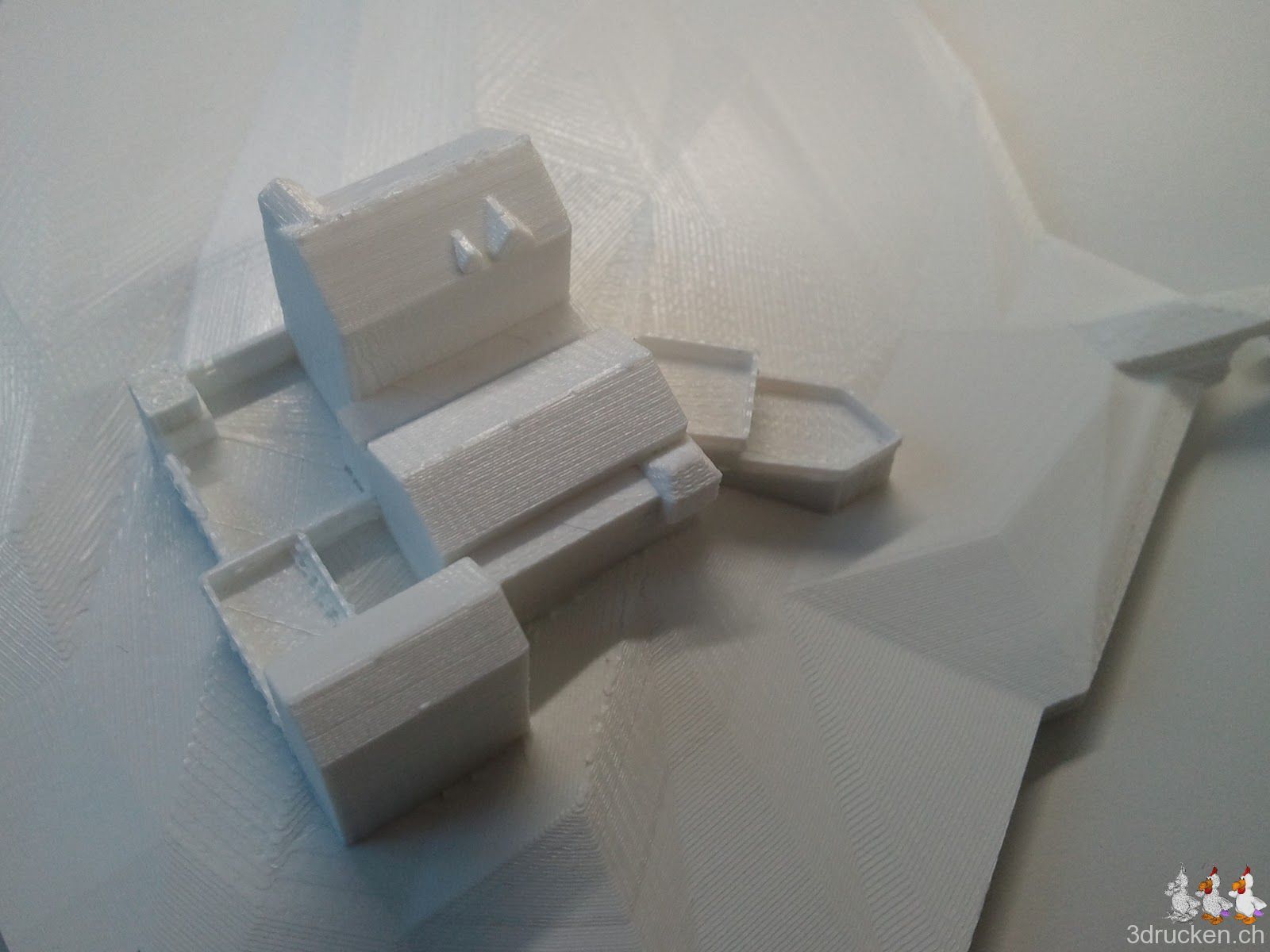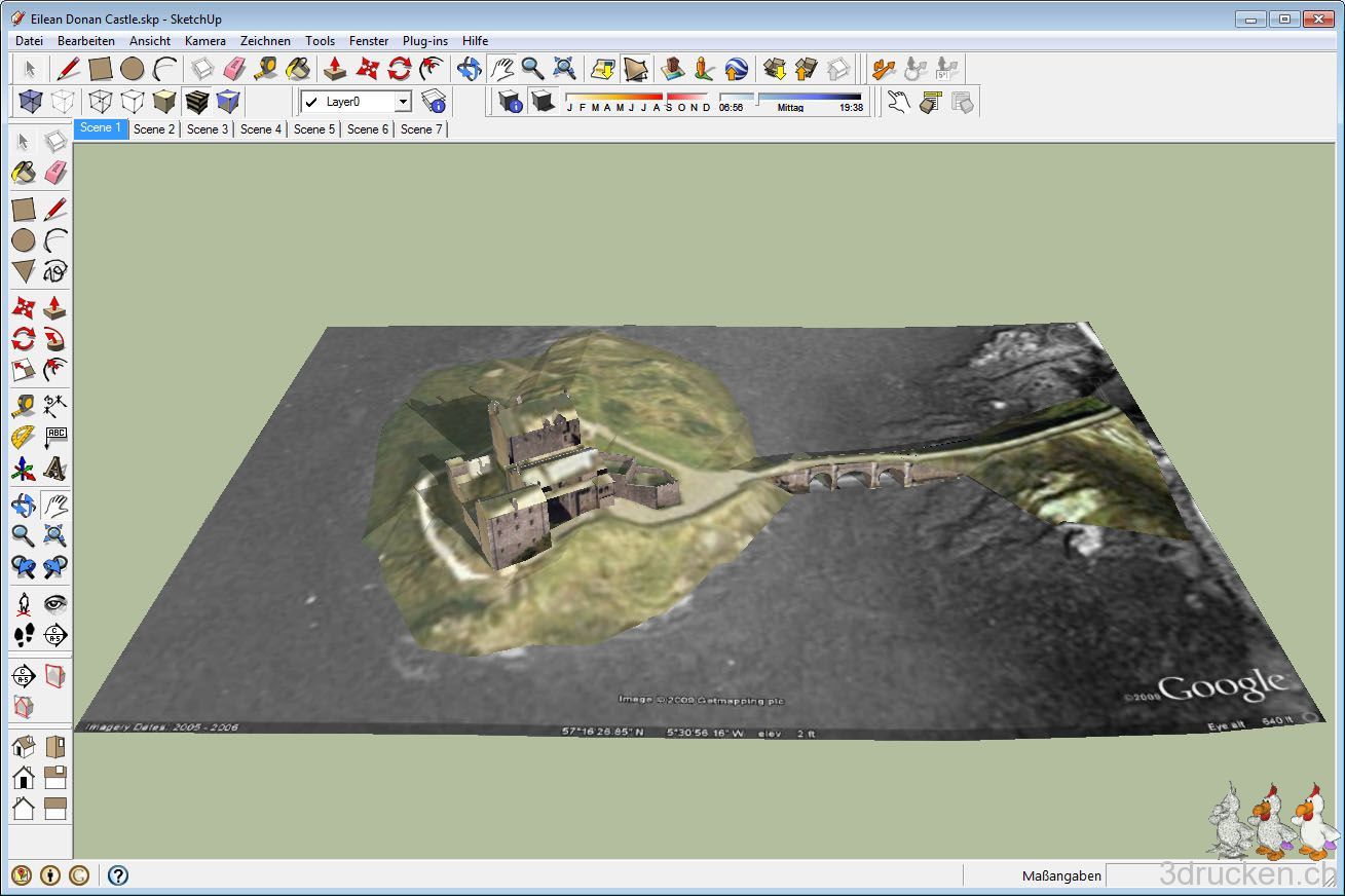 Das Modell des Eilean Donan Castle in Schottland haben wir aus der Trimble 3D-Galerie heruntergeladen und anschliessend in SketchUp bearbeitet, um eine flache Unterlage zum Drucken zu erhalten. Zudem haben wir Löcher und falsch orientierte Flächen korrigiert. Mit Cura 13.01 in 0.08 mm Schichten geslicet und in 11 h 53 min bei 220° C aus weissem RepRap-PLA gedruckt. Die Höhe des Modells beträgt 28 mm. Die Brückenpfeiler sind beim Drucken leider herausgebrochen, weshalb wir nachträglich am Modell die Brücke mit einer Fläche unterlegt haben.
