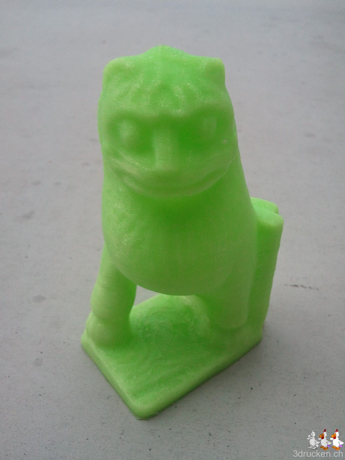 Modell von Thingiverse: Lion, c. 2nd century India Uttar Pradesh, Mathura region. Geslicet mit KISSlicer in 0.25 mm Schichten, 10 % Füllung, 1.2 mm Skin Thickness mit feinem Support über 75° und dann in grünem Fabberworld-PLA auf dem BfB 3DTouch gedruckt. Druckzeit 4 h 10 min.