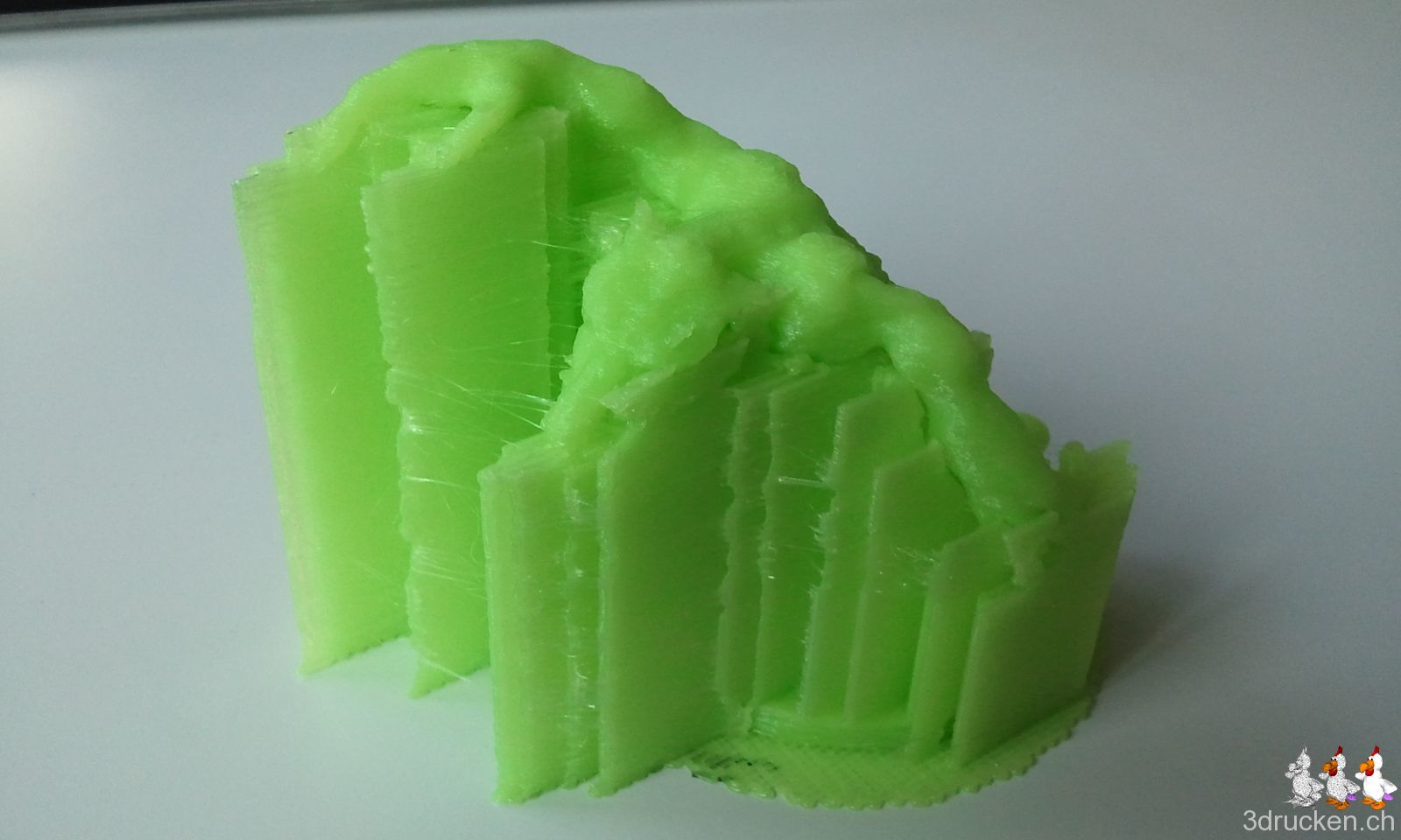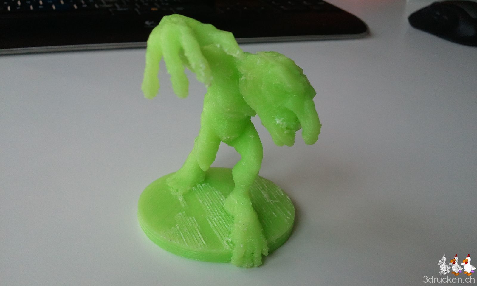 Axon 2, hellgrünes fabberworld-PLA, 0.25 mm Schichten, 15 % Füllung, Raft und hässlichen Support. Druckzeit 14 h 43 min. Beim Support wegmachen sind zwei Finger an der linken Hand weggebrochen, was unseren Troll nun einzigartig macht. Wer sich seinen eigenen Troll drucken möchte, der kann das Modell von Thingiverse runterladen und sein Glück versuchen.