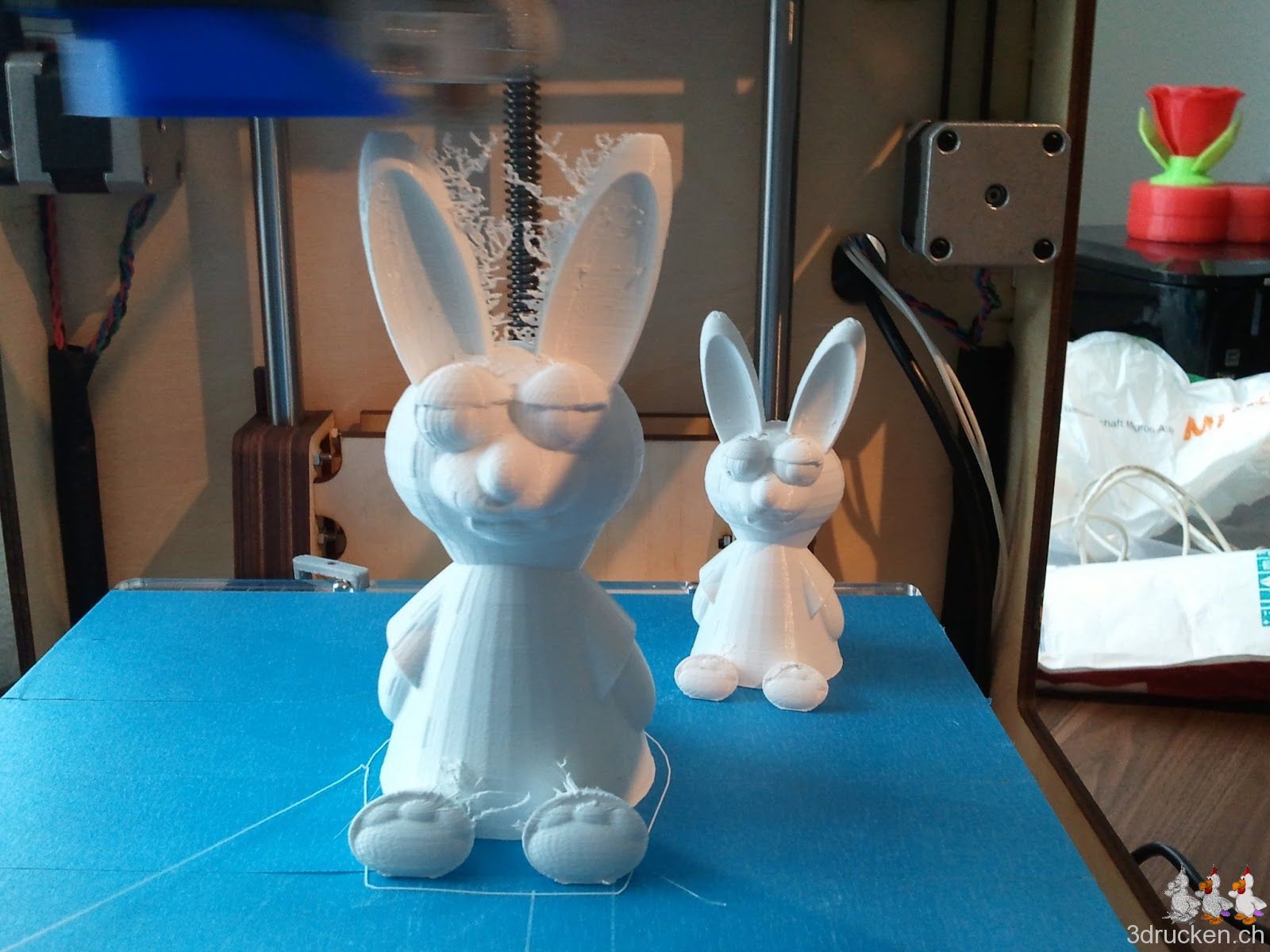 Um den Ultimaker, und die beiden aktualisierten Anleitungen für den Nachmittag zu testen, drucken wir für Amélie gerade einen süssen Hasen zum Spielen. Der erste Druck im Hintergrund wurde mit 100 mm/s und 0 % Füllung, bei 200 % skaliert gemacht, der zweite Versuch um 300 % skaliert, mit 10 % Füllung.