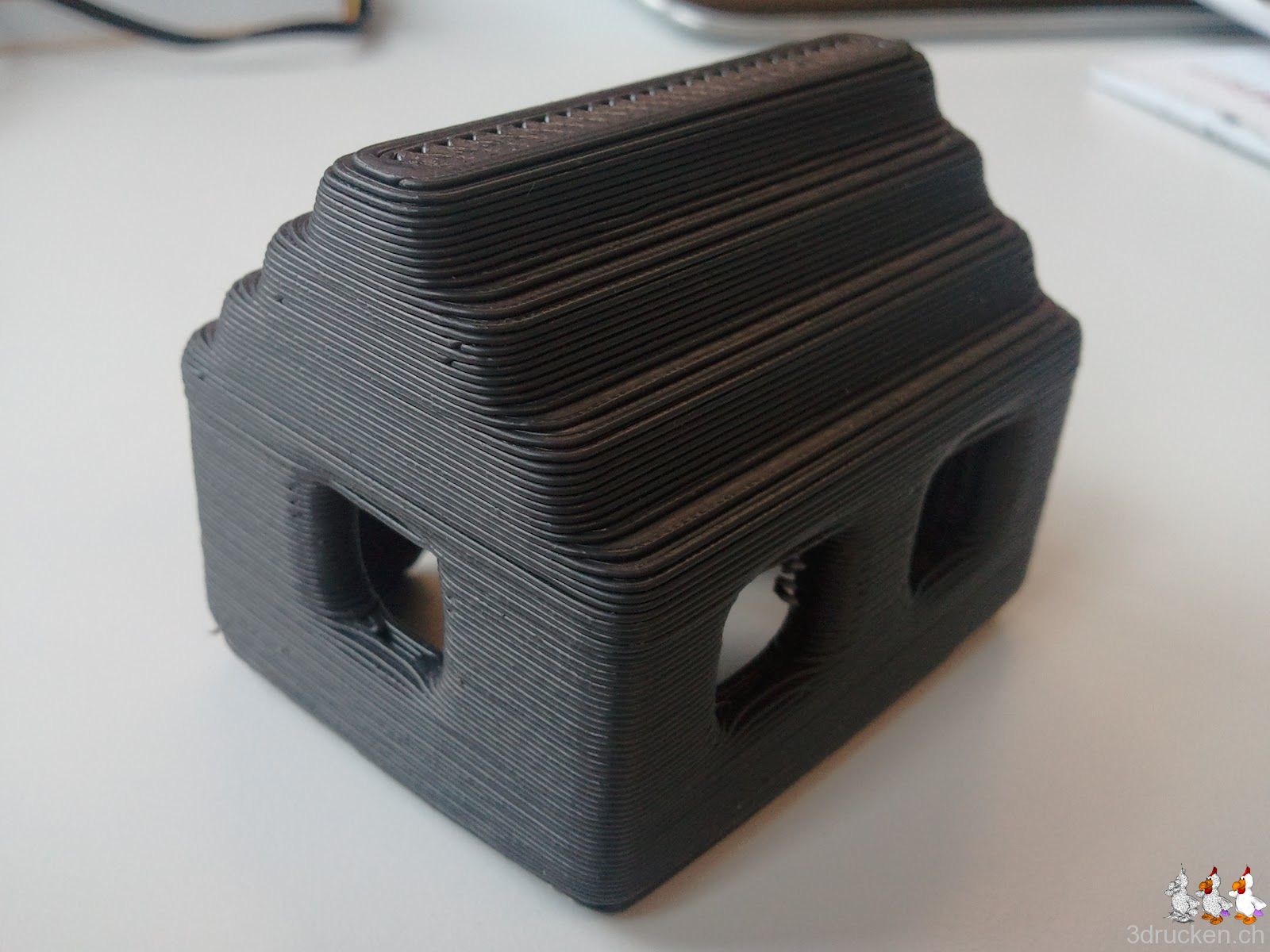Wir haben heute ein schönes Haus auf 3dtin.com gebaut. Hier ein Screenshot vom Bau, und ein Foto vom anschliessenden Ausdruck, auf unserem 3D-Drucker BfB 3DTouch. Schichtdicke 0.5 mm, Material: ABS, geslicet mit Axon 2.