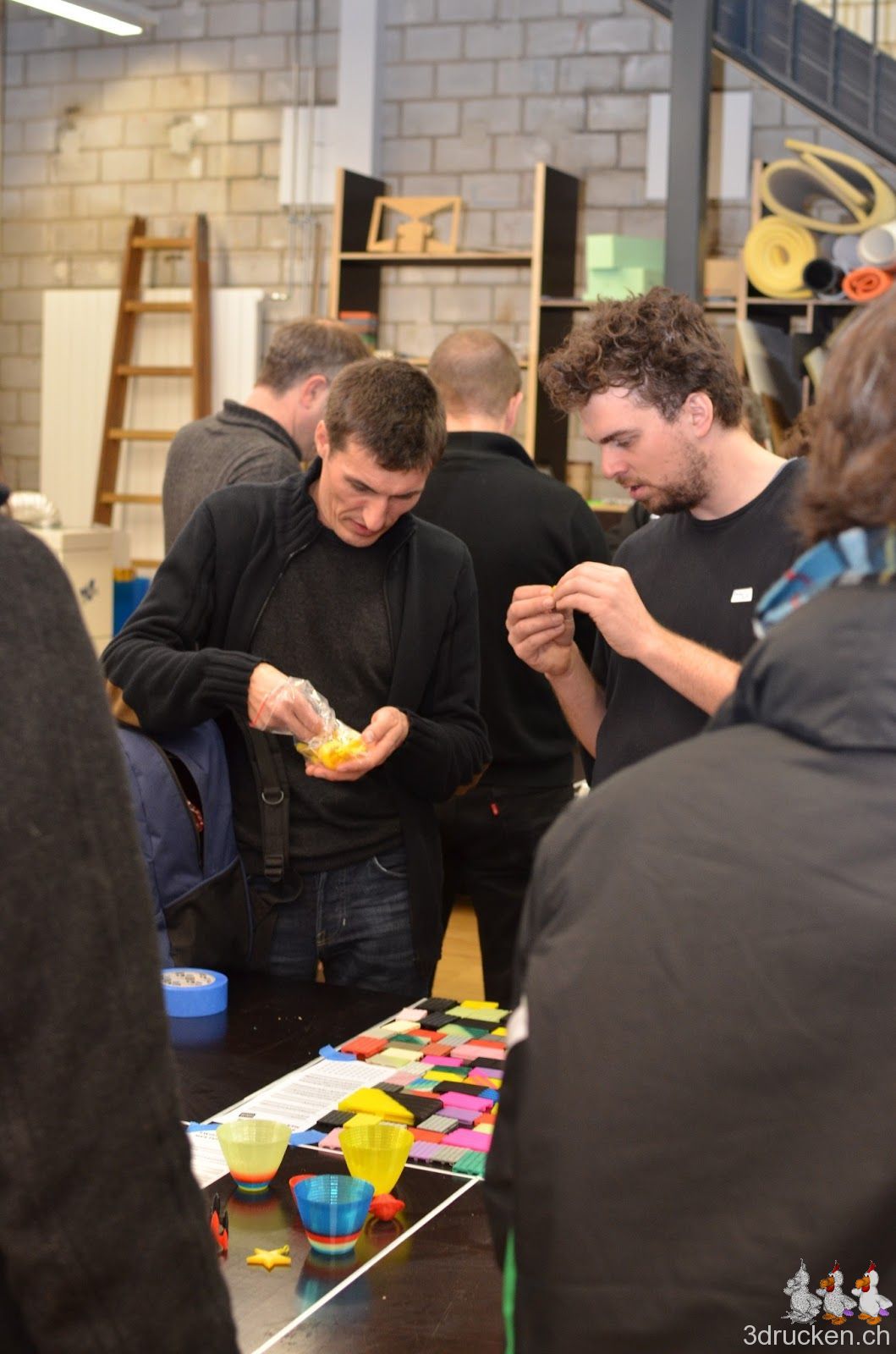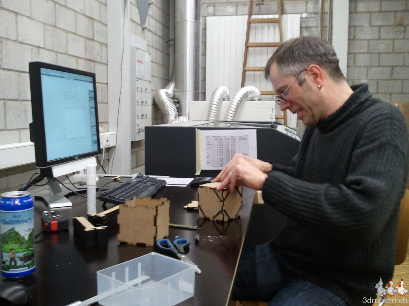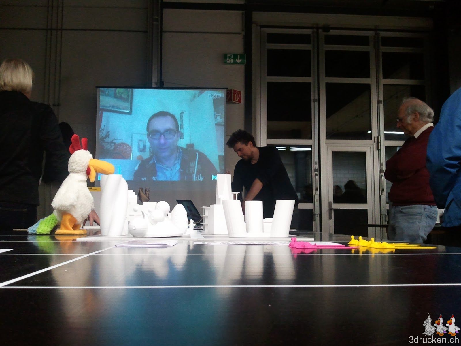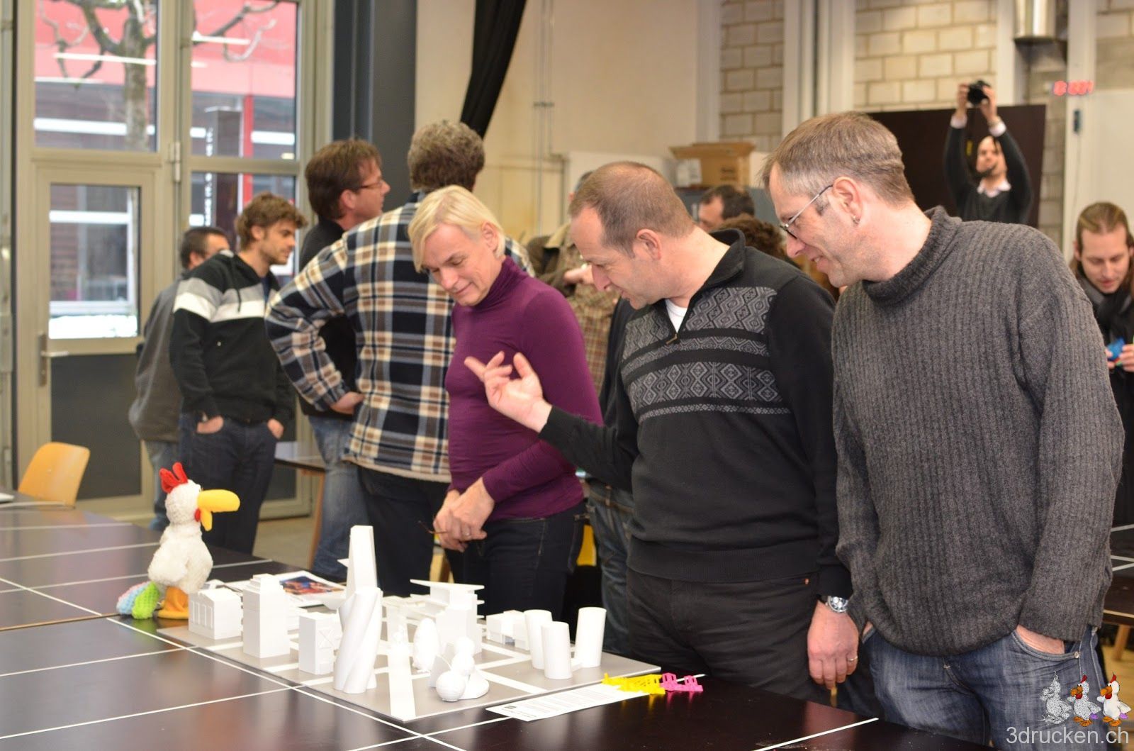 Zum Ausstellen der mitgebrachten Modelle standen Tische bereit. Da fand trotz Übergrösse auch GüggelTown seinen Platz. Es war beeindruckend zu sehen, welche verschiedenen Objekte da zusammengekommen sind. Auf dem mitgebrachten Ultimaker haben wir später kleine grüne Güggel gedruckt. Vom Angebot sich auf einem Drehteller mittels Kinect-Sensor 3D-Scannen zu lassen, haben alle drei von uns Gebrauch gemacht. Was aus den Daten nun wurde, könnt ihr in einem weiteren Post dann lesen. Ganz zum Schluss wagte sich Kurt Meister noch mit einem eigenen Design an den Lasercutter.
