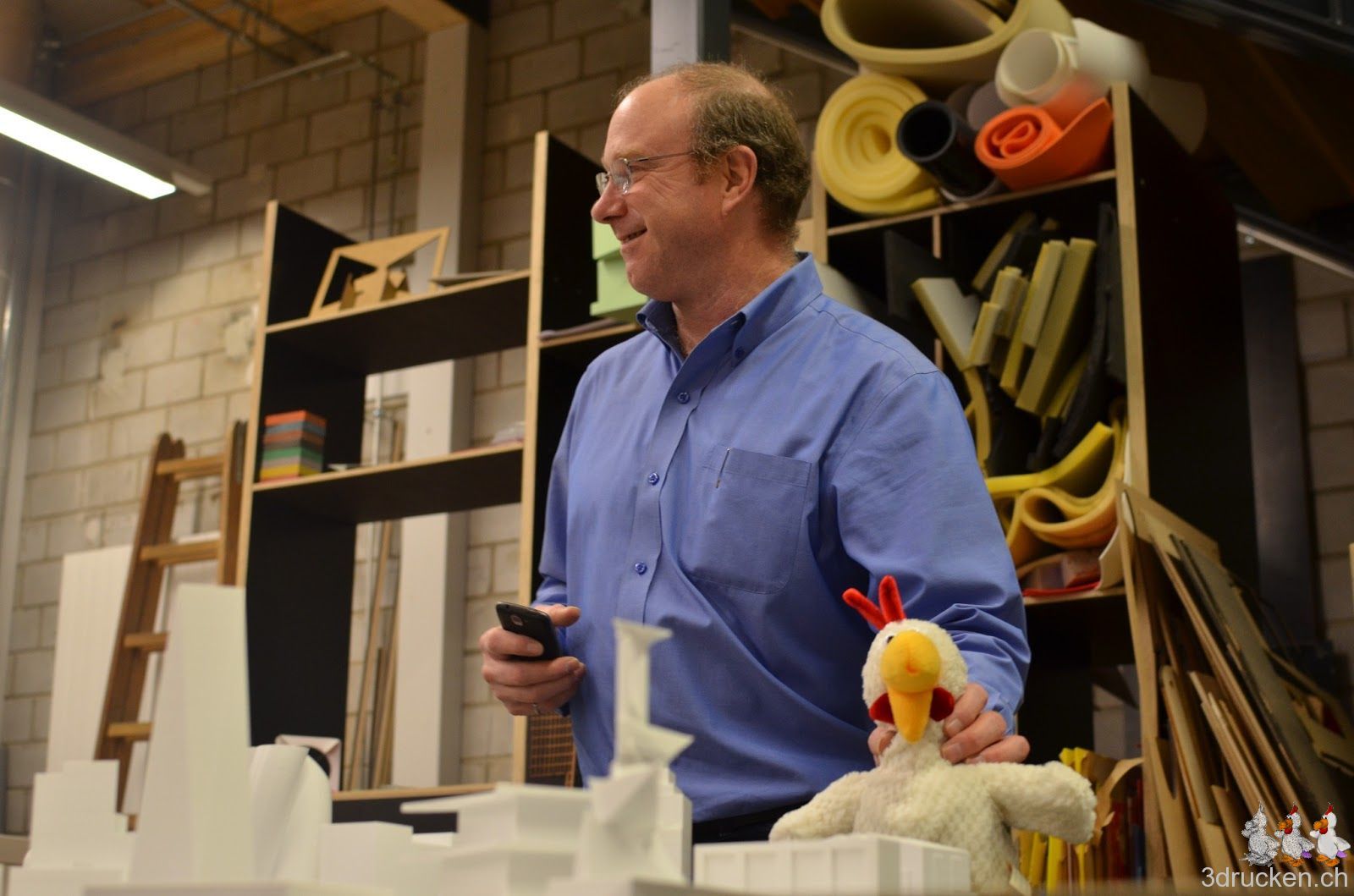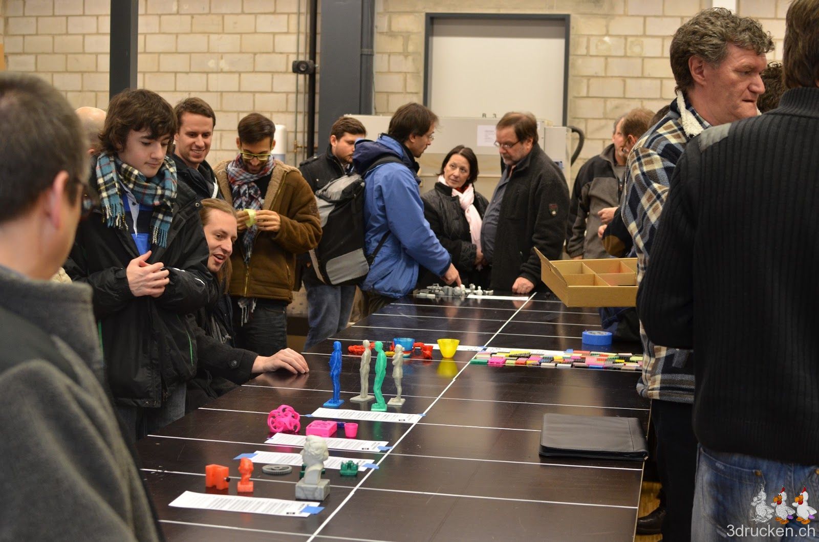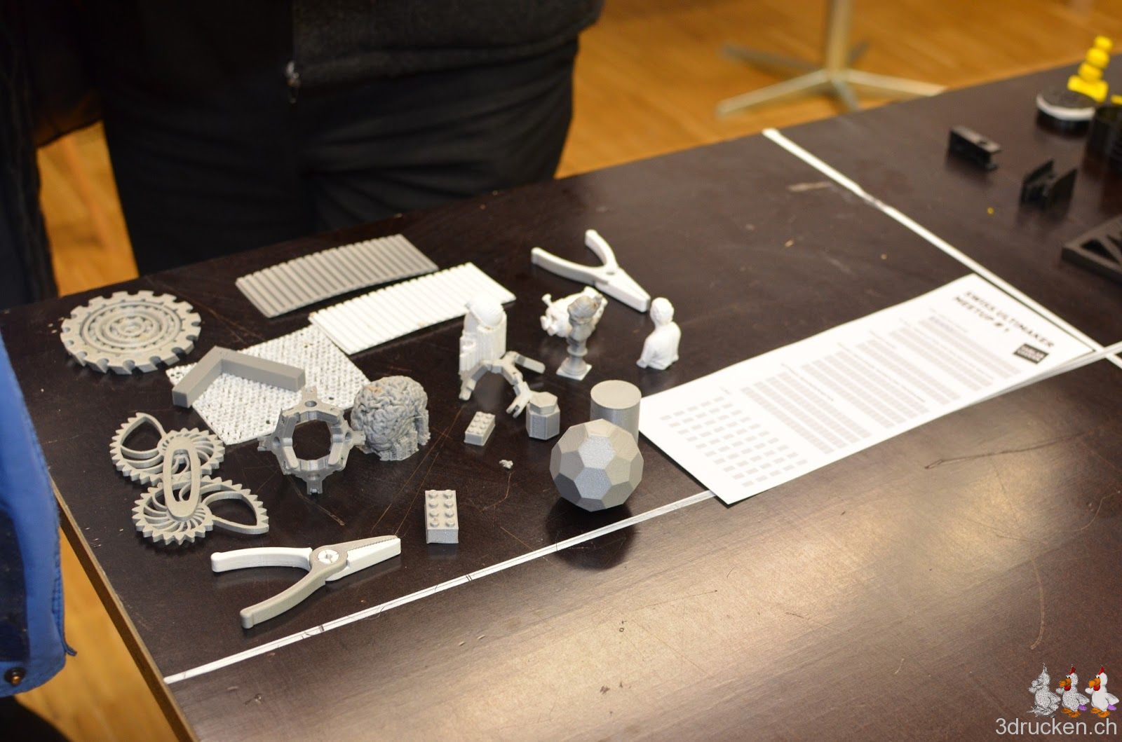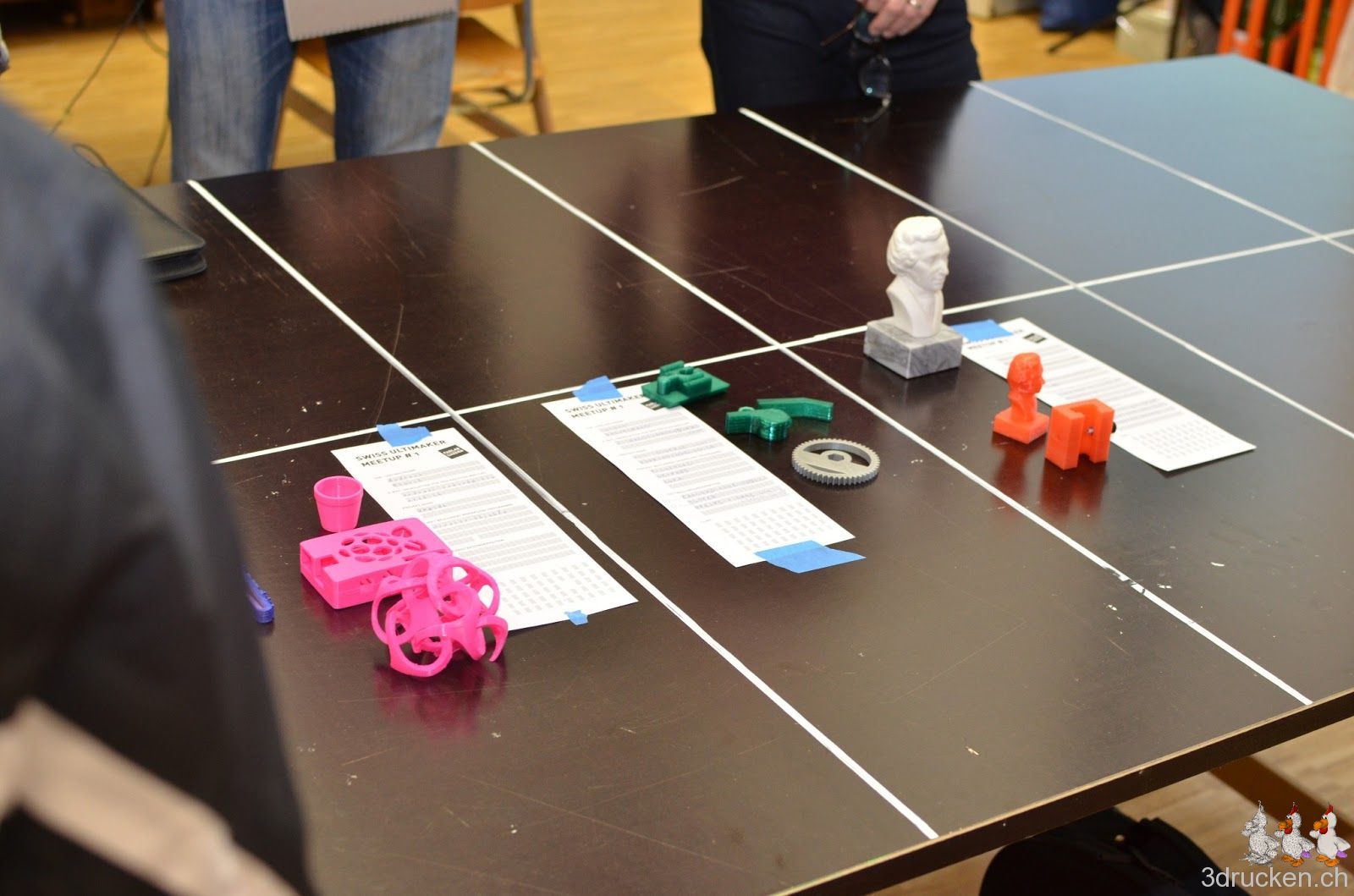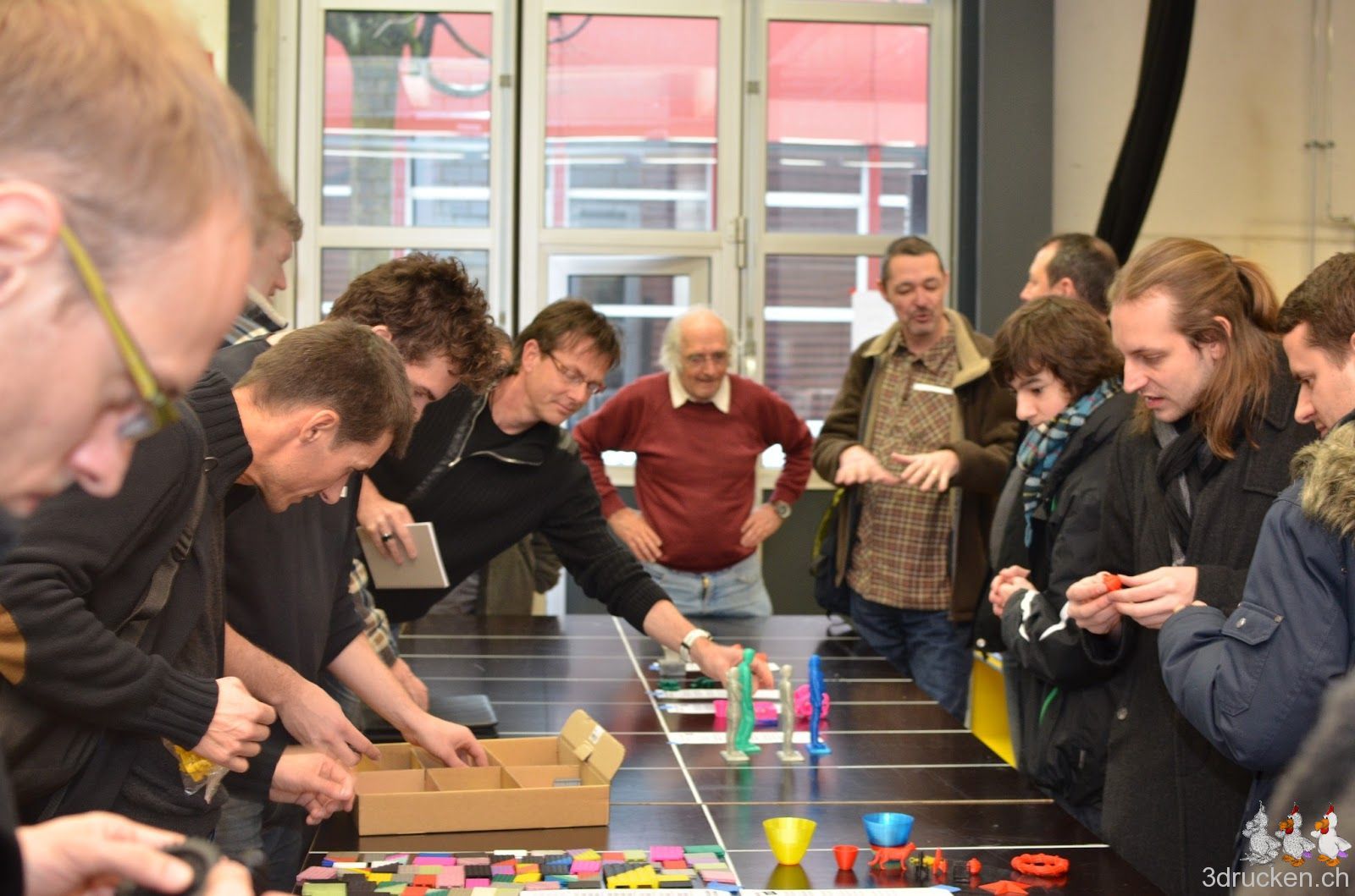 Zum Ausstellen der mitgebrachten Modelle standen Tische bereit. Da fand trotz Übergrösse auch GüggelTown seinen Platz. Es war beeindruckend zu sehen, welche verschiedenen Objekte da zusammengekommen sind. Auf dem mitgebrachten Ultimaker haben wir später kleine grüne Güggel gedruckt. Vom Angebot sich auf einem Drehteller mittels Kinect-Sensor 3D-Scannen zu lassen, haben alle drei von uns Gebrauch gemacht. Was aus den Daten nun wurde, könnt ihr in einem weiteren Post dann lesen. Ganz zum Schluss wagte sich Kurt Meister noch mit einem eigenen Design an den Lasercutter.