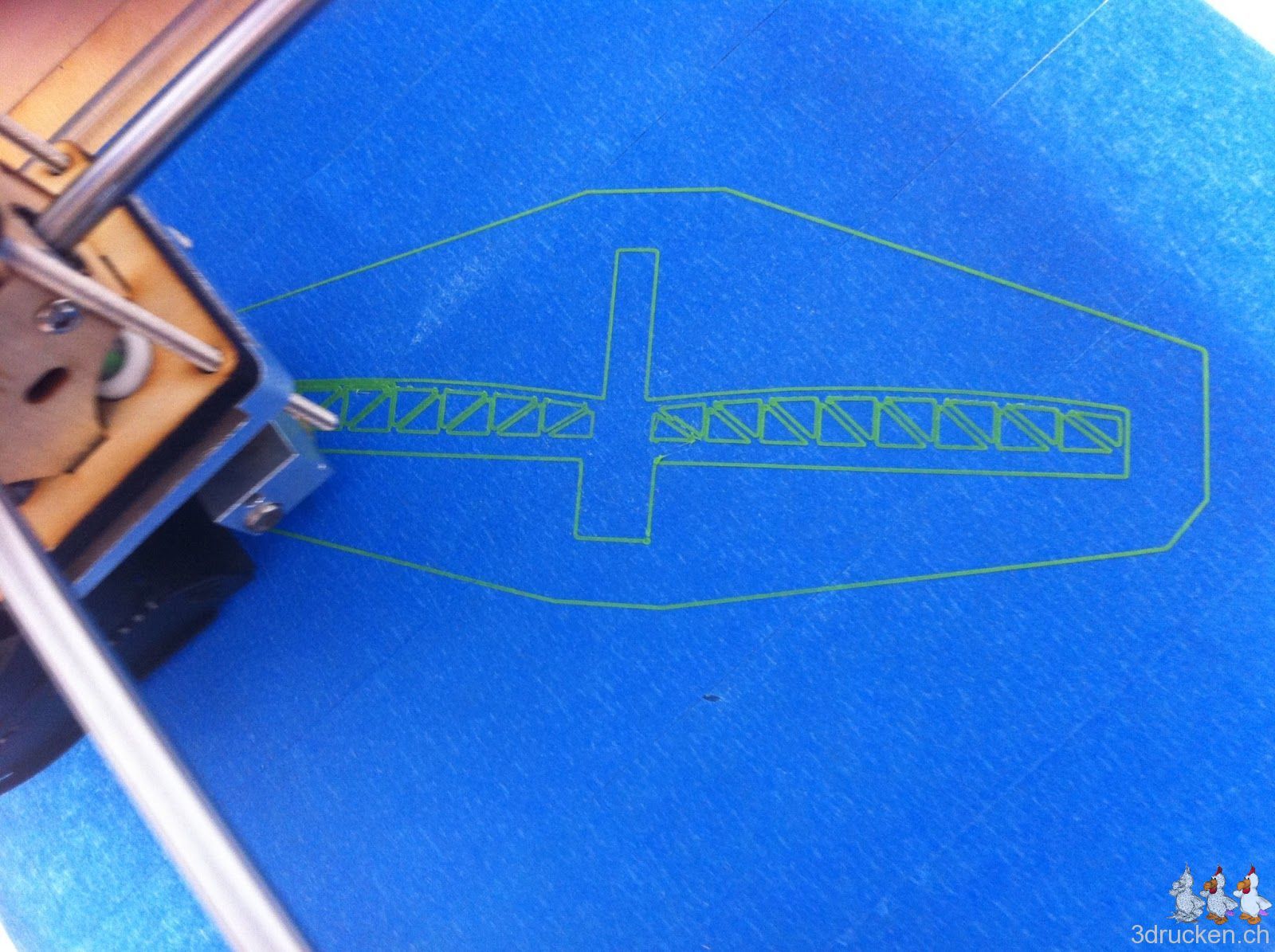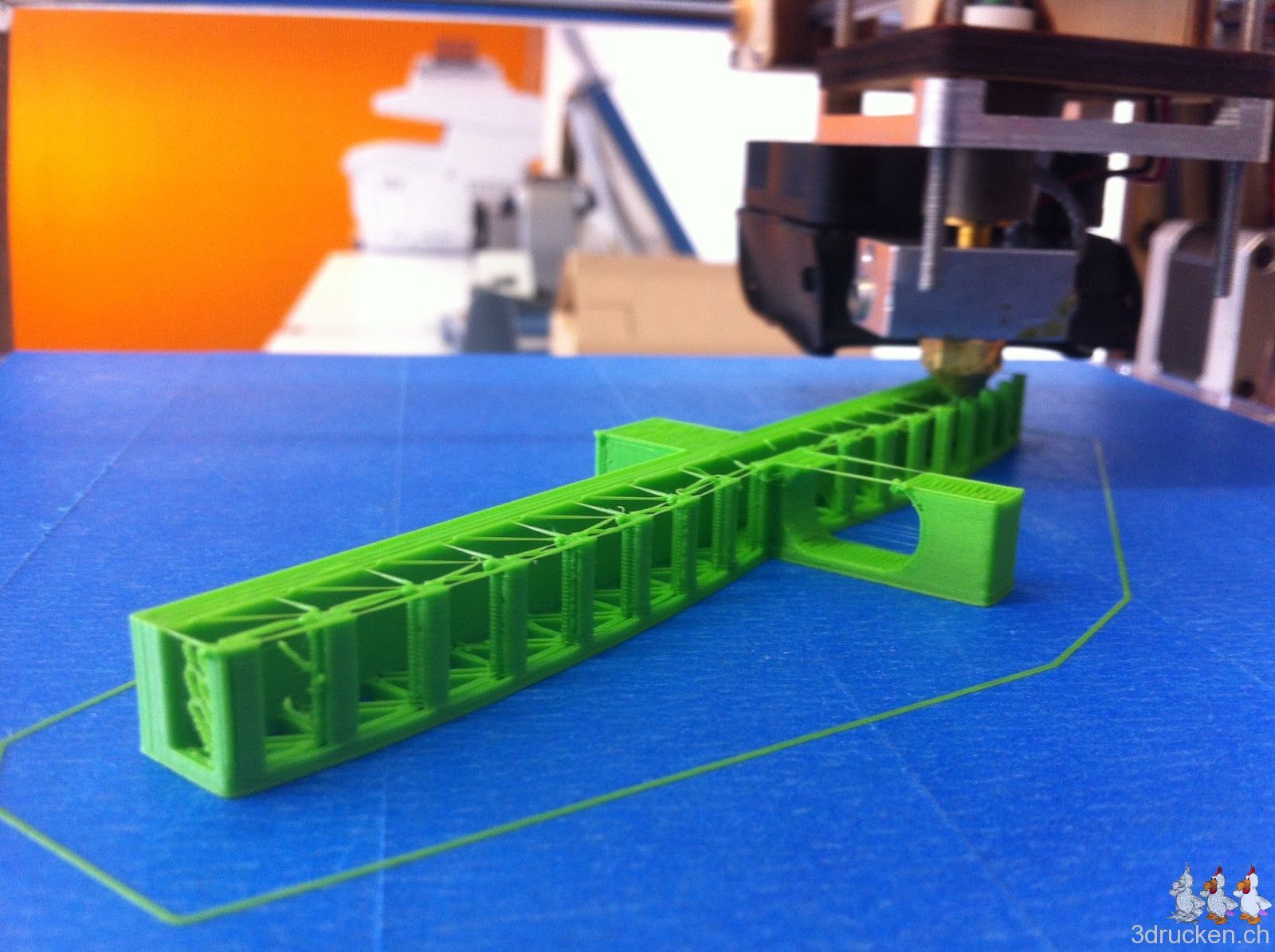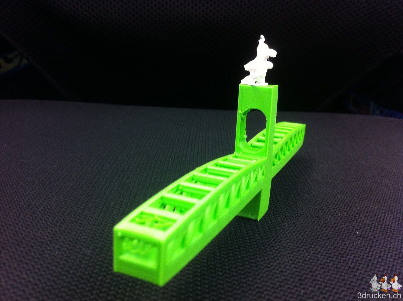 Zur Freude vom Güggel druckten wir heute zur Abwechslung ein Brückenteil, den wir von Thingiverse heruntergeladen haben. Das Ziel war zu schauen, wie der neue Ultimaker mit Überhängen zu Gange kommt. Darum verzichteten wir auf Support. Der Drucker arbeitete schnell (ca. 1 Stunde) und präzise. Die Überhänge schaffte der Ultimaker ohne grosse Probleme.