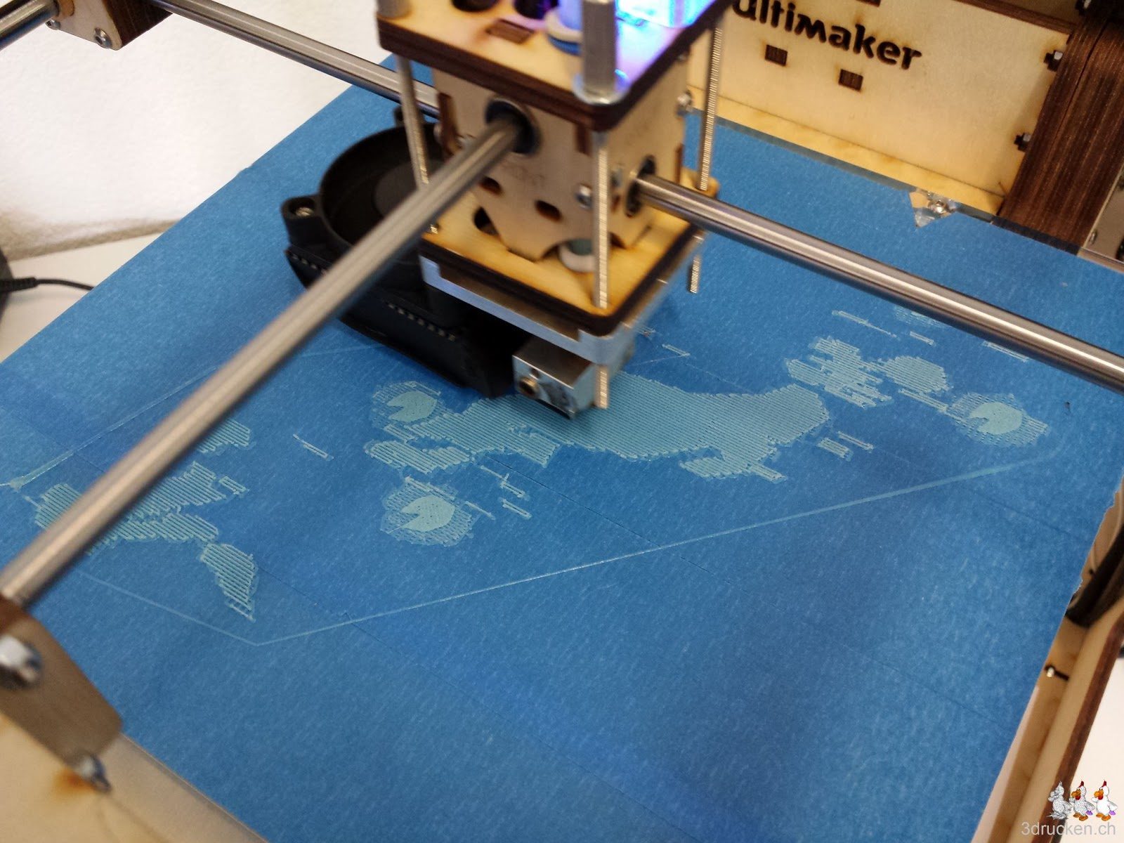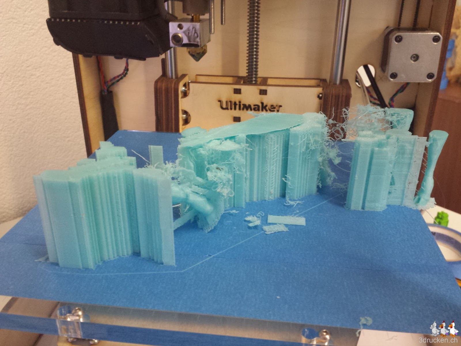Es sollte der längste Druckauftrag werden, den wir bisher auf den Ultimaker ausgeführt haben, geschätzte 56 h. Drucken wollten wir eine Kuh, möglichst gross und in schöner Farbe. Daraus geworden ist ausser verbrauchtem Filament nicht wirklich was. Wir haben den Druck nach ca. 24 h schliesslich abgebrochen. Geslicet in 0.08 mm Schichten, 5 % Füllung, Support und Raft.