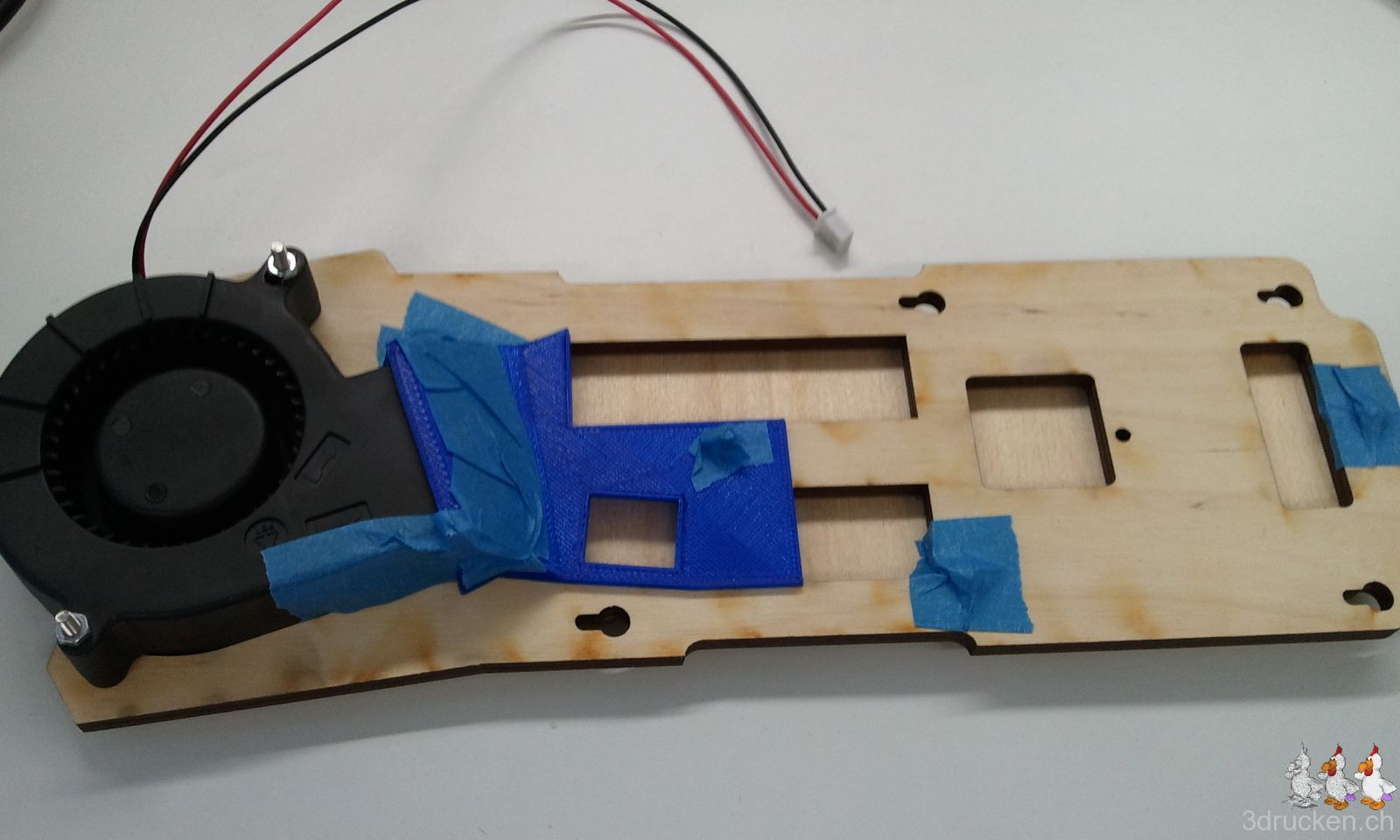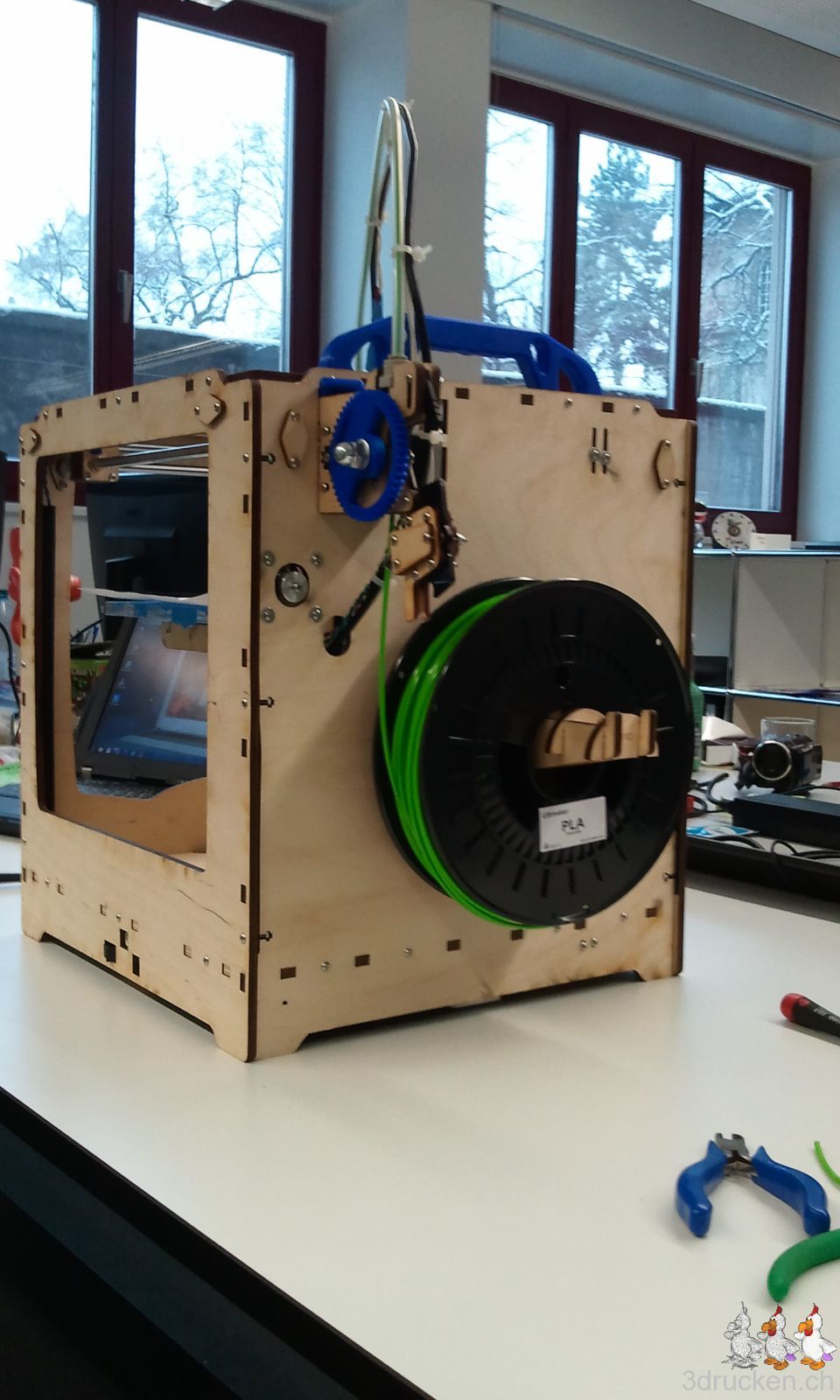 Nun fehlt nur noch der Ulticontroller, die Elektronik haben wir gerade so gut wie möglich nach Anleitung angeschlossen. Der Funktionstest steht noch aus. Den oberen Z-Limitswitch hatten wir verkehrt rum montiert, nun hält er nicht mehr so wirklich, mal sehen ob das noch reicht für den Endstopp, oder ob wir uns da was einfallen lassen müssen. In der Anleitung steht, dieser Montageschritt dauert 30-60 min. Diese Zeit benötigt man allerdings nur schon um die Anweisungen zu lesen. Bei uns dauerte darum dieser letzte Schritt das Zusammenbaus gute 90 min. Einschliesslich Kabel versorgen, Rollenhalterung montieren, Strom- und Heater-Kabel mit Kabelbindern fixieren, sowie Aufräumen. Langsam steigt die Spannung, ob unser zweite Zusammenbau richtig funktioniert.