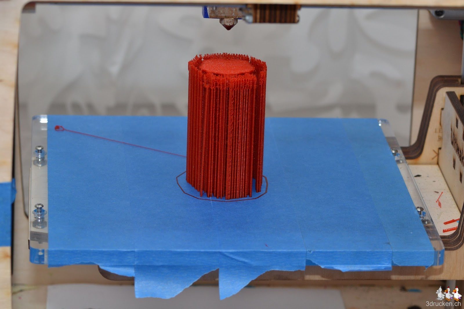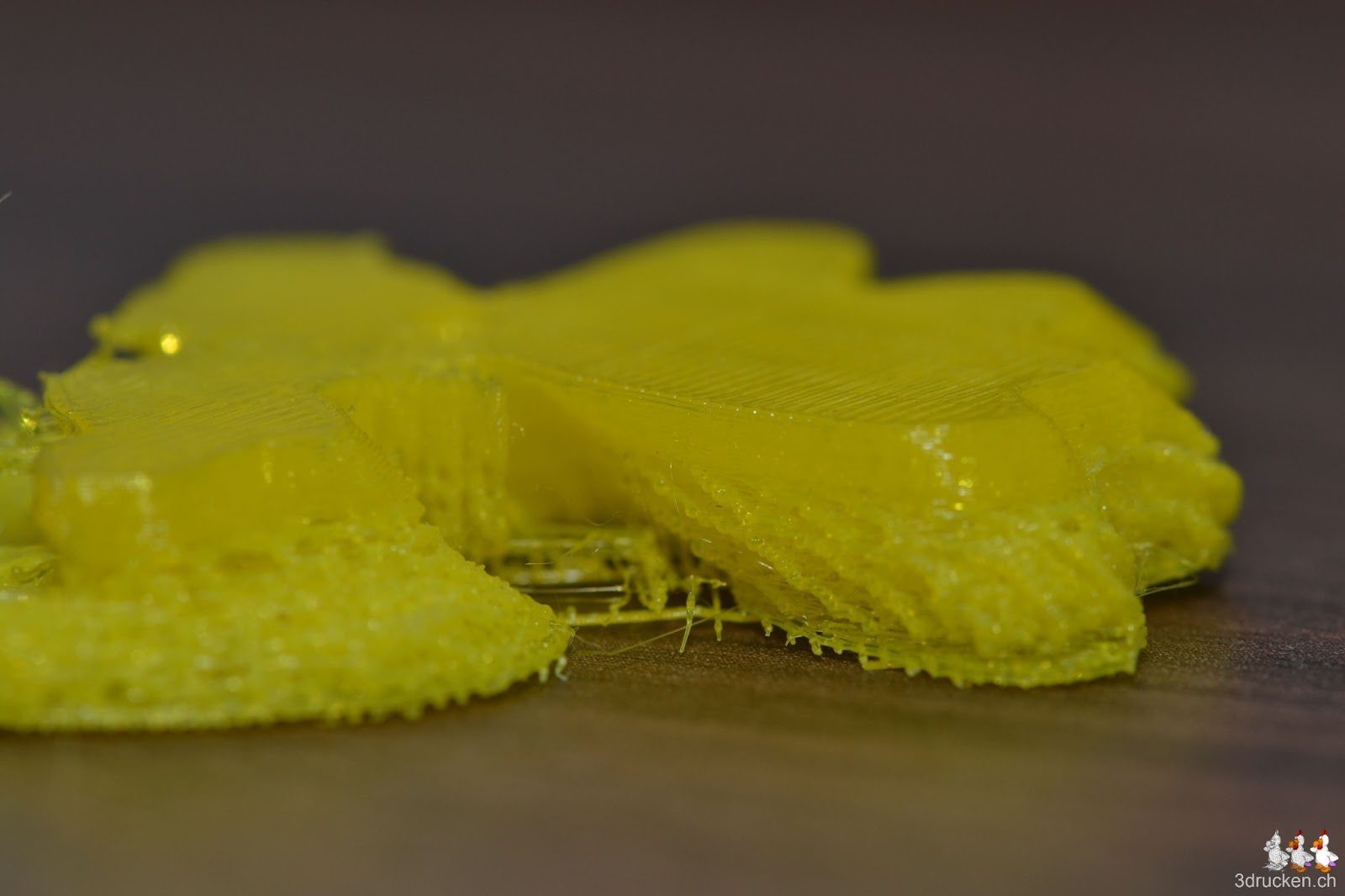 Seit wir aus den Ferien zurück sind, in denen der Ultimaker zwei Wochen alleine zuhause rumstand, beobachten wir ähnliche Probleme mit dem Materialfluss, die wir schon an unserem ersten Bausatz im Büro festgestellt haben. Bei den sonst fürs Drucken von PLA verwendeten 220° C kommt das Material nach kurzer Zeit nur noch tröpfchenweise aus der Düse. Erhöhen wir die Temperatur auf 240° C sieht alles wieder ganz normal aus. Auf dem Foto mit dem gelben Objekt ist der Unterschied zu erkennen.