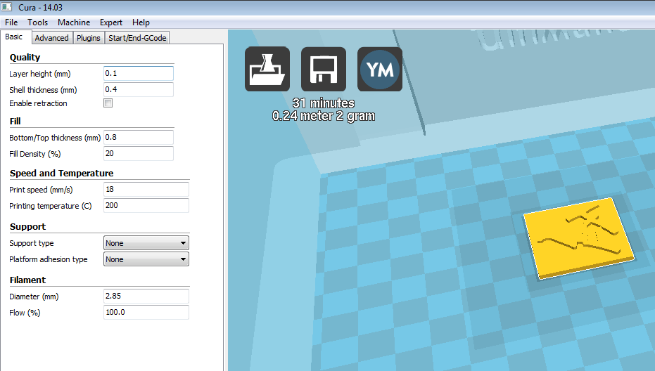 Damit die Stempel innert nützlicher Frist fertig sein werden, haben wir die Druckeinstellungen in Cura noch ein wenig optimiert. Die druckbare Geschwindigkeit ist jedoch durch das Soft PLA begrenzt. Die untenstehenden Einstellungen haben sich nun über die ersten Drucke bewährt und die Druckzeit konnte auf unter 40min gesenkt werden.