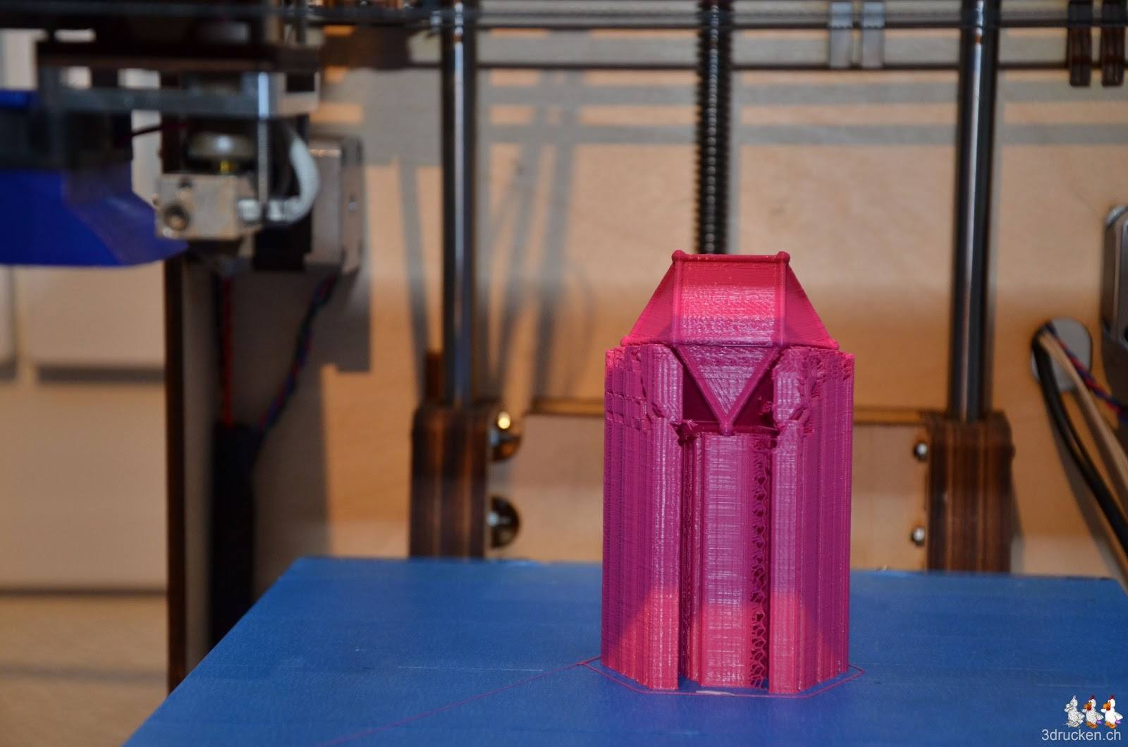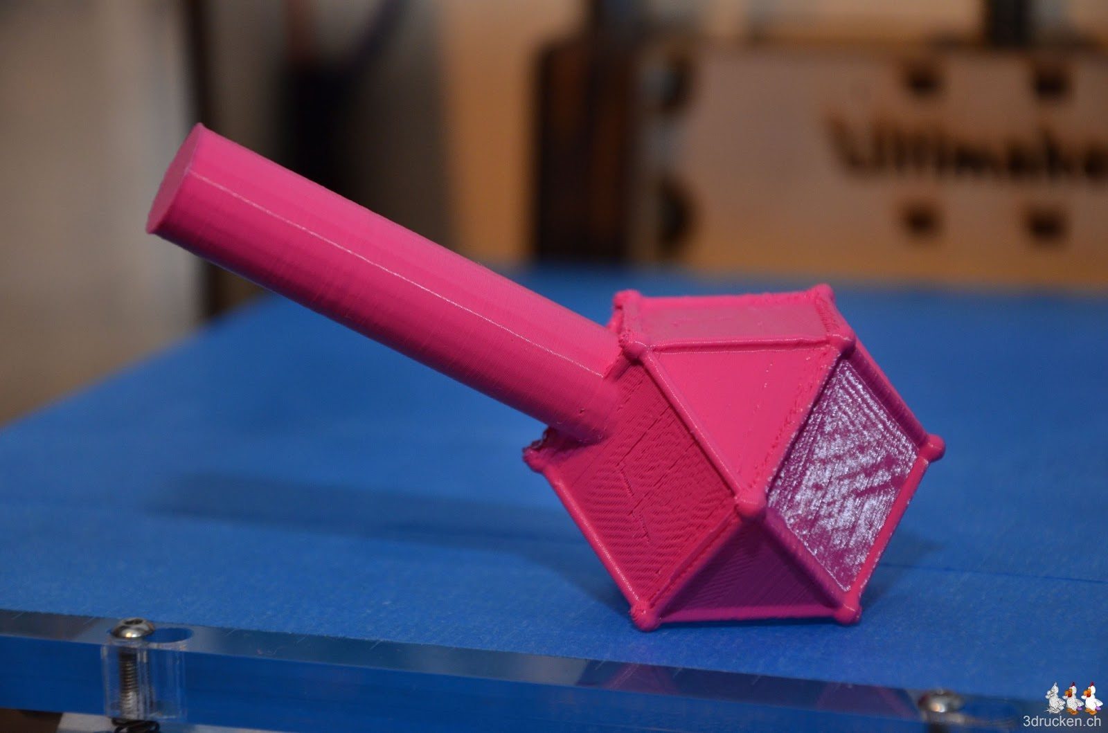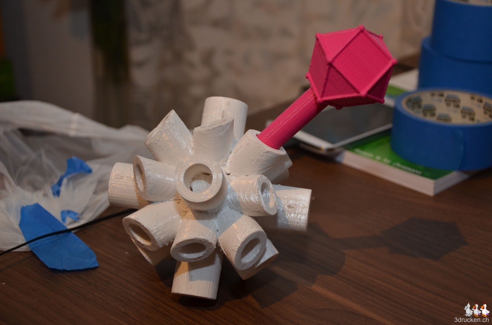 Über Nacht haben wir einen Kuboktaeder für The Gem gedruckt. Der Kuboktaeder gehört zu den 13 Archimedischen Körpern, seine Oberfläche besteht aus 6 Quadraten und 8 regelmässigen Dreiecken. Die Druckzeit auf dem Ultimaker betrug 4 h 53 min, mehrheitlich wegen dem vielen Support, der sich allerdings sehr schön vom Objekt lösen liess. Wir haben einen Abstand von 1 mm zwischen Support und Objekt eingestellt, das scheint sich zu bewähren.