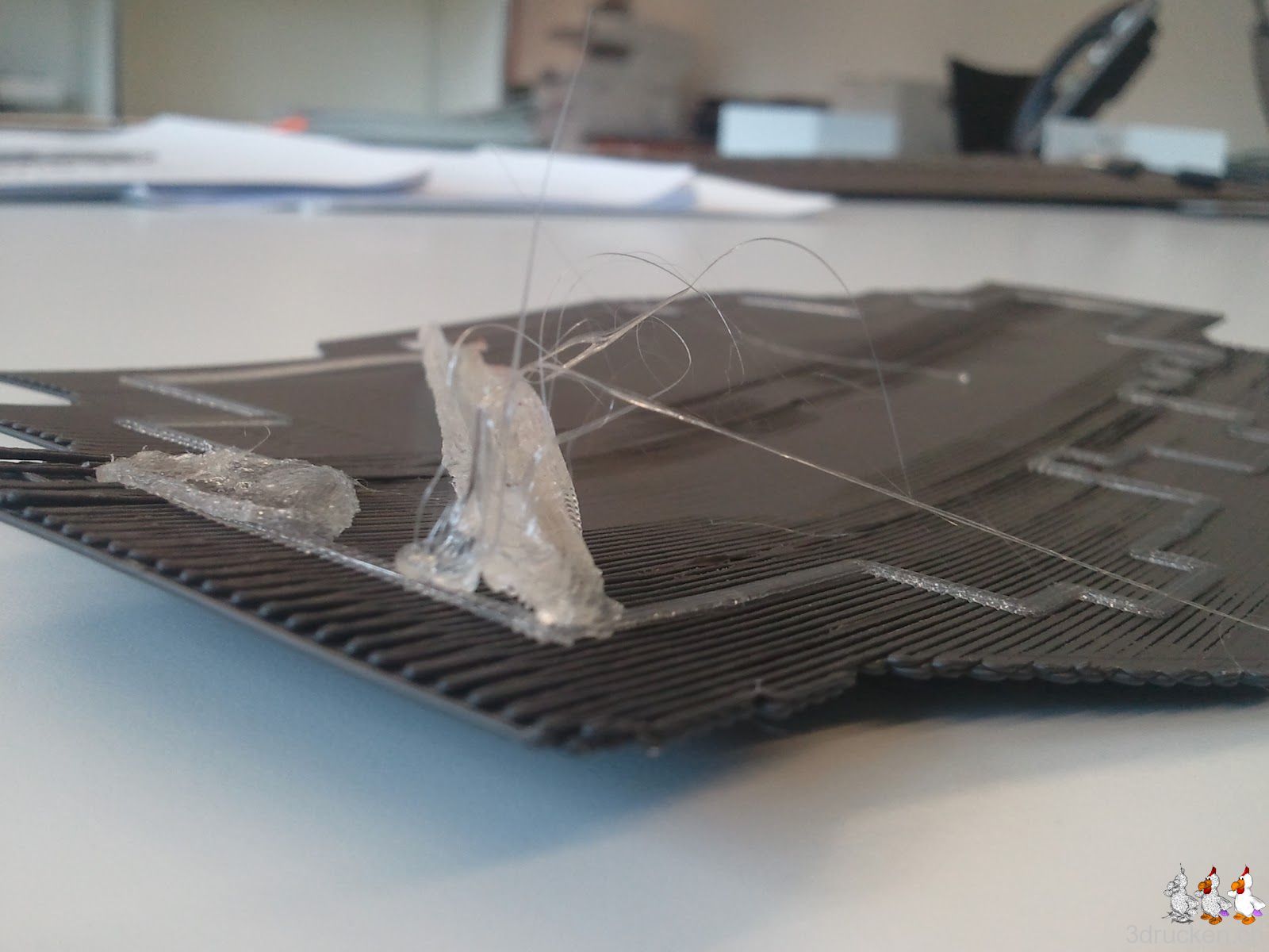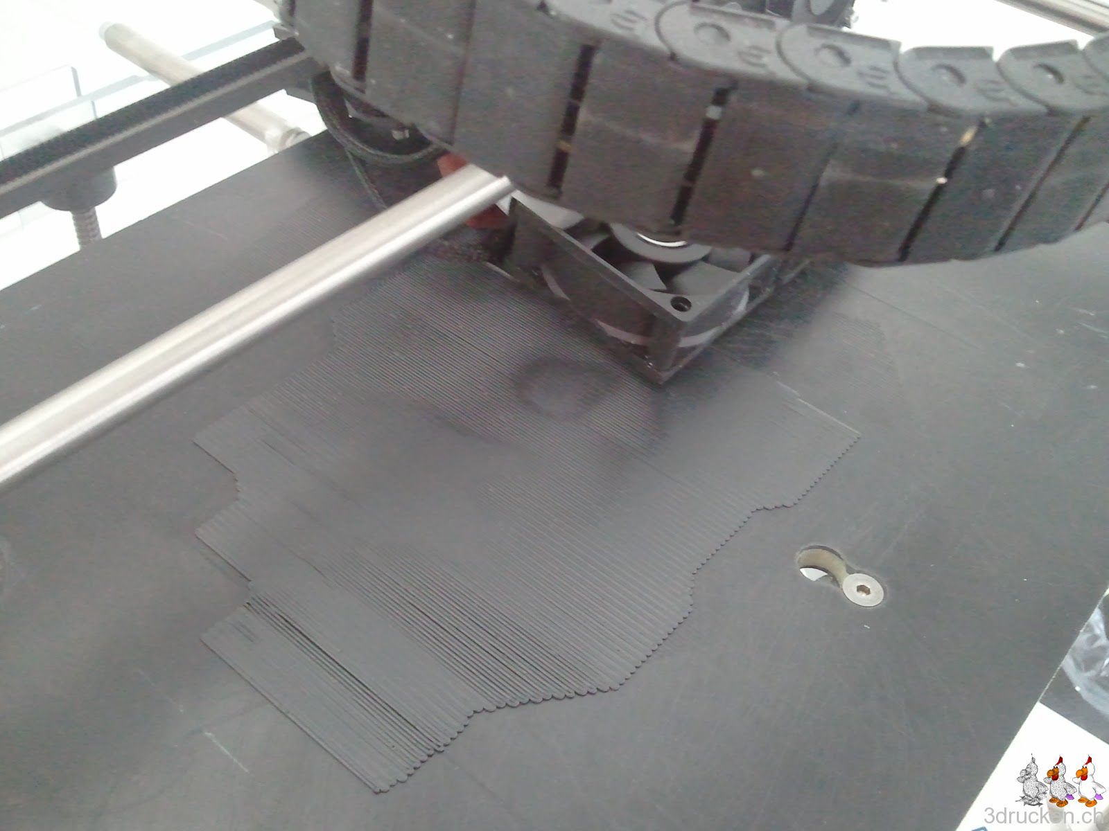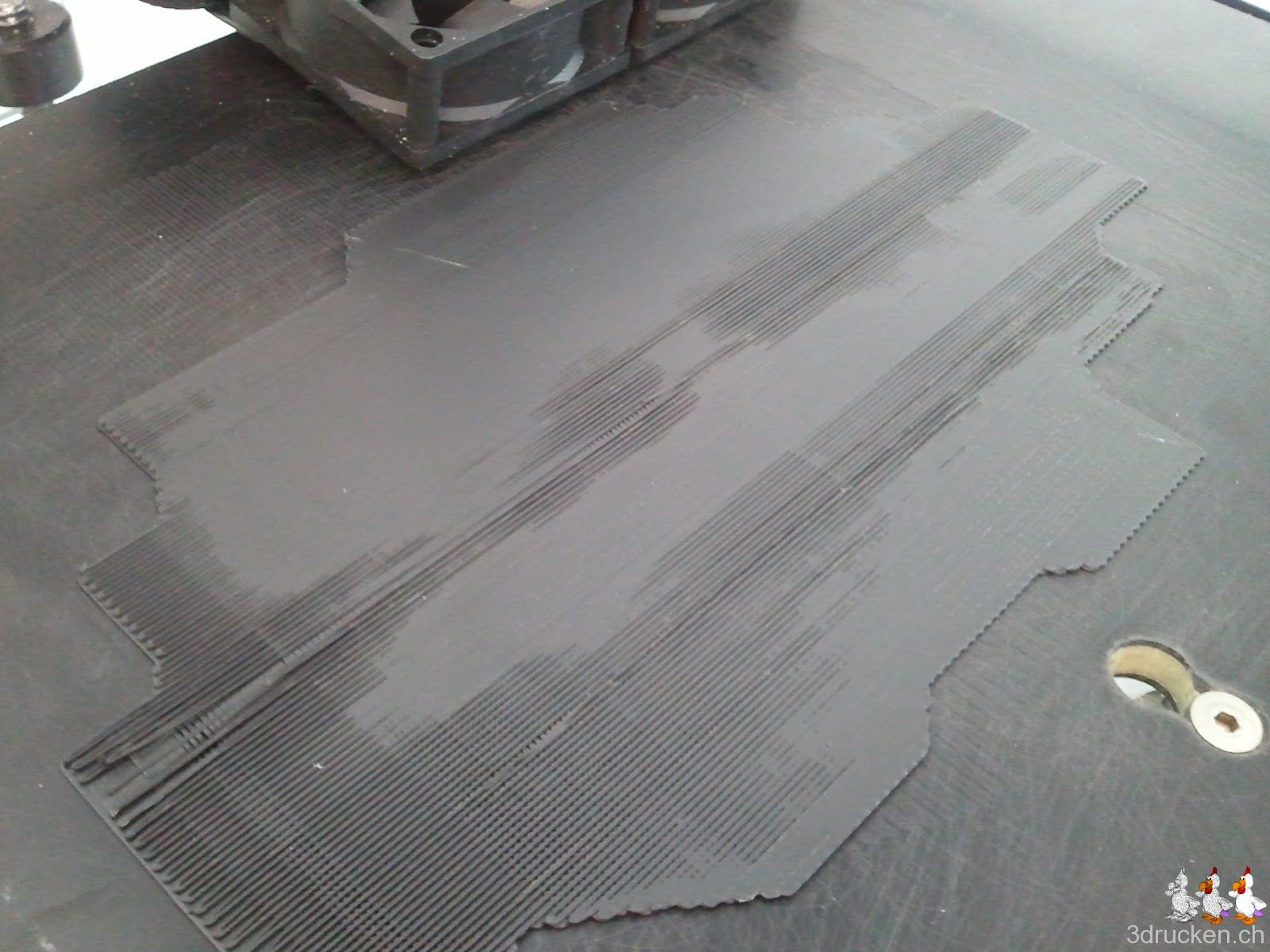 Fazit: Schrott, und zwar von Anfang bis Abbruch… es scheint so, als ob Axon 2 beim Slicen ziemlichen Mist gemacht hat, denn trotz 0.125 mm Layer, hat der Drucker 67 RPM Vorschub gemacht für das PLA. Sieht so aus, als ob das bisschen viel war… zugegeben, das Raft zeigt bereits diverse Dellen im Drucktisch. Die scheinen aber zumindest beim BfB 3DTouch ziemlich normal zu sein.