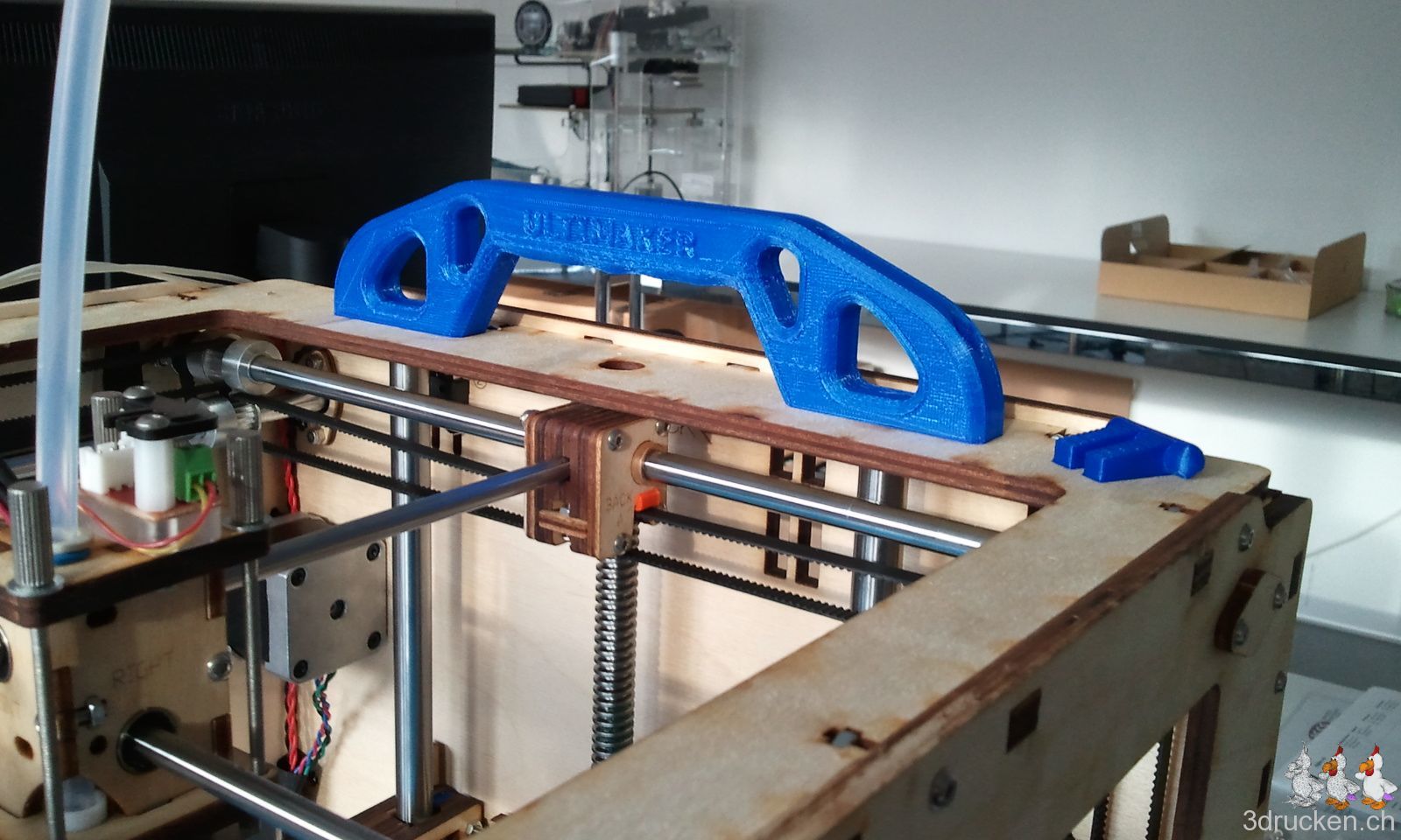 Der zweitletzte Schritt in der Montage eines Ultimakers umfasst den Extruder-Mechanismus. Dafür benötigen wir nun wiederum 2 selber gedruckte Teile. Zum einen das grosse Zahnrad, zum anderen den Feststell-Mechanismus, damit der angehängte Extruder kein Spiel hat. Der Druckauftrag musste aber warten, da wir zuerst den Tragegriff ausdrucken wollten. Wir haben es tatsächlich mit dem Anbringen des Tragegriffs geschafft, das verzogene Top an unserem Drucker etwas zu begradigen. Nun sollte genügend Platz zwischen Top und Schliessblock sein.
