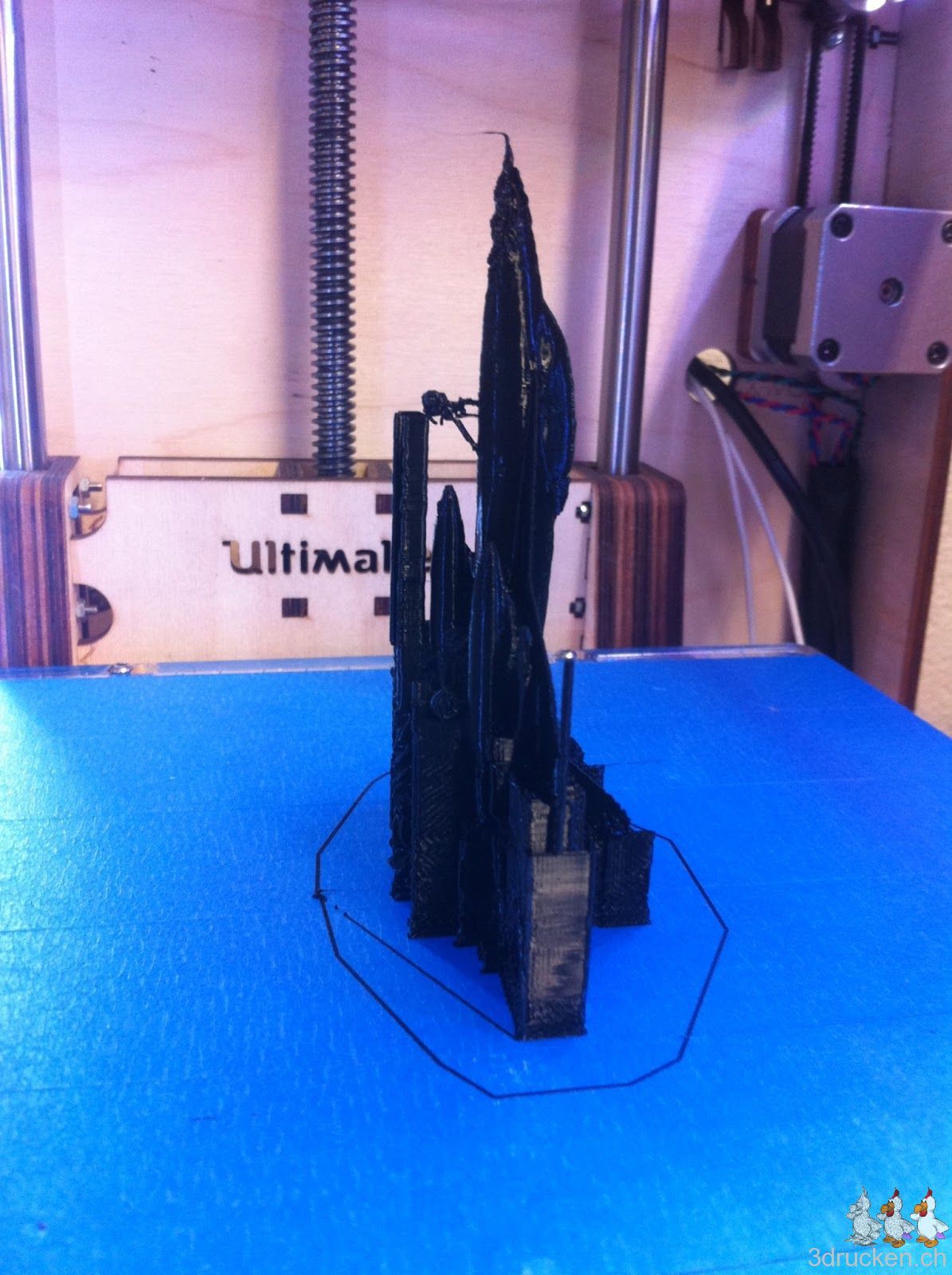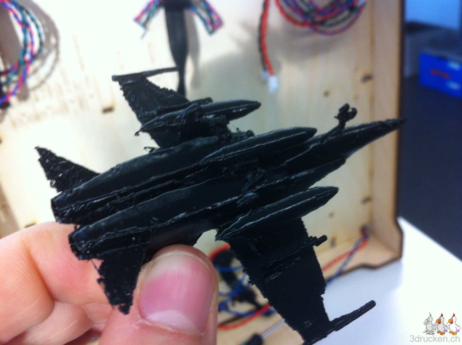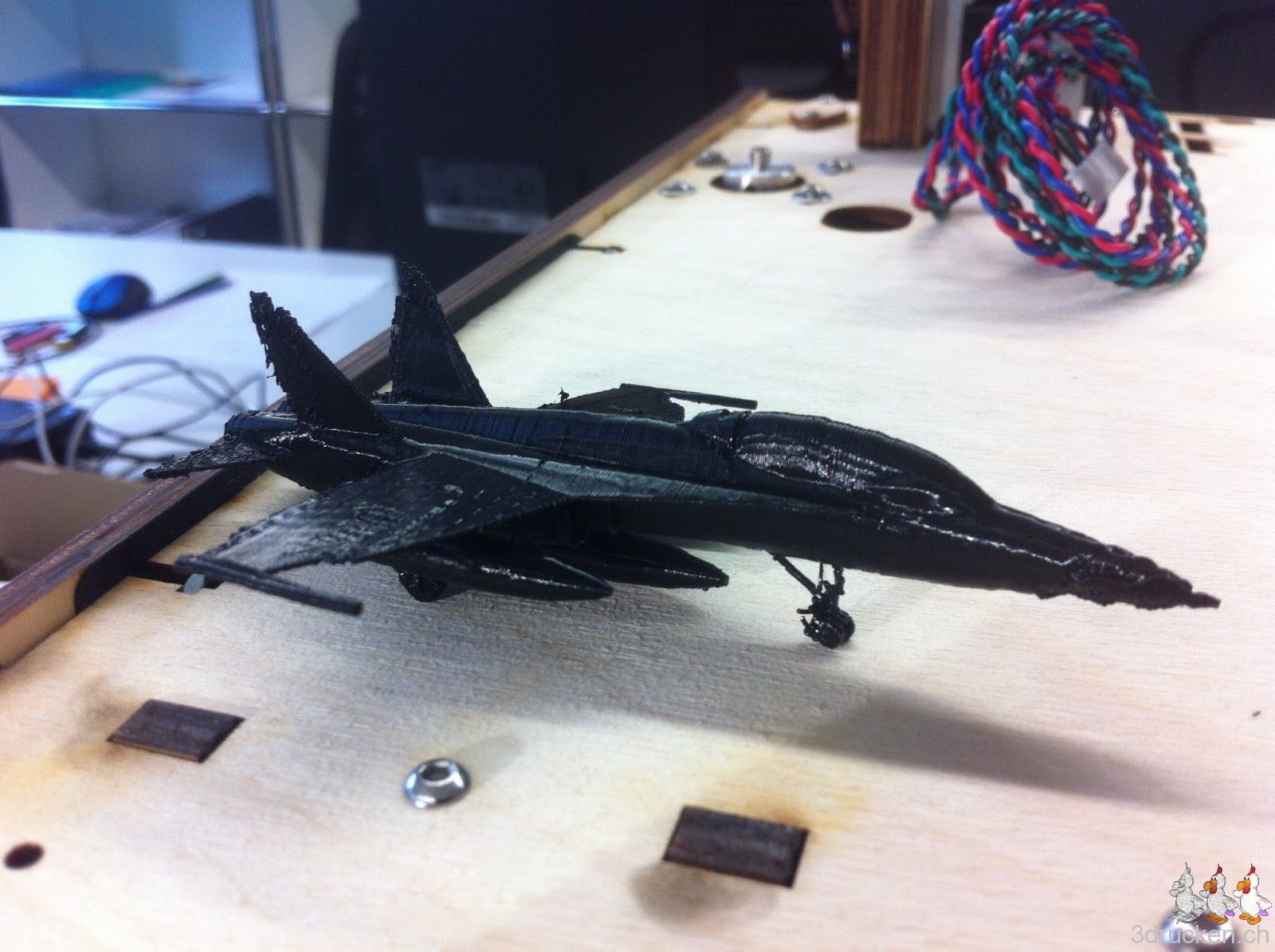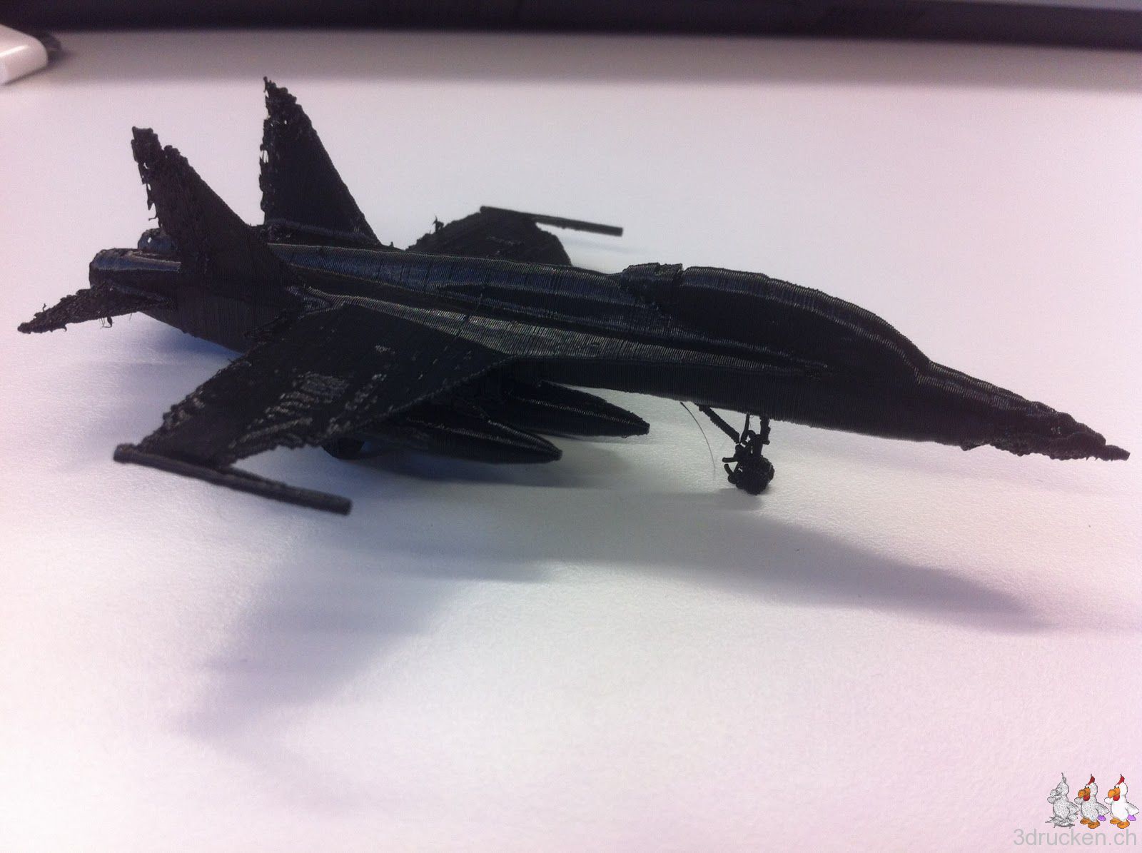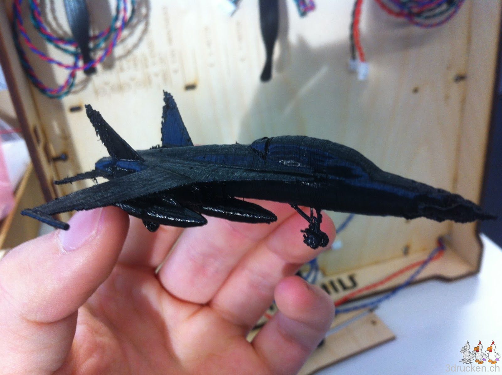 In der Nacht druckte der Ultimaker noch einmal das Kampf-Flugzeug aus. Der Druck kam bedeutend besser heraus. Einzige Änderungen: Temperaturerhöhung von 210 auf 215 °C und Flusserhöhung von 100 auf 105 %.