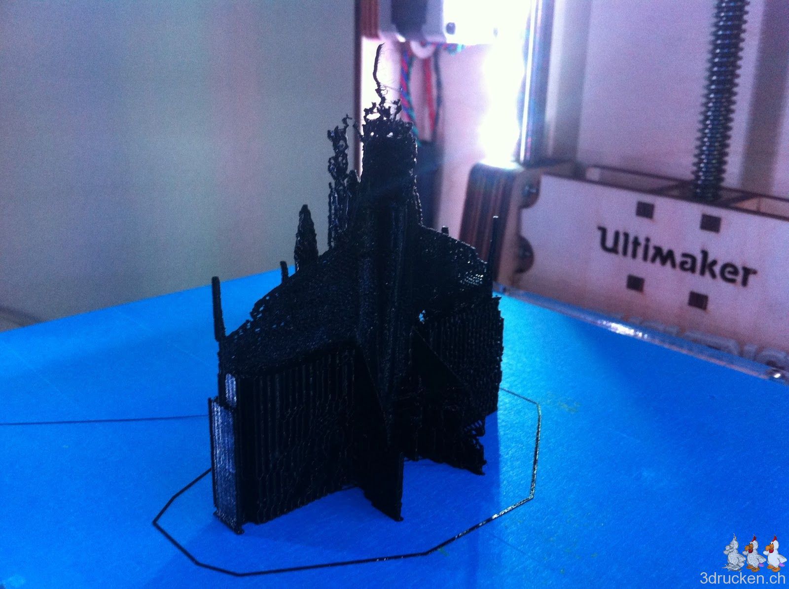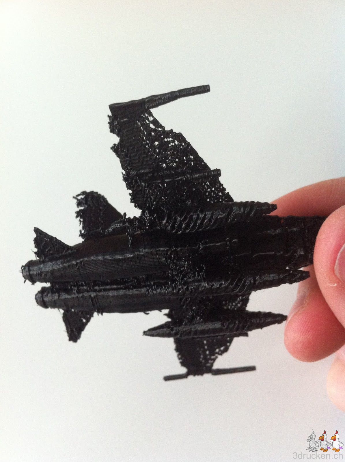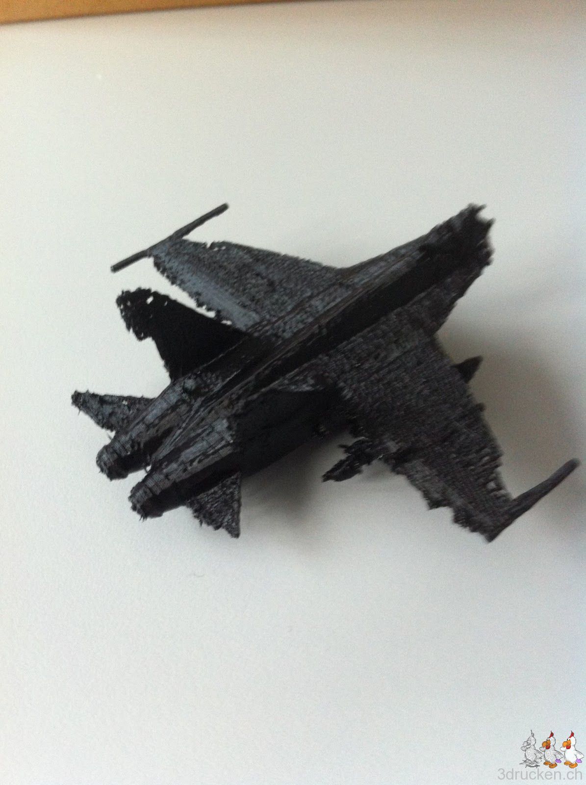 Über das Wochenende versuchten wir einen F/A-18 zu drucken. Das Ergebnis war nicht überragend. Der Drucker hatte zwischendurch Mühe mit dem Fluss. Vielleicht hatte auch der Support einen Einfluss darauf. Am Ende brach der Material-Fluss ganz ab. Es hatte sich ein so hartnäckiger Pfropfen gebildet, dass der Druck-Kopf und das Extruder-System demontiert werden mussten.