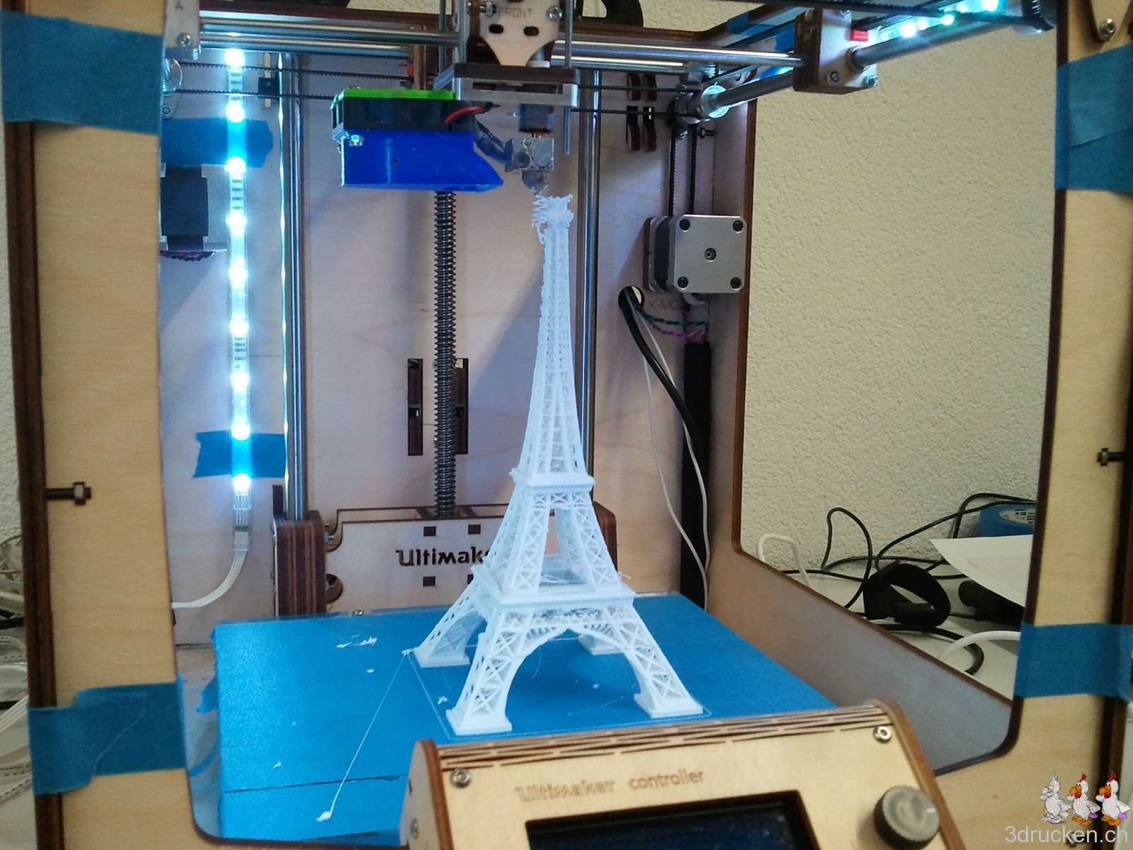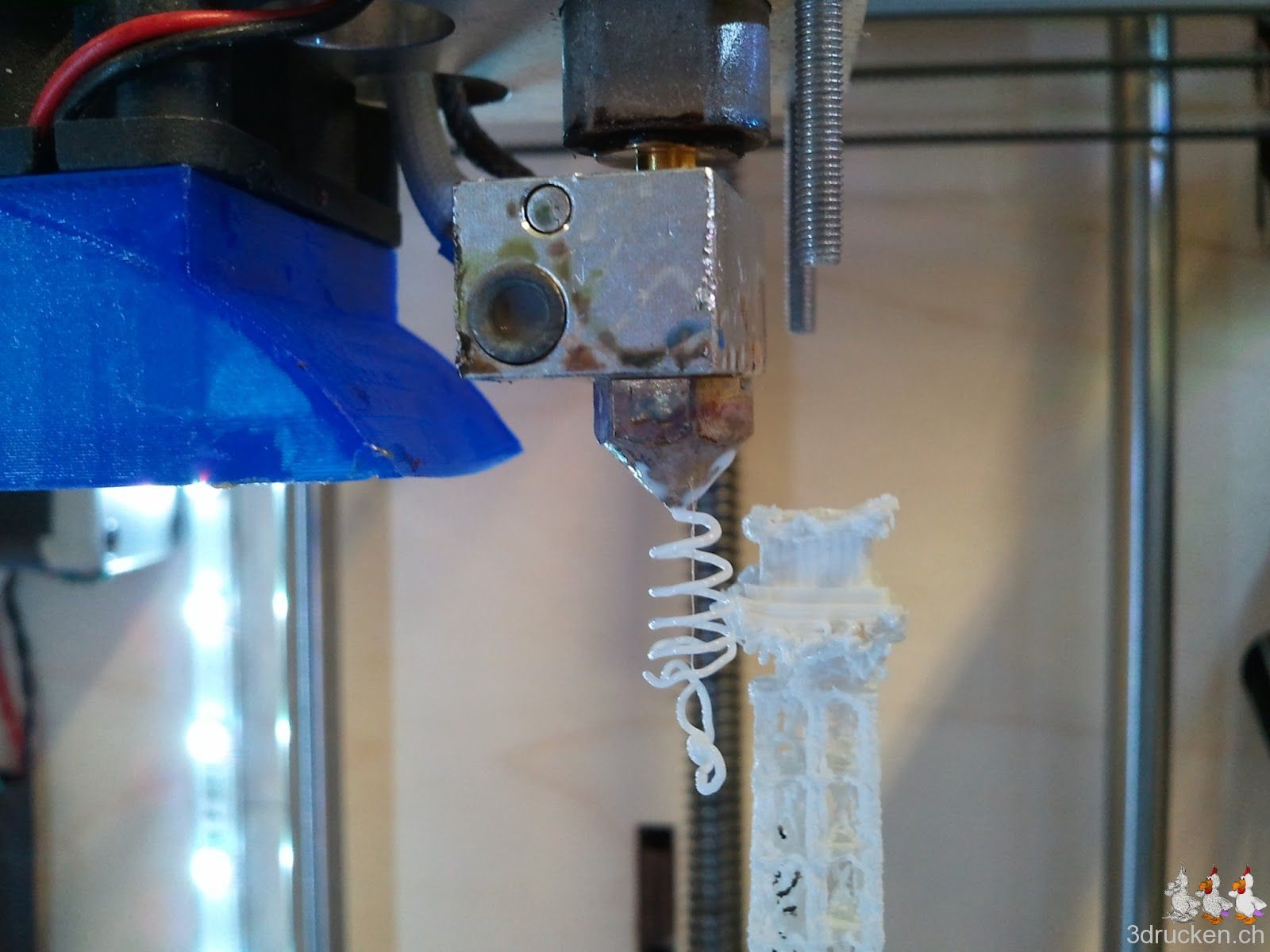 Wir hatten in Cura 220 mm als maximale Bauhöhe beim Ultimaker angegeben. Leider lassen sich mit unserem Drucker aber nur 205 mm wirklich drucken. Resultat: Dem Eiffelturm fehlt schon wieder die Spitze.