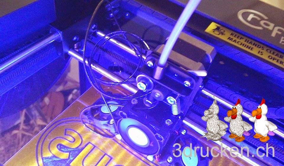 Als wir dann ein grösseres Objekt drucken wollten, machte sich die verzogene Druckplatte bemerkbar. Das Filament wurde zwischen Förderrad und Hotend hinausgedrückt, da der Widerstand zu gross war. Uns wurde von Coobx versichert, dass demnächst ein selber druckbares Teil kommen soll, welches aufs Hotend geschraubt/gesteckt wird. So sollte das dann nicht mehr passieren.