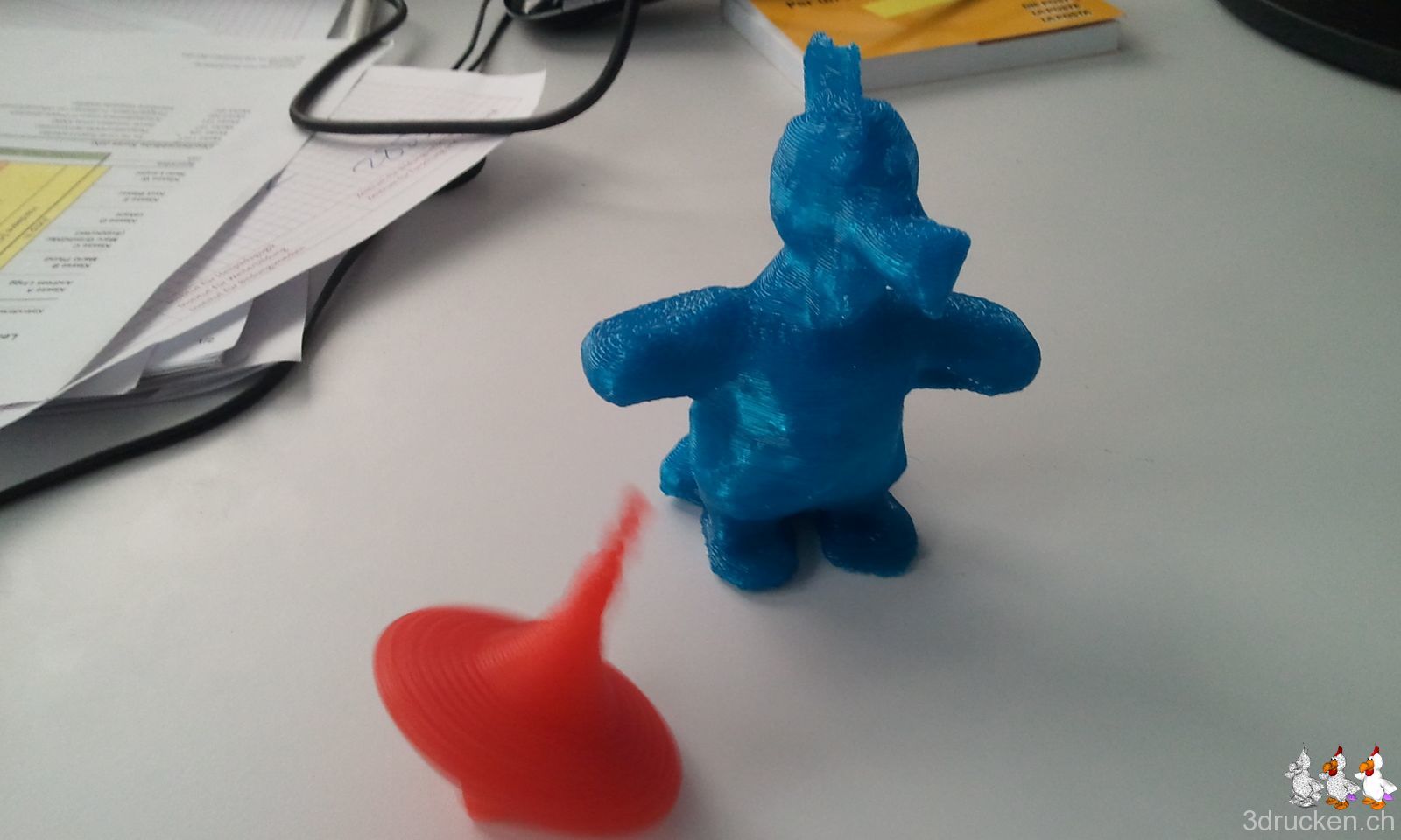 Etwas gegen die Bürolangeweile, falls denn welche aufkommen sollte: Ein oranger Kreisel, ca. 6 cm hoch. KISSlicer, die beiden Teile mit je 0.5 mm Schichten, fabberworld-PLA, 20 % Füllung, ohne Support und Raft. Druckzeit für beide Teile ca. 1 h. Sekundenkleber macht den Rest, der blaue Güggel schaut nur zu. Lasst die Spiele beginnen!
