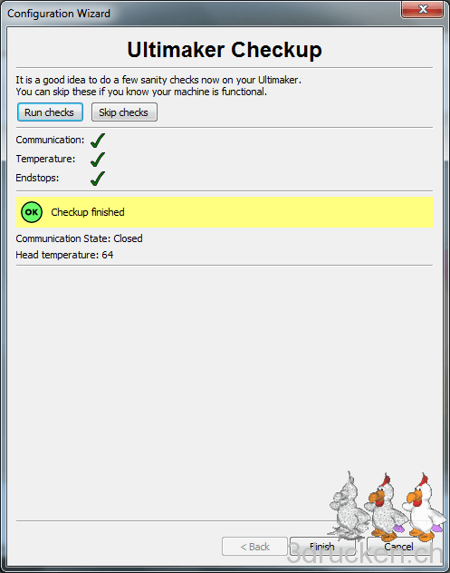 Notebook geschnappt, die aktuelle Version 13.06.4 Cura runtergeladen und installiert. Bei der Installation werden auch die benötigten Treiber mitgeliefert. Nach der Installation den Ultimaker mit dem Notebook verbinden und warten, bis die Treiber richtig erkannt wurden. Dann den First Run Wizzard von Cura durchmachen, besonders das Update der Firmware, und die Endstopps testen.