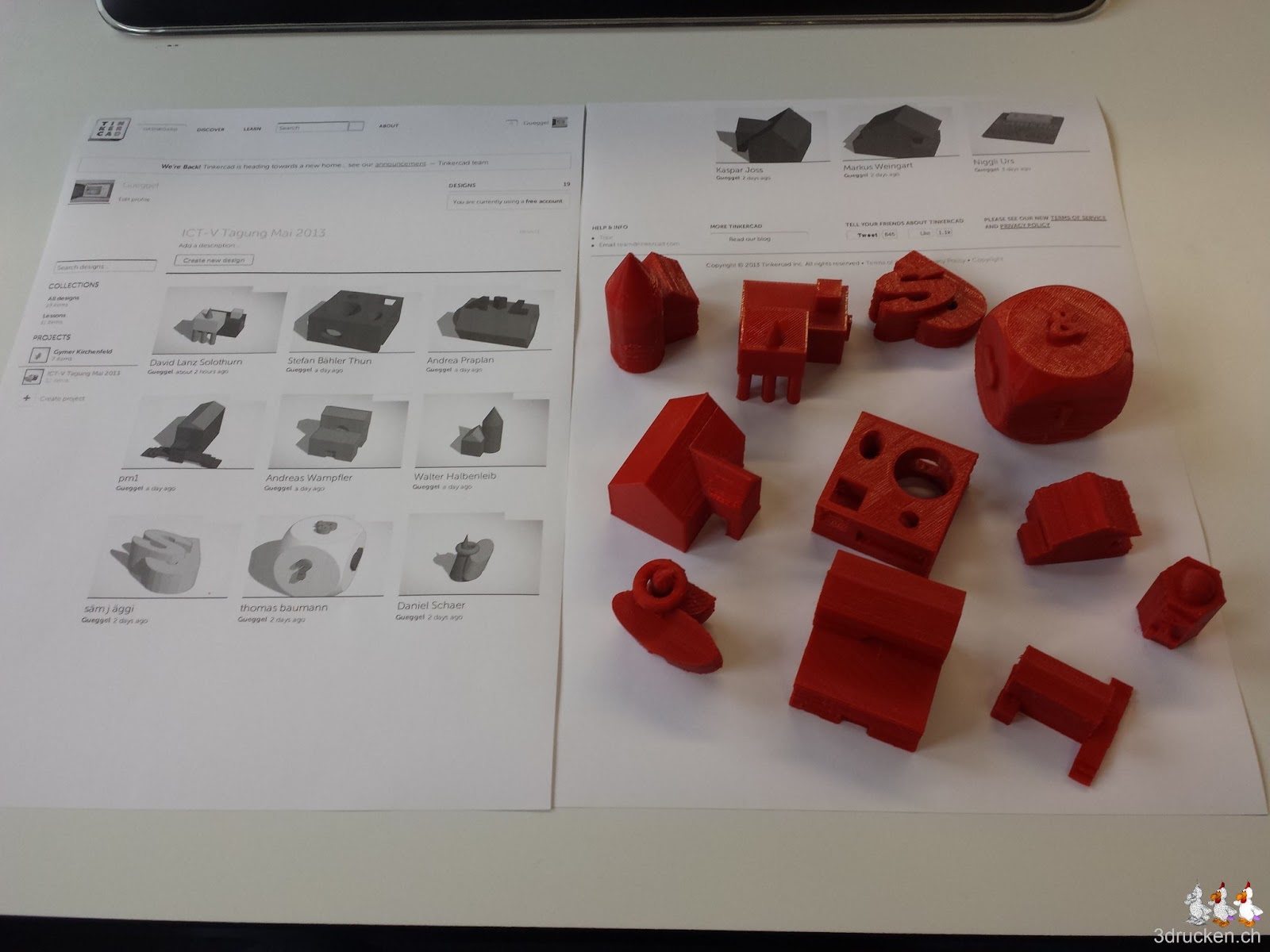 Der dienstälteste Ultimaker hielt sich mit Materialstau zurück (wir erhöhten die Temperatur um 10° auf 220° C) und druckte nun alle Gebäude des Workshops an der ICT-V Tagung aus. Anschliessend gehts jetzt ans Adressen raussuchen und per Post versenden, damit die Teilnehmerinnen und Teilnehmer stolz ihr Werk in den eigenen Händen halten können.