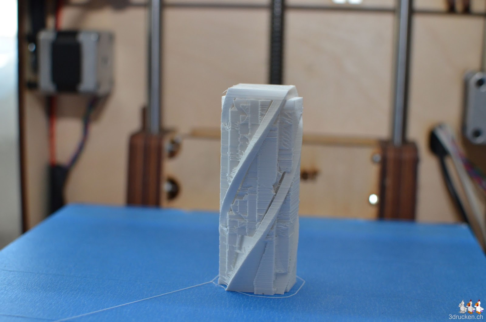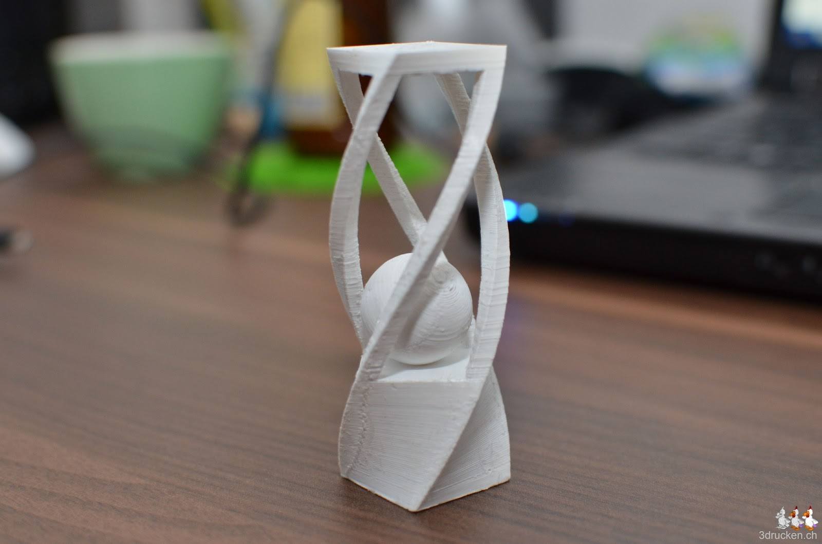 Wir drucken etwas Anschauungsmaterial für den Workshop an der ICT-V Tagung von nächstem Samstag. Dazu gehört das Spiel mit dem gefangenen Ball. Geslicet mit Cura 13.04 in 0.2 mm Schichten, 10 % Füllung und Full Support. Gedruckt aus weissem SwissRepRap-PLA. Den Support danach mit der Pinzette und dem Taschenmesser entfernt.