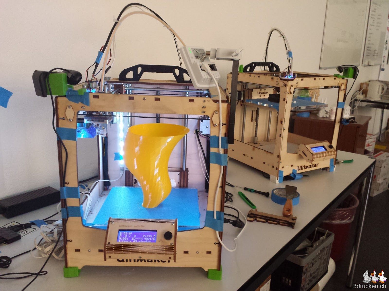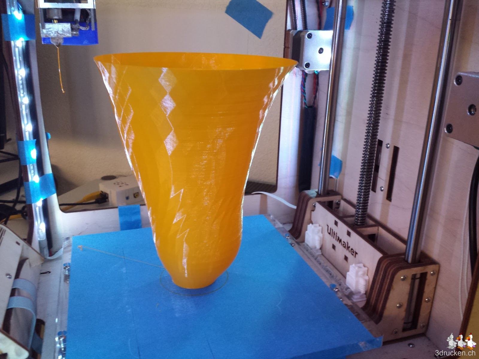 Den grossen gelben Tornado haben wir heute zur Abkühlung in maximaler Höhe auf dem Ultimaker gedruckt. Schön langsam bei 50mm/s und 240°C, da nach dem neu Anstecken des Stromkabels unser Drucker wieder 20°C mehr anzeigt als er wirklich heizt. Macht nichts, die Raumtemperatur im Büro beträgt schon so über 30°C. Fertig war der Tornado nach 1h 49min.