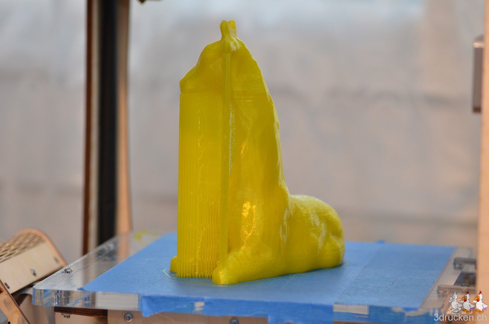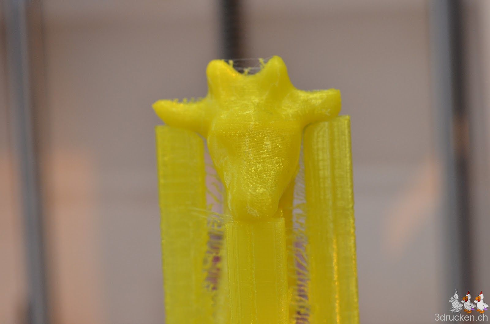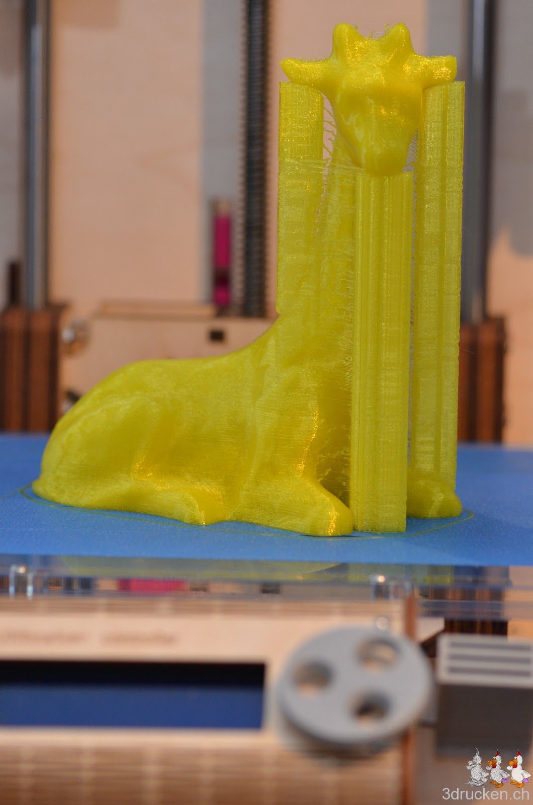 So, nach gründlicher Reinigung des Hotends, der Tube und dem Extruder-Mechanismus, hat der Ultimaker nun Candice the Giraffe auf 200 % skaliert erfolgreich mit gelbem Fabberworld-PLA gedruckt. Geslicet mit Cura 12.10 RC4, 0.2 mm Schichten, 20 % Füllung mit Support. Temperatur 230° C, um Staus aus dem Weg zu gehen. Druckzeit 10 h 16 min. Höhe ca. 16 cm.