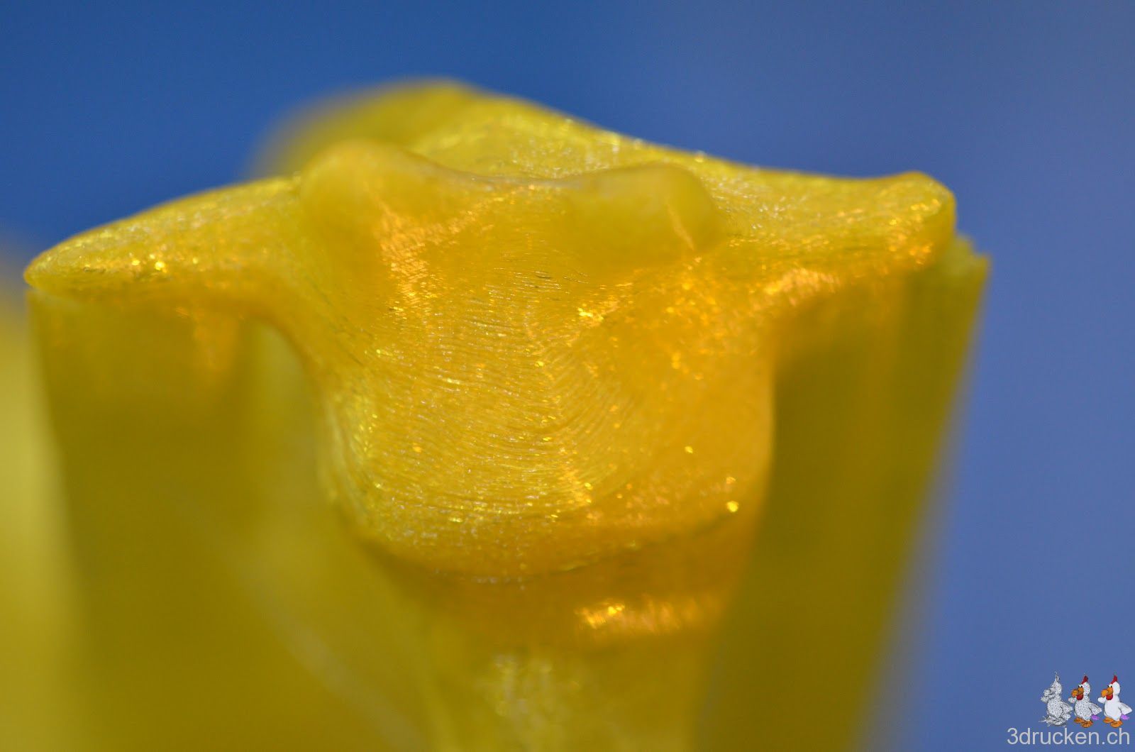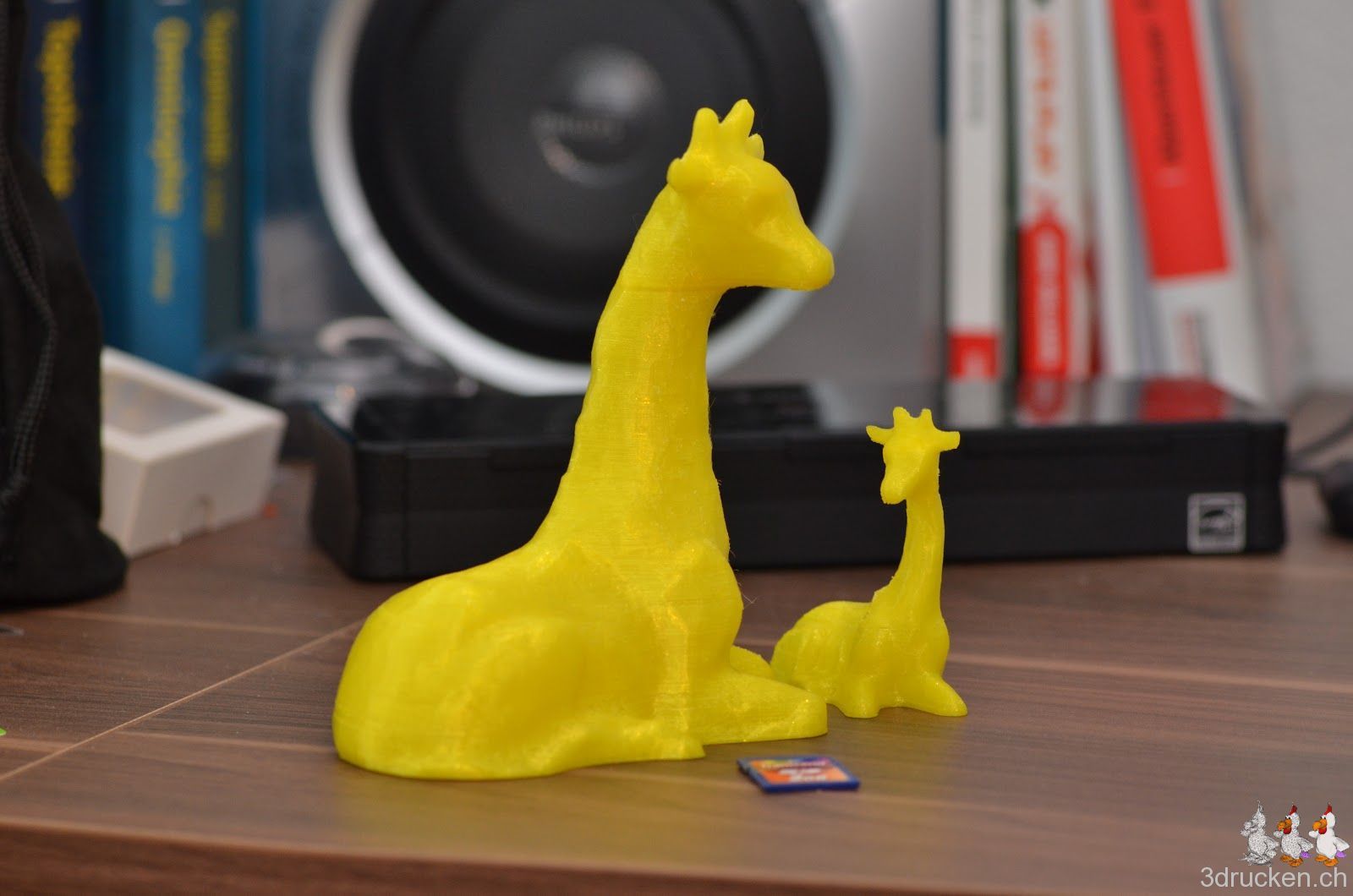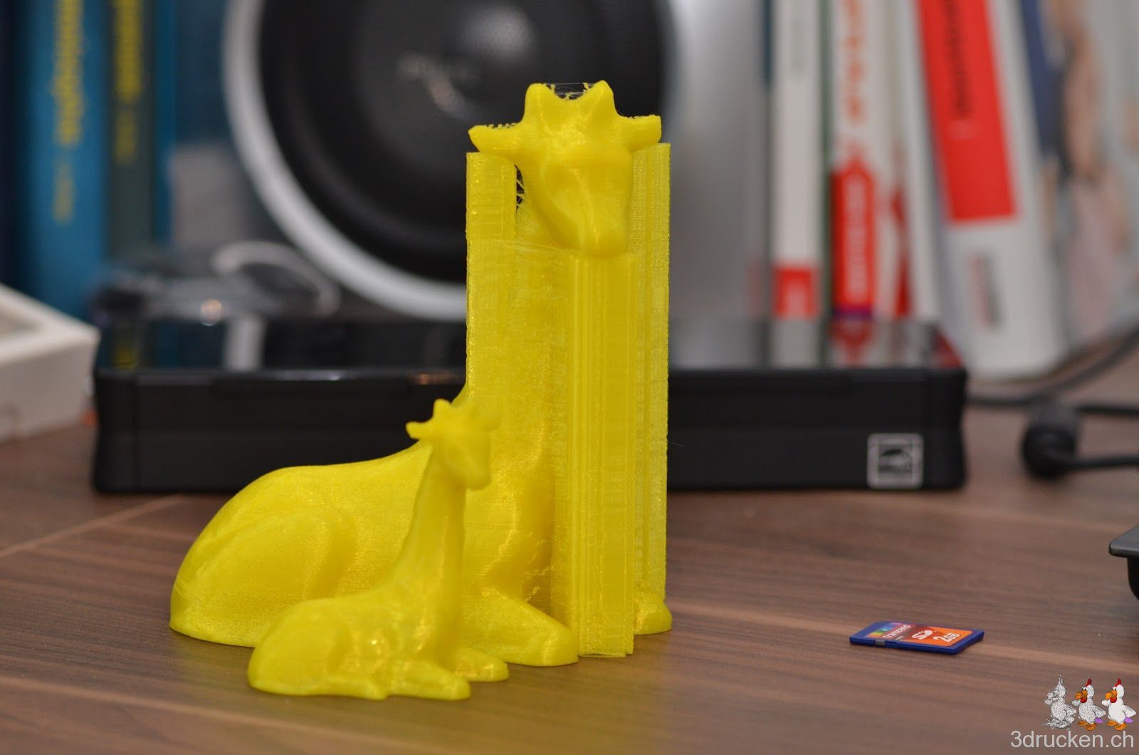 So, nach gründlicher Reinigung des Hotends, der Tube und dem Extruder-Mechanismus, hat der Ultimaker nun Candice the Giraffe auf 200 % skaliert erfolgreich mit gelbem Fabberworld-PLA gedruckt. Geslicet mit Cura 12.10 RC4, 0.2 mm Schichten, 20 % Füllung mit Support. Temperatur 230° C, um Staus aus dem Weg zu gehen. Druckzeit 10 h 16 min. Höhe ca. 16 cm.