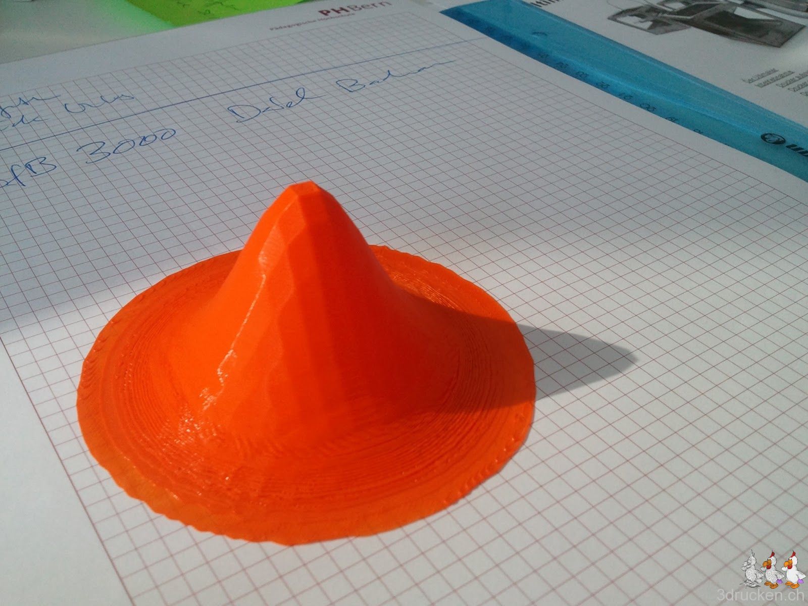 Der BfB 3DTouch hatte sich mit der Glocke abgemüht, mit dem Ultimaker klappts problemlos. Auf 50 % skaliert, 0 % Füllung, 0.2 mm Schichten bei 50 mm/s aus orangem Ultimaker-PLA mit 215° C in 1 h 24 min gedruckt.