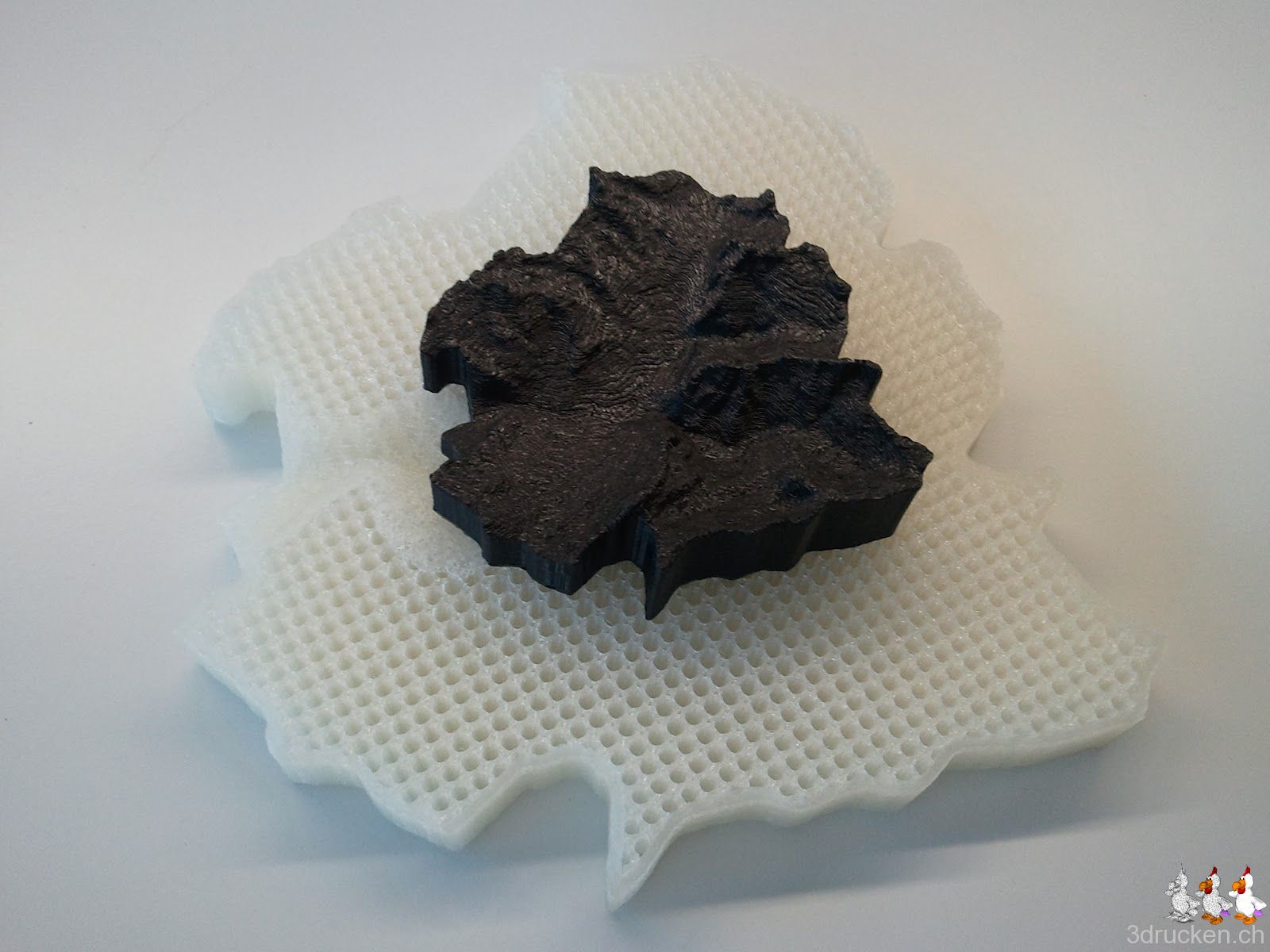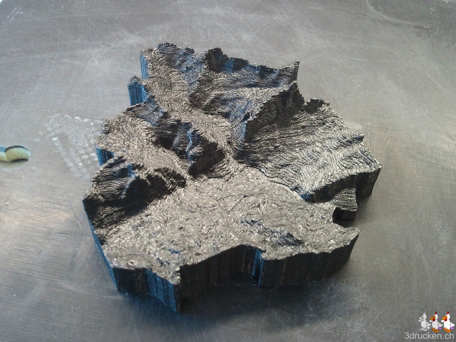Damit konnten wir nun in 4 h 22 min das Relief von Grindelwald by gluetolf, auf 50 % skaliert und mit KISSlicer ohne Raft in 0.25 mm Schichten mit 20 % Füllung geslicet, erfolgreich ausdrucken.